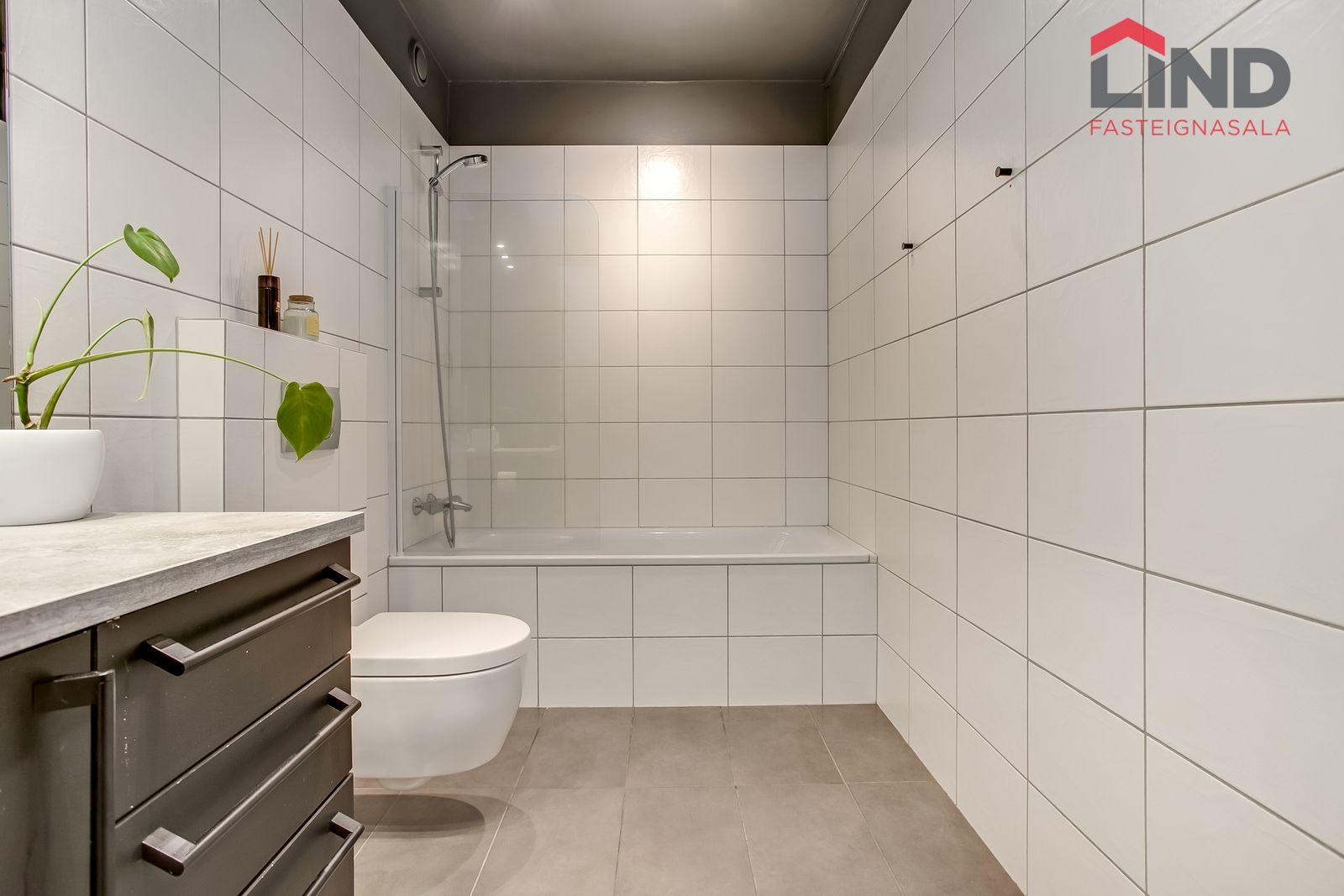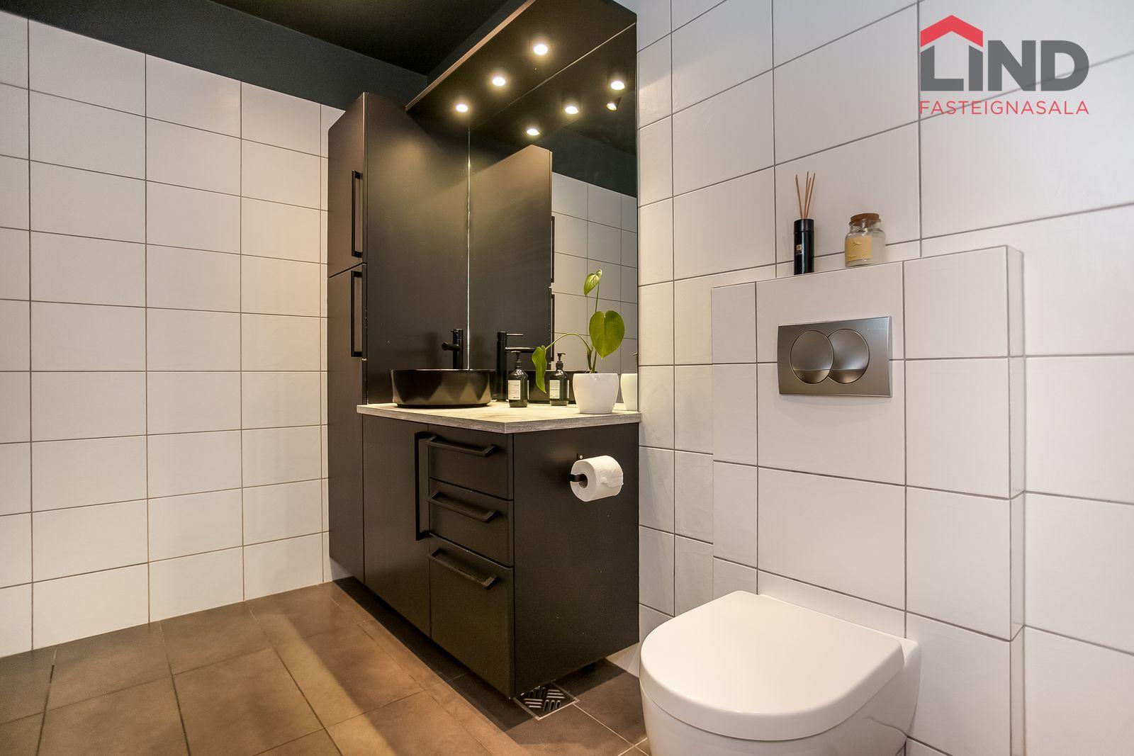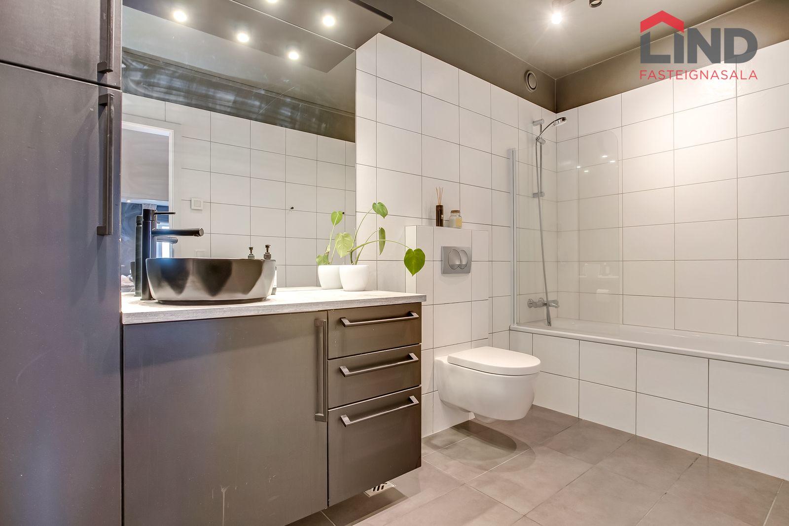Baðherbergi er flísalagt í hólf og gólf, flísalögð sturta með nýlegum blöndunartækjum, nýlegt upphengt salerni og góð innrétting með góðu skápaplássi.