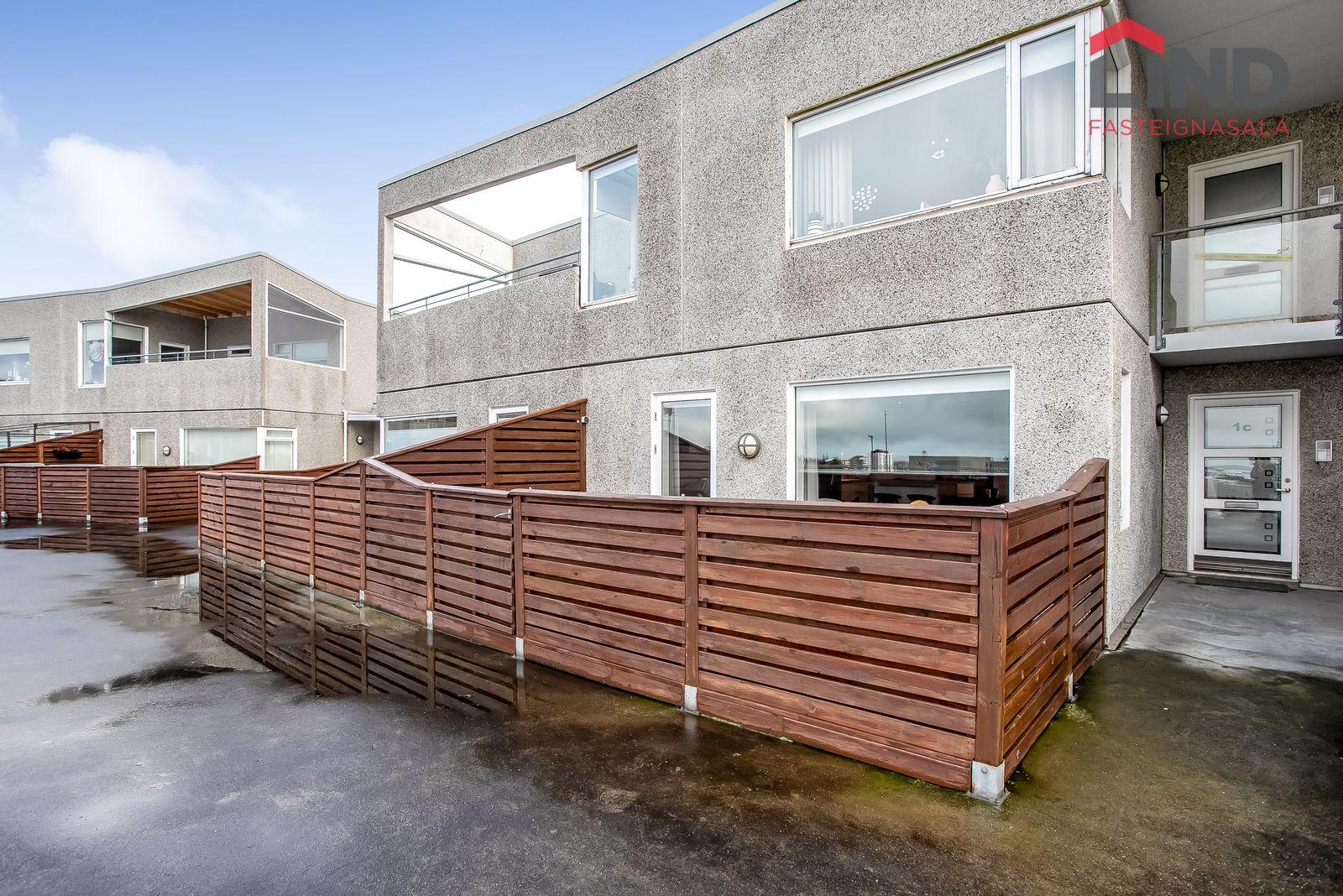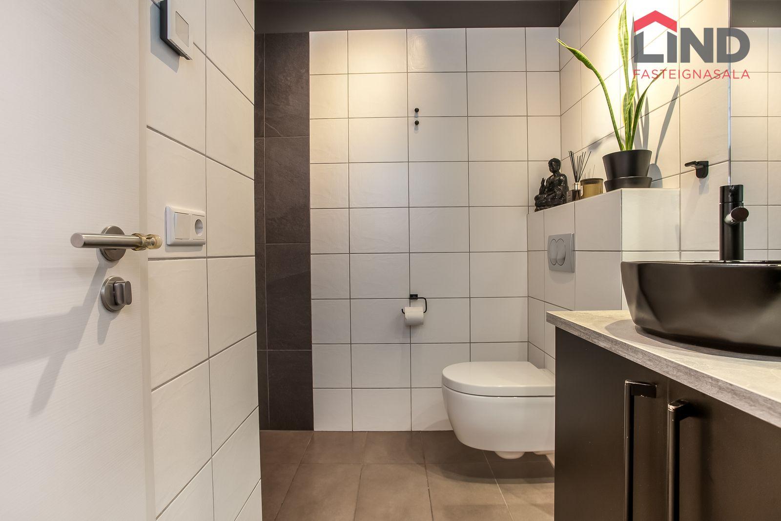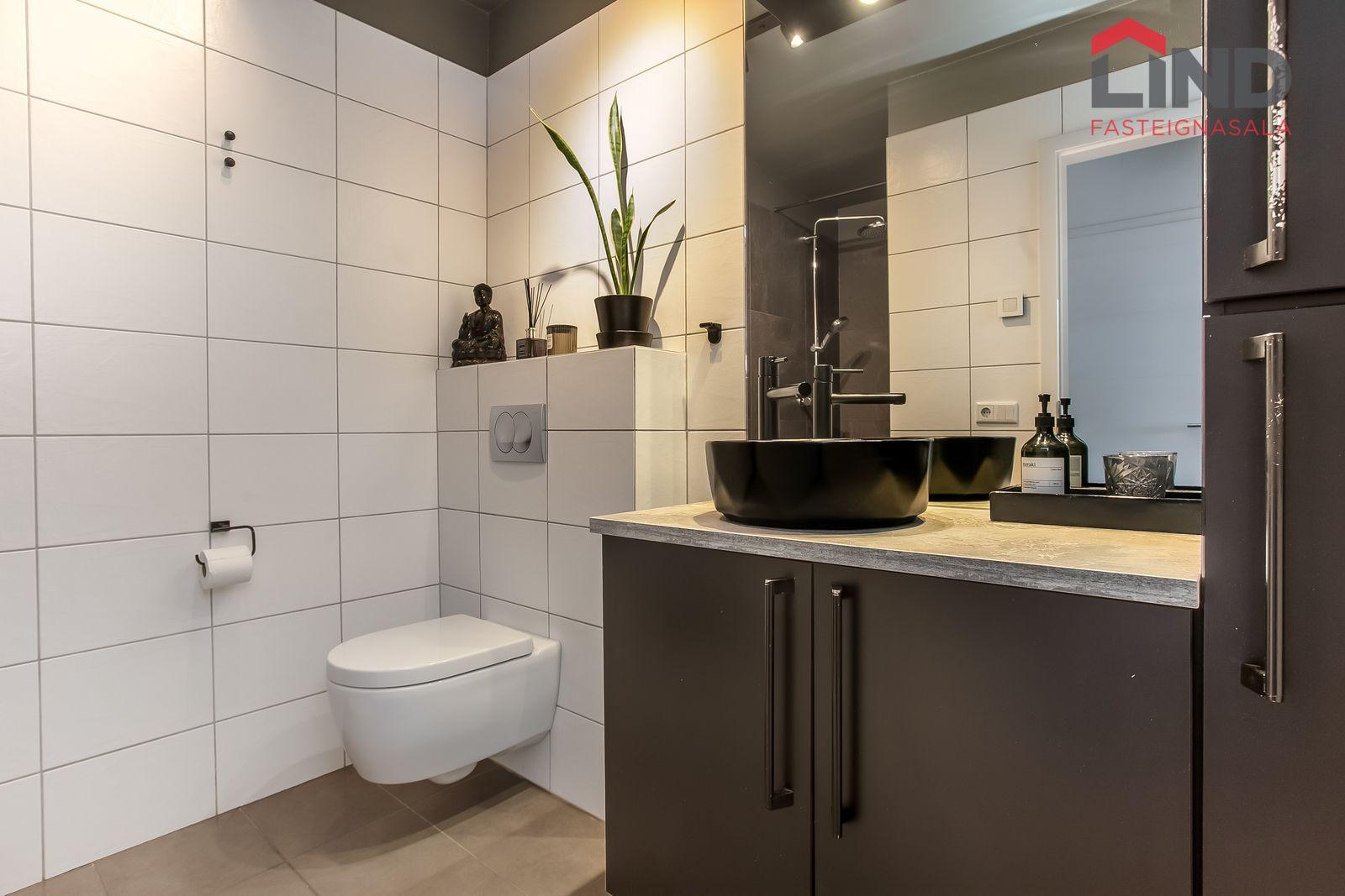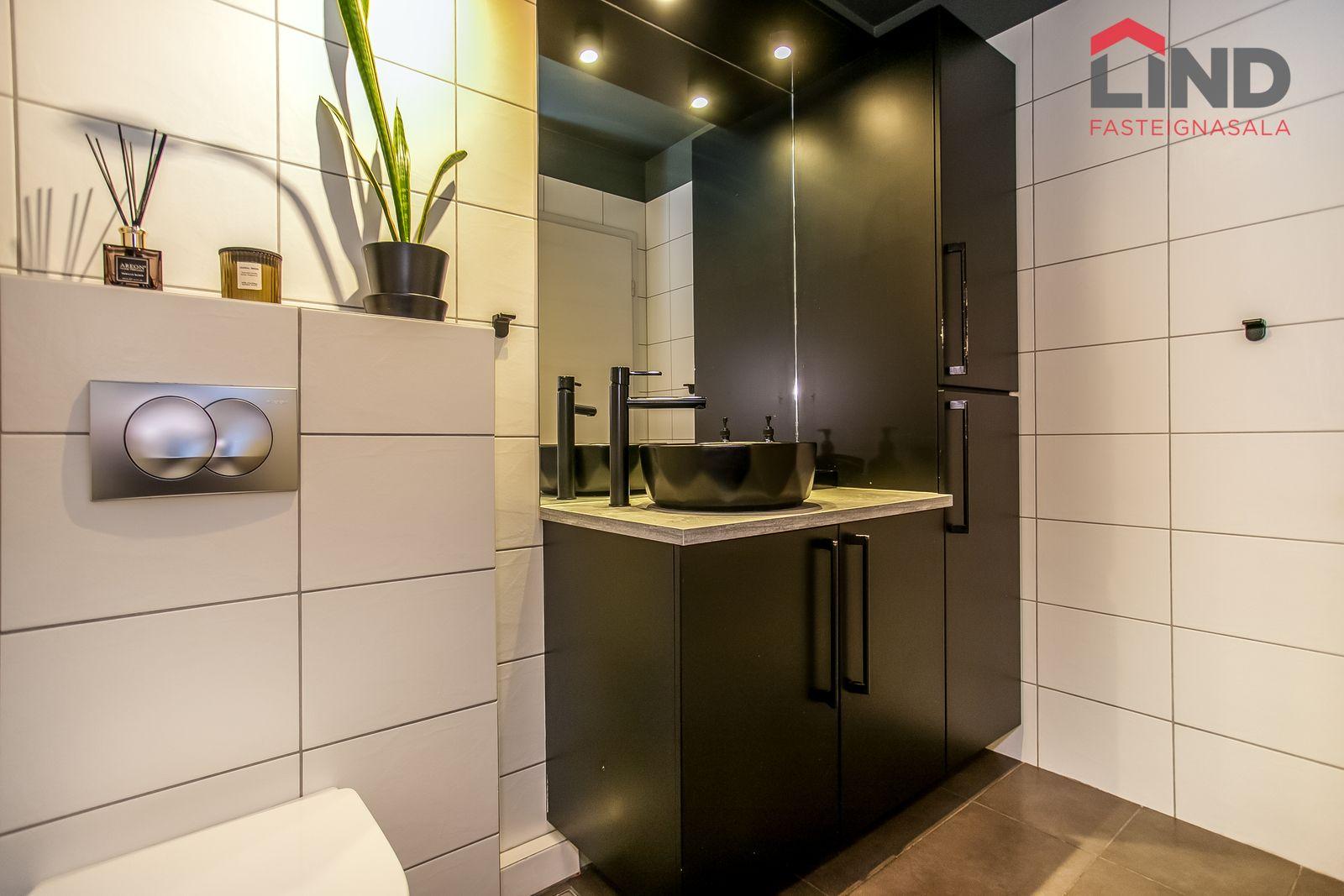Baðherbergi er flísalagt í hólf og gólf, flísalögð sturta með nýlegum blöndunartækjum, nýlegt upphengt salerni og góð innrétting með góðu skápaplássi.