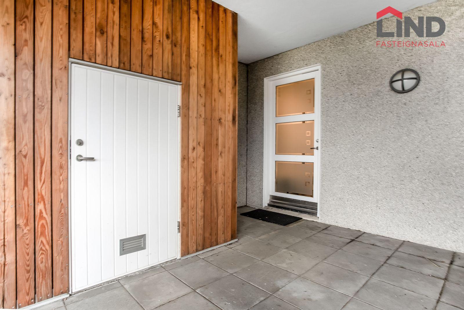 Neðri hæð:Stigi niður hefur parket og stálhandrið með gleri.Forstofa með flísalögðu gólfi og góðan fataskáp. Frá forstofu er gengið inn í geymslu undir stiga.