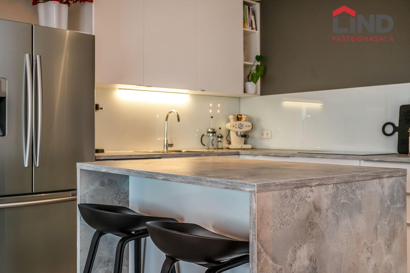 Eldhús með fallegri innréttingu með gleri á milli skápa, nýlegt span helluborð, tvöfaldur ísskápur og bakaraofn, góð eyja með miklu geymluplássi, parket á gólfi.