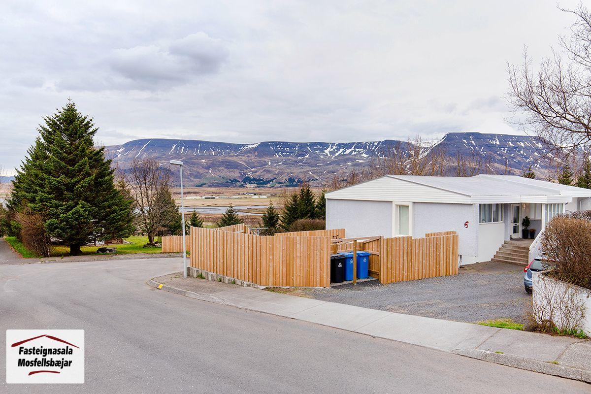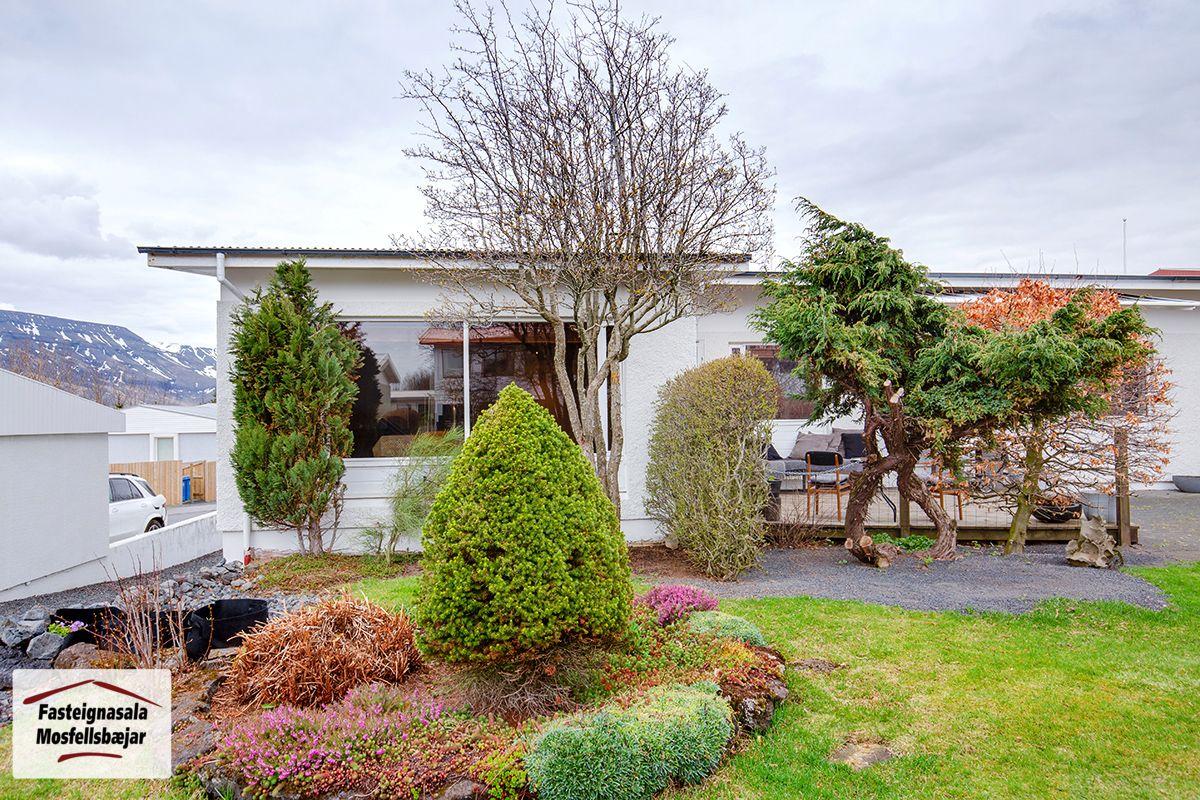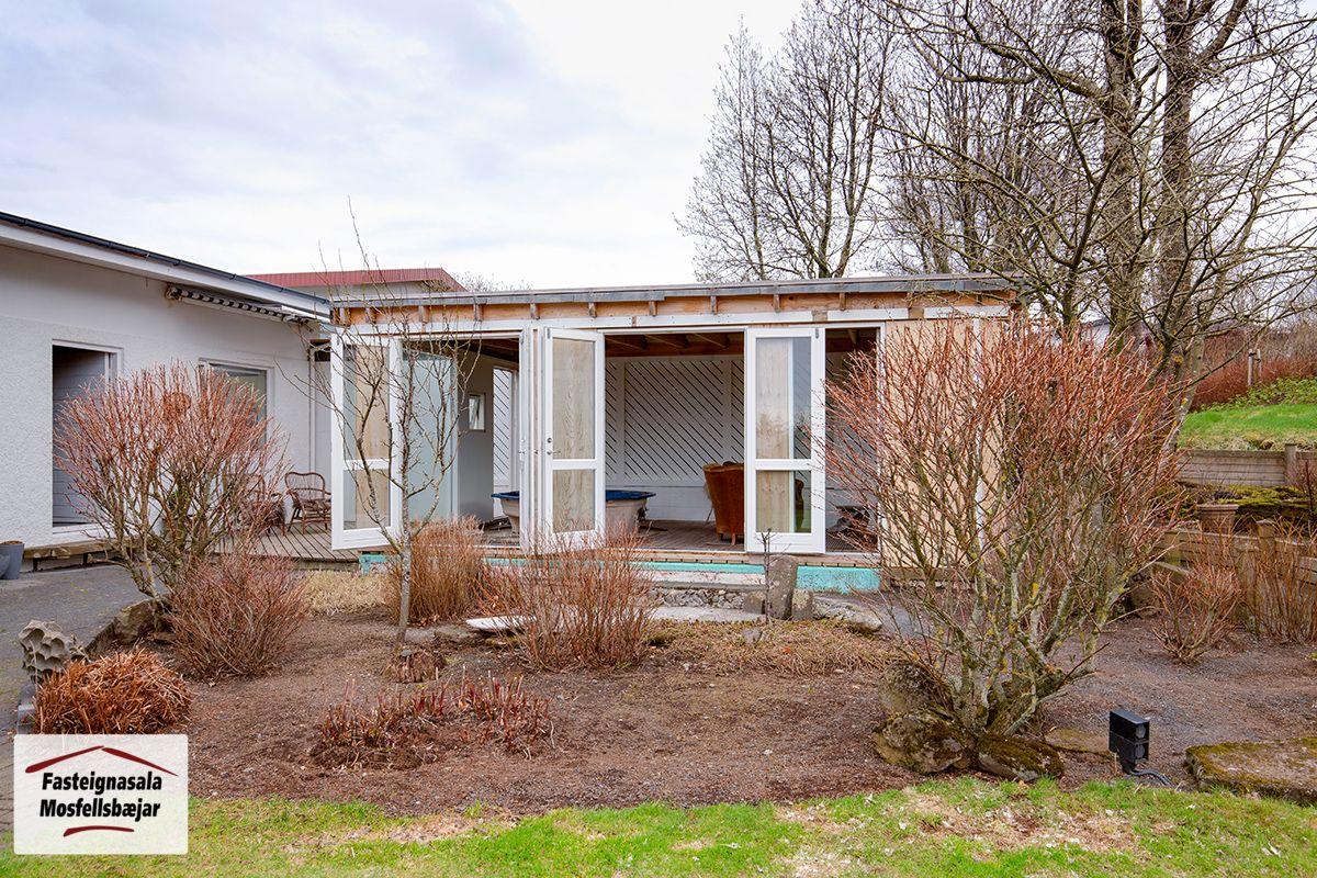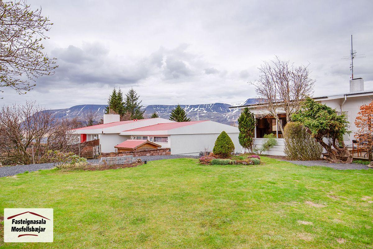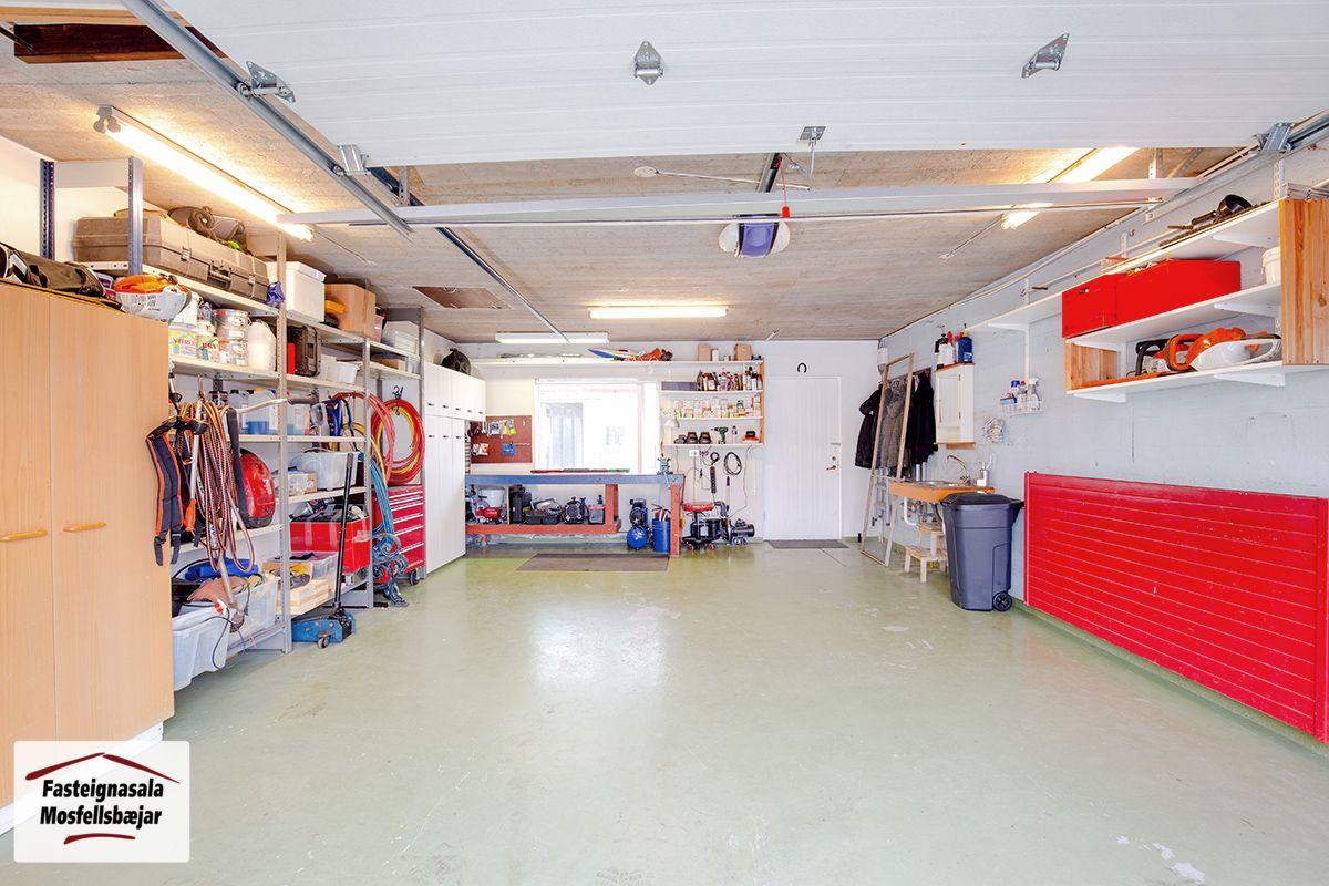 bílskúr með útgengi út í garð og garðskála. Yfir bílskúrnum er geymsla. Bílaplan fyrir framan húsið er steypt og svo hellulagt yfir sem og gönguleið að húsi eru hellulögð með snjóbræðslu. Húsið er staðsteypt hús á tveimur hæðum, loftplata yfir efri hæð er steypt, aðkoma er úr bílskúr upp á loft yfir efri hæð. Neysluvatns- og ofnalagnir eru í stokkum á neðri hæð. Fallegt útsýni er frá húsinu að Esjunni.