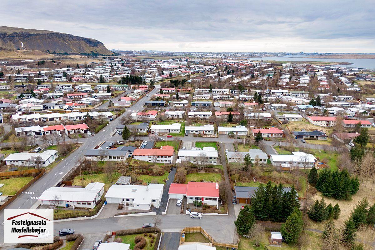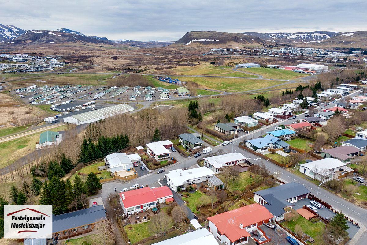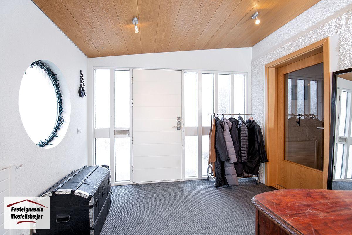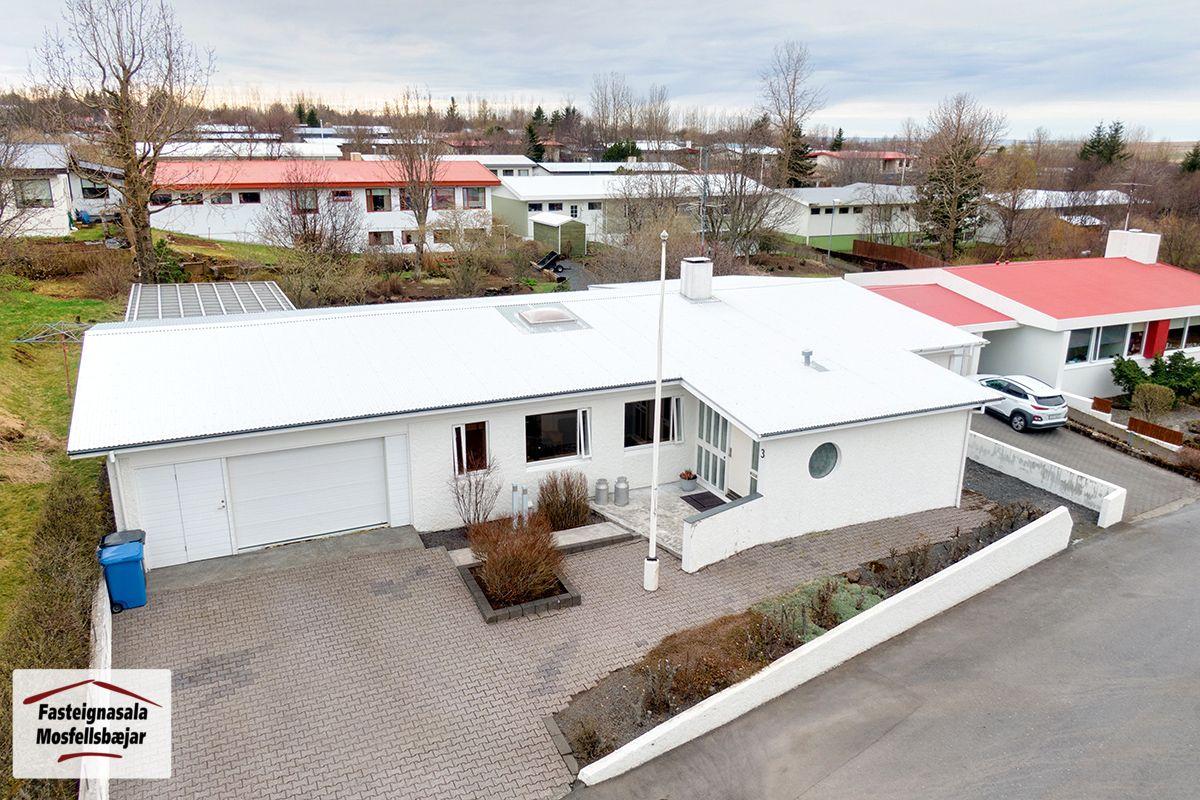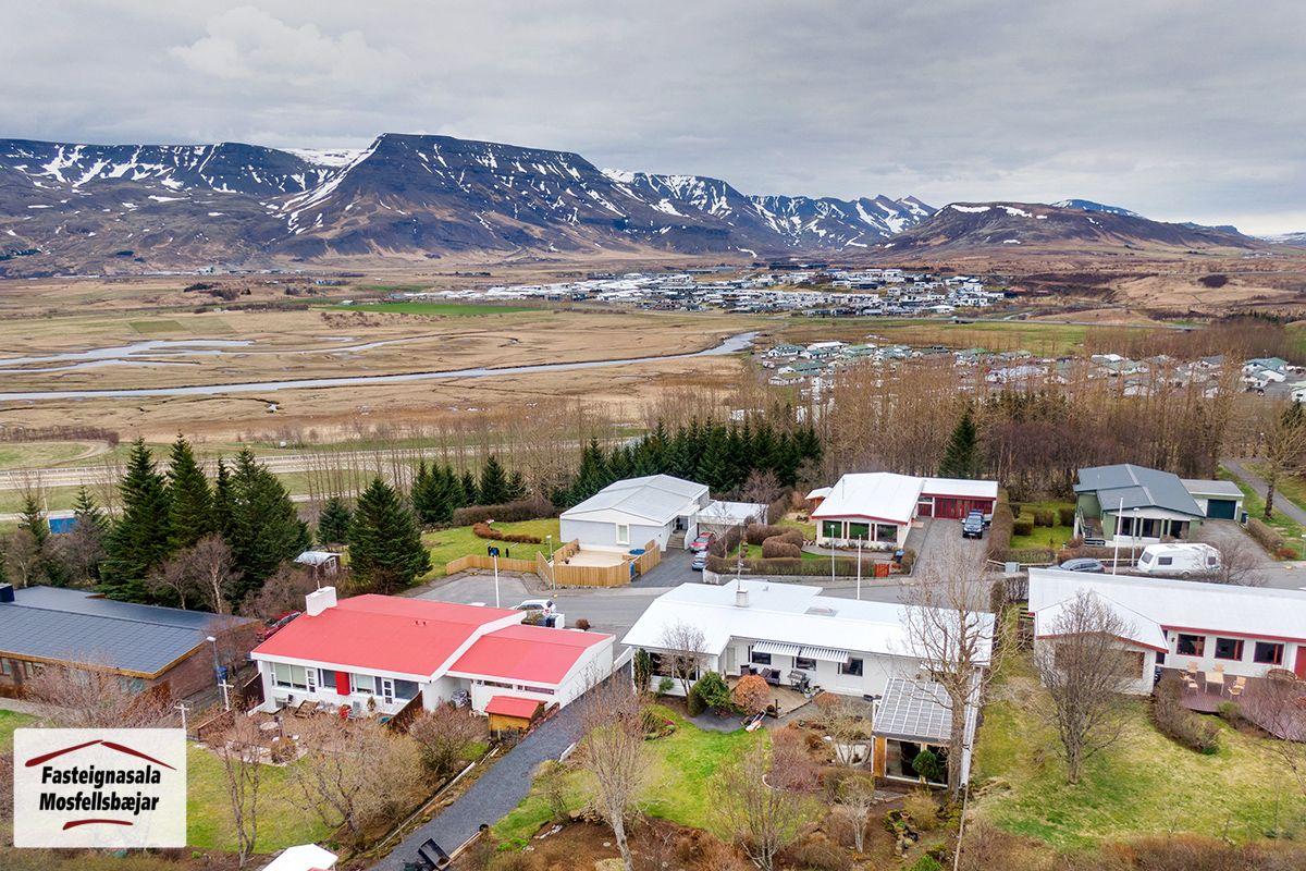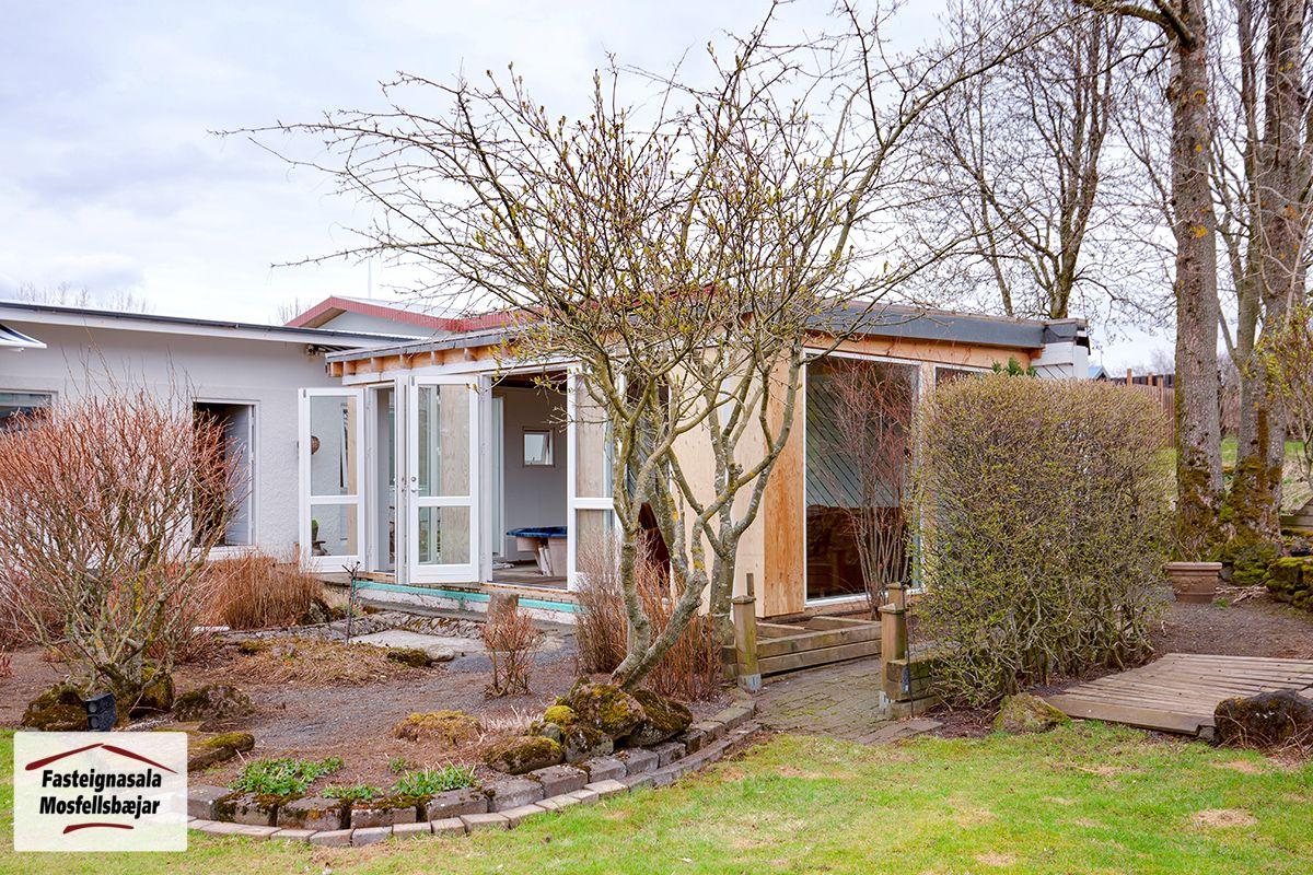 bílskúr með útgengi út í garð og garðskála. Yfir bílskúrnum er geymsla. Bílaplan fyrir framan húsið er steypt og svo hellulagt yfir sem og gönguleið að húsi eru hellulögð með snjóbræðslu. Húsið er staðsteypt hús á tveimur hæðum, loftplata yfir efri hæð er steypt, aðkoma er úr bílskúr upp á loft yfir efri hæð. Neysluvatns- og ofnalagnir eru í stokkum á neðri hæð. Fallegt útsýni er frá húsinu að Esjunni.
