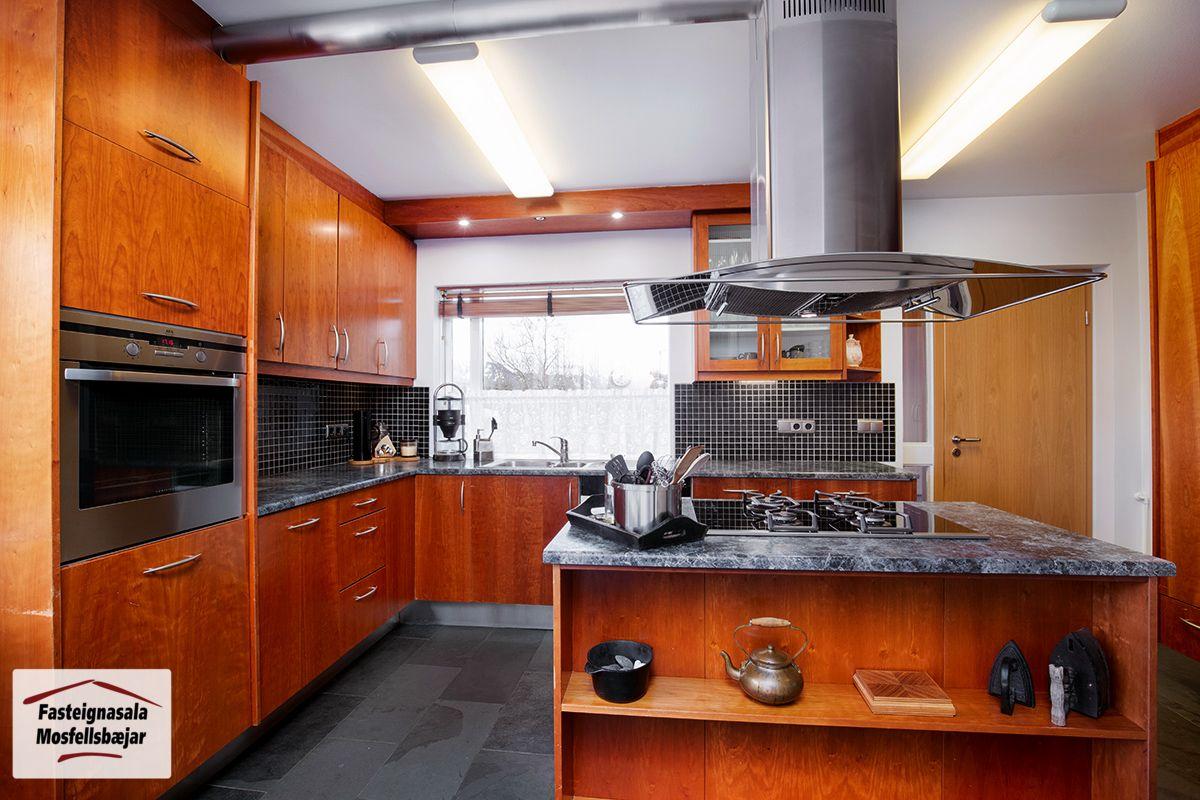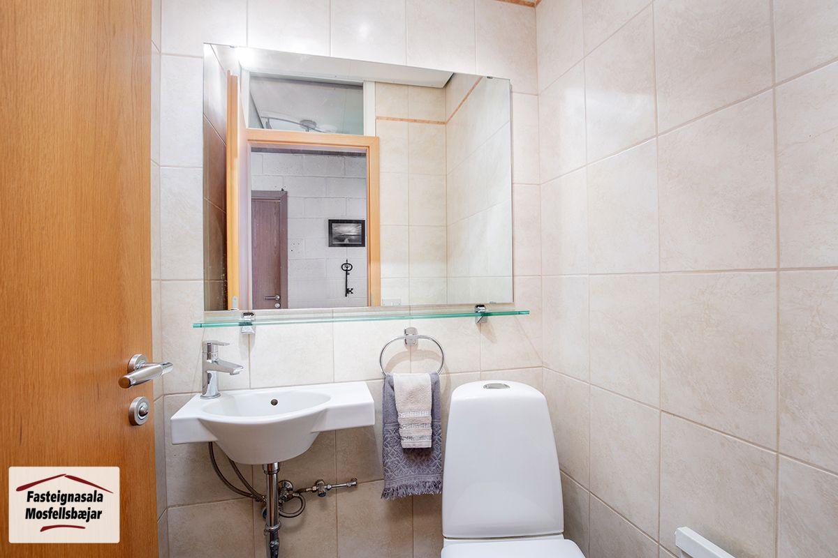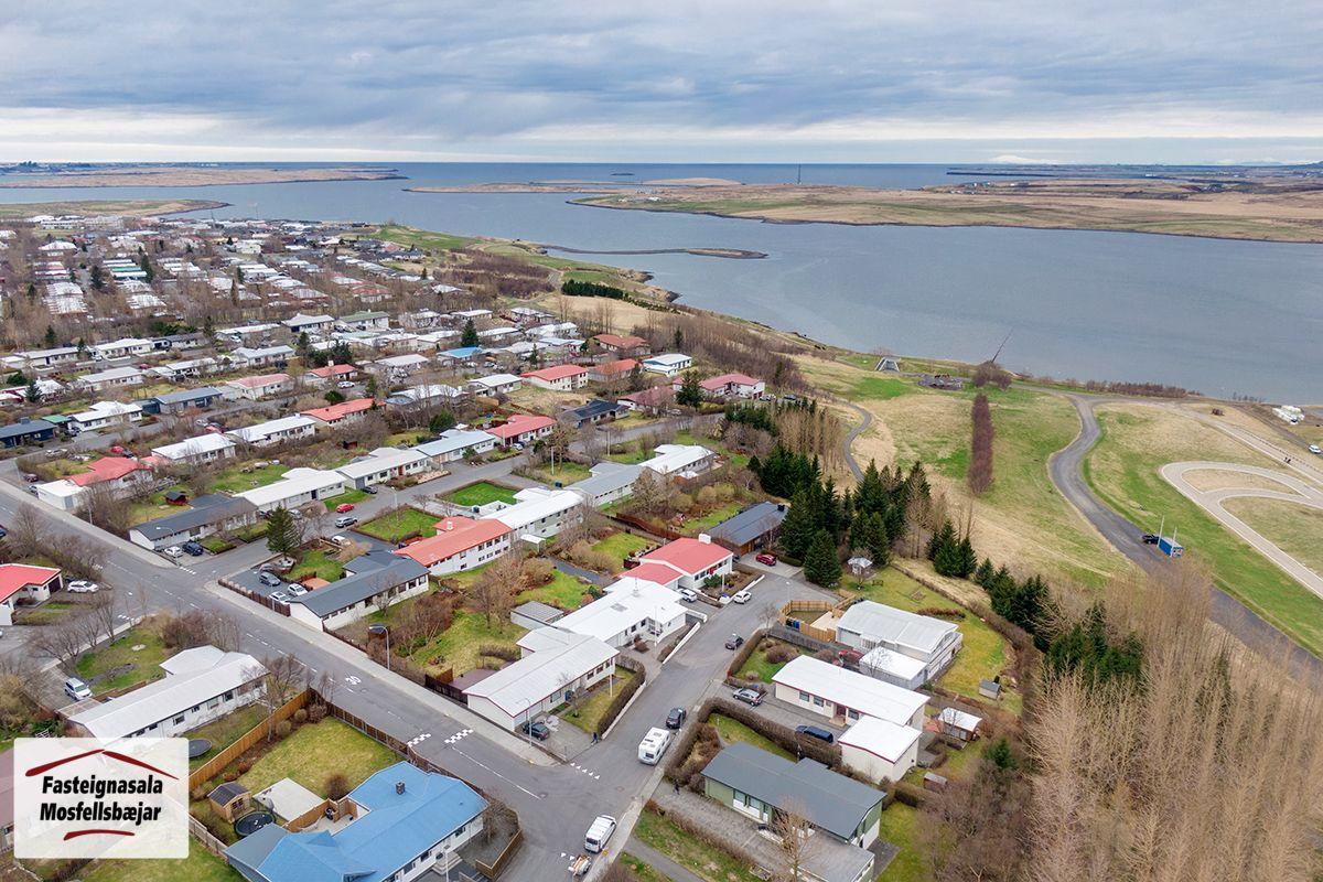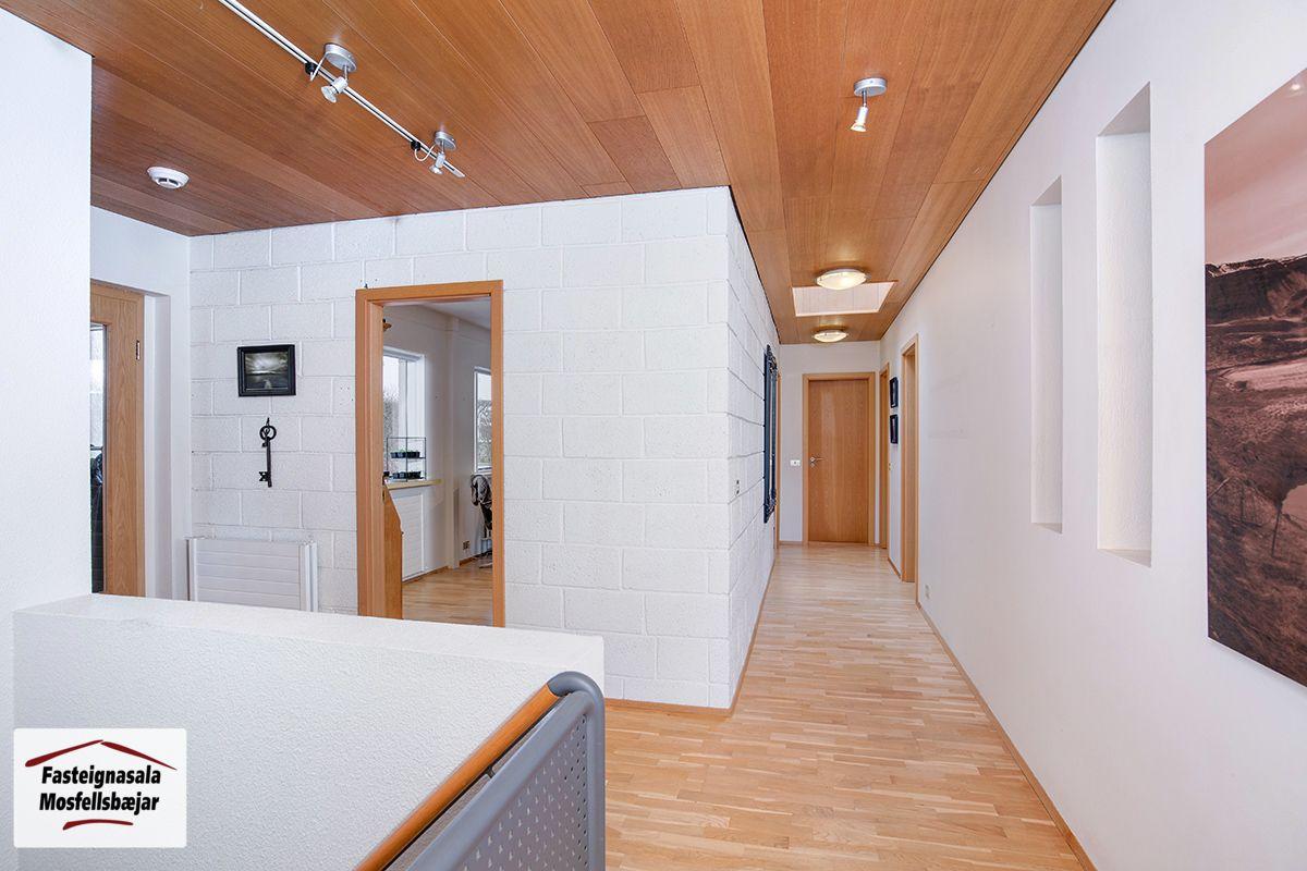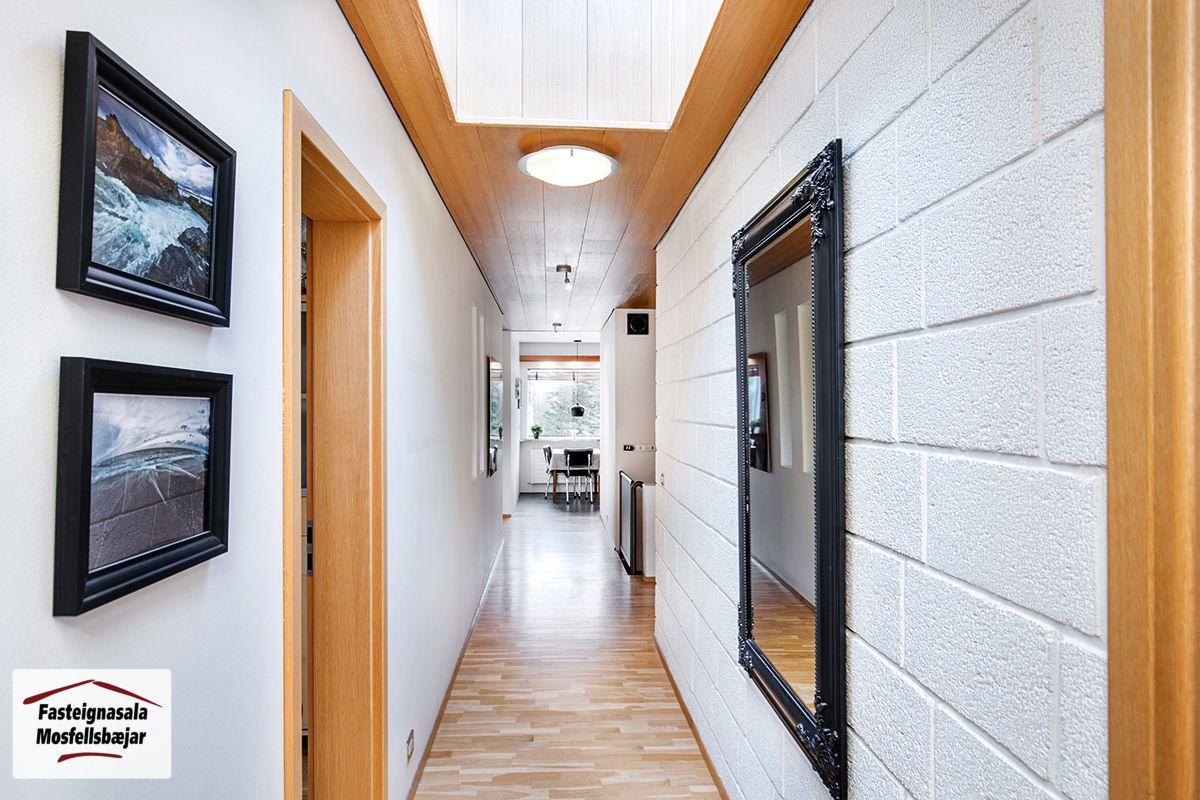 bílskúr með útgengi út í garð og garðskála. Yfir bílskúrnum er geymsla. Bílaplan fyrir framan húsið er steypt og svo hellulagt yfir sem og gönguleið að húsi eru hellulögð með snjóbræðslu. Húsið er staðsteypt hús á tveimur hæðum, loftplata yfir efri hæð er steypt, aðkoma er úr bílskúr upp á loft yfir efri hæð. Neysluvatns- og ofnalagnir eru í stokkum á neðri hæð. Fallegt útsýni er frá húsinu að Esjunni.