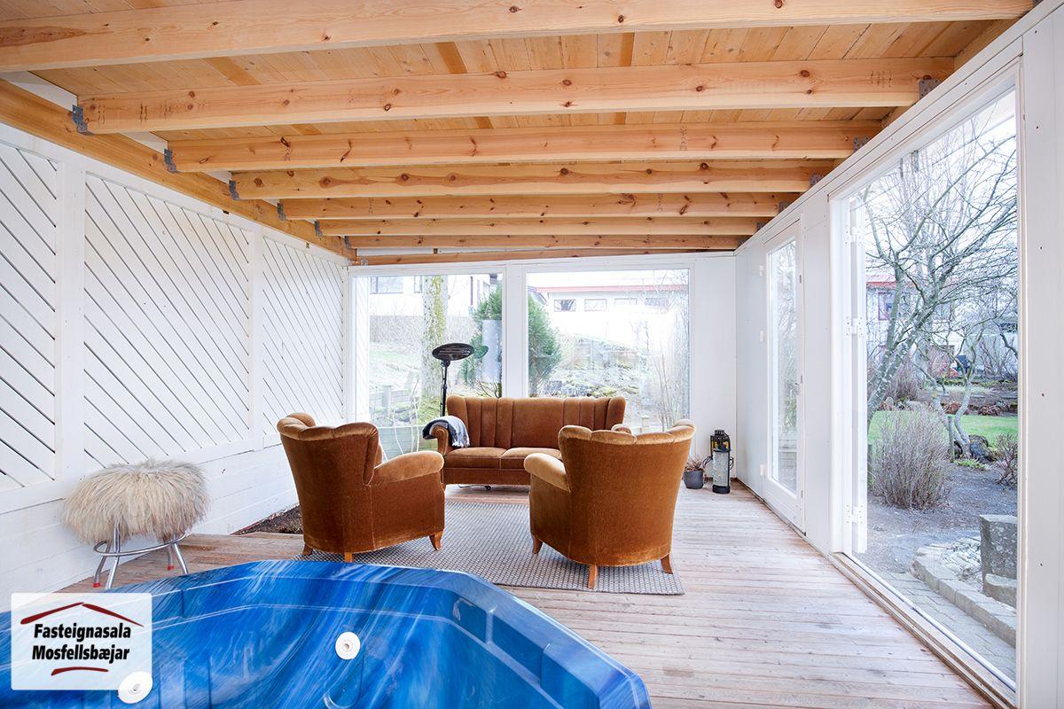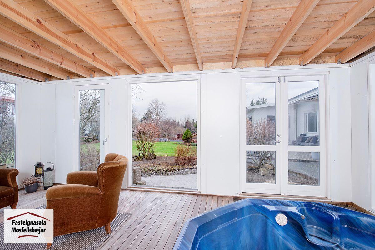 timburverönd og fallegan suðurgarð. Í garði er 28 m2 yfirbyggð sundlaug sem er nýtt sem