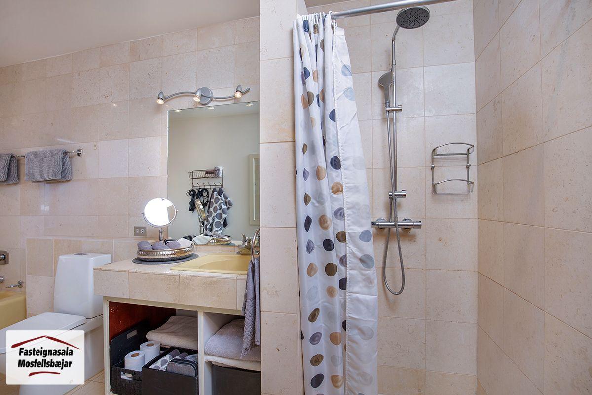 baðherbergi með rúmgóðri sturtu, inn af baðherbergi er lítið