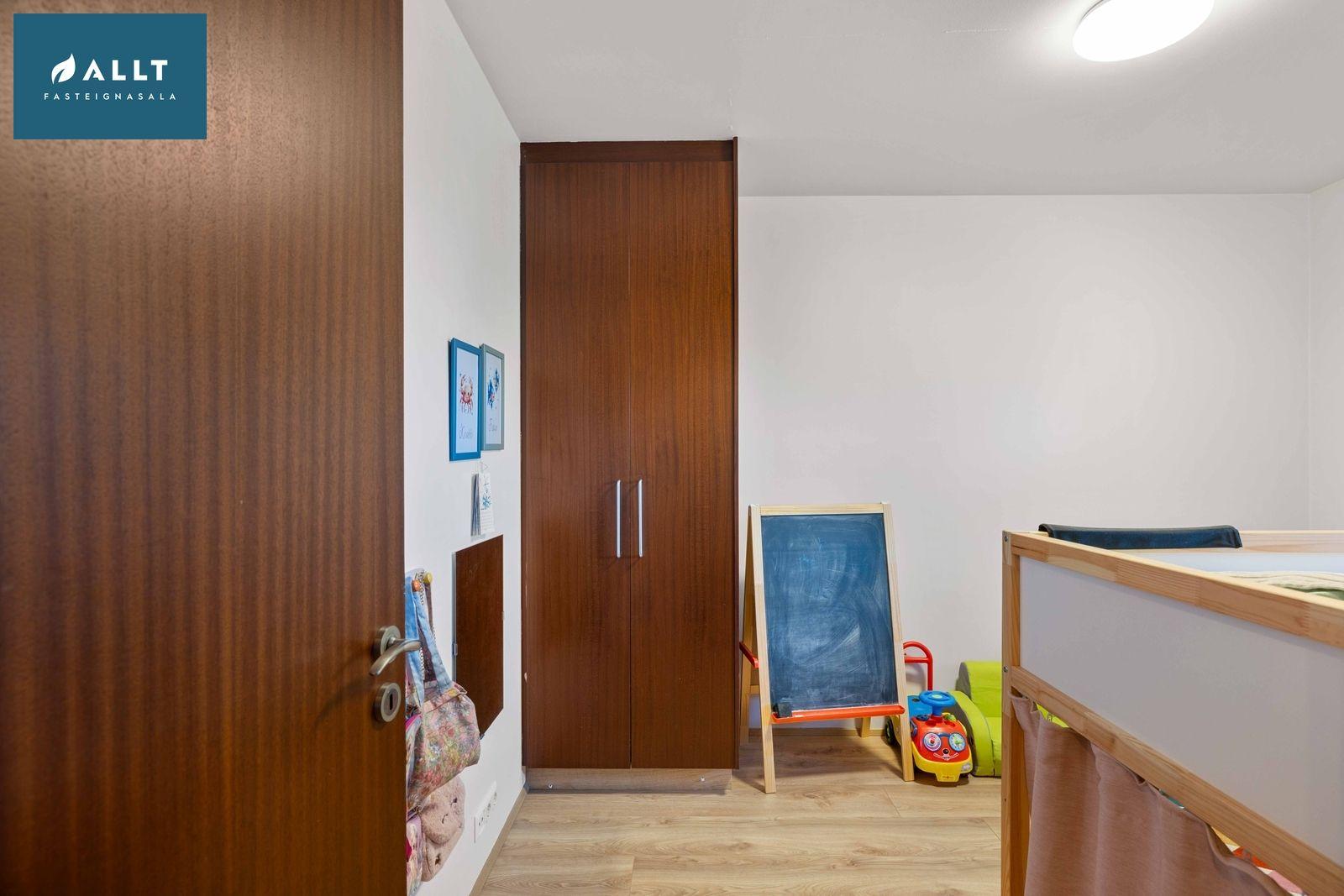 Barnaherbergi við forstofu. Parket á gólfi og skápur