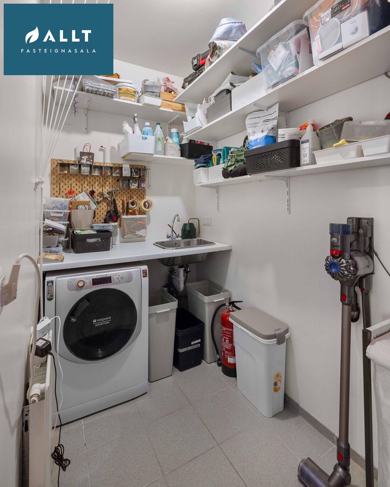 Þvottahús með flísalögðu gólfi, innréttingu og hillum