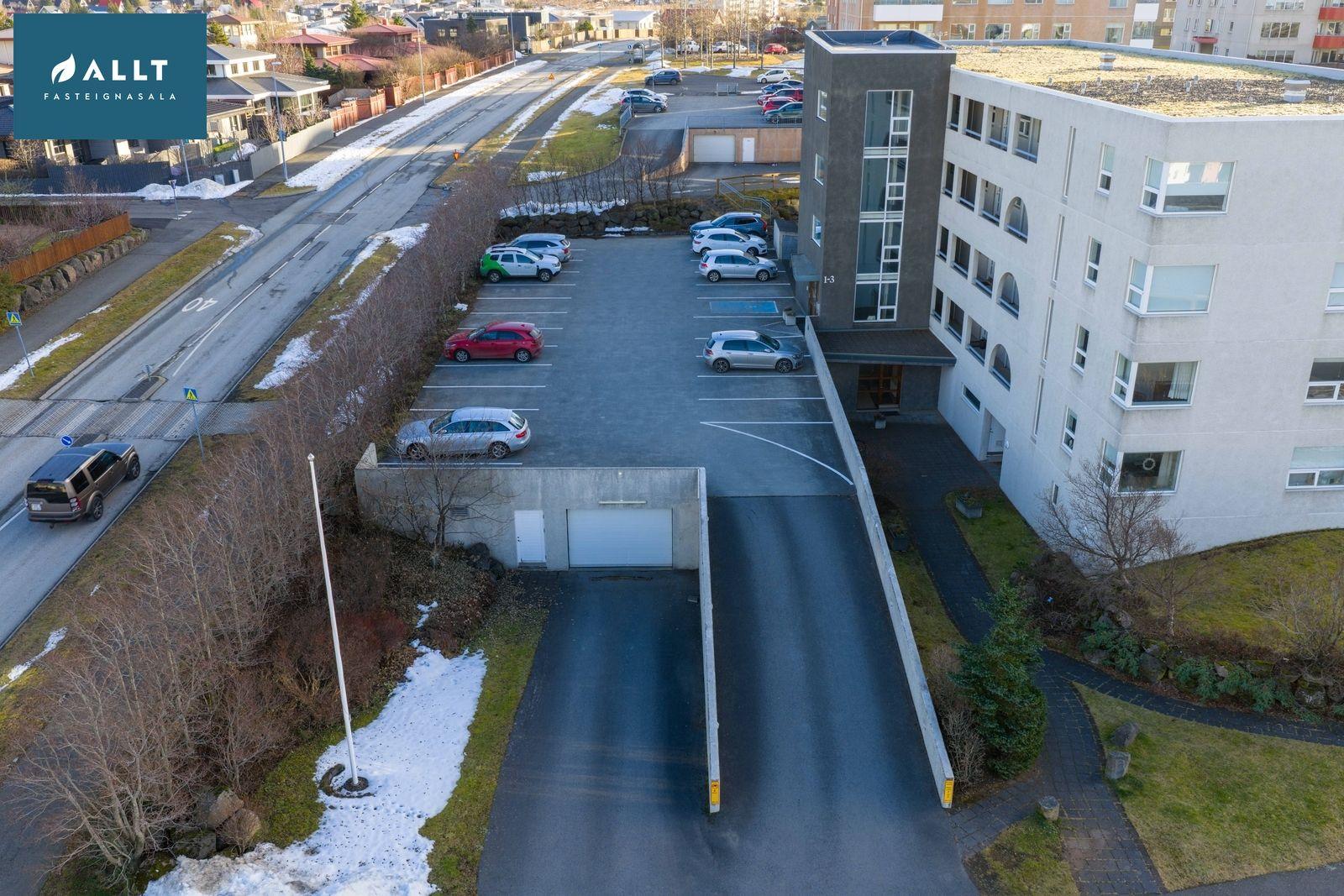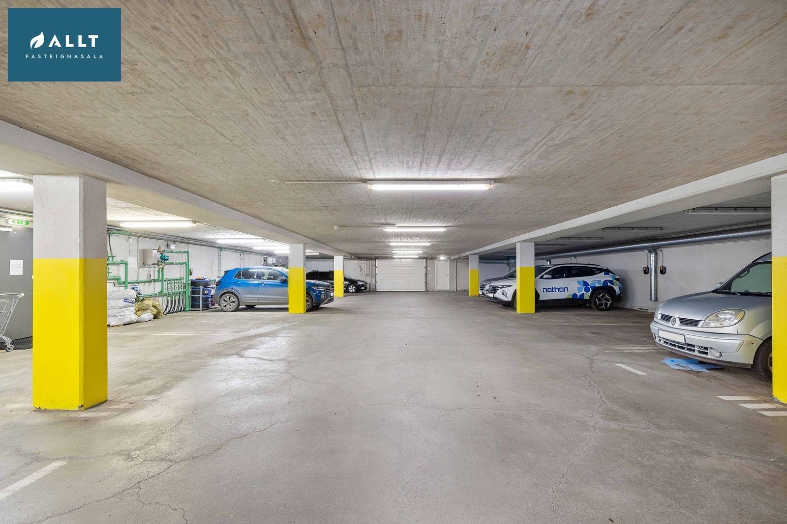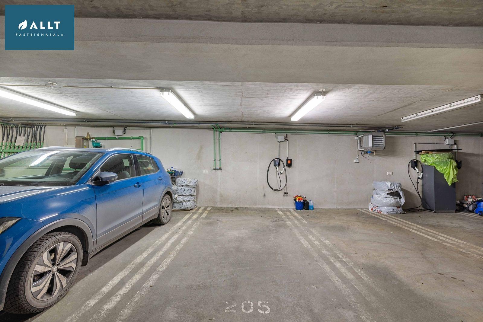 Stæði í bílgeymslu merkt B.04 og hefur bílhleðslustöð. Ofan á bílgeymslu eru bílastæði fjölbýlisins