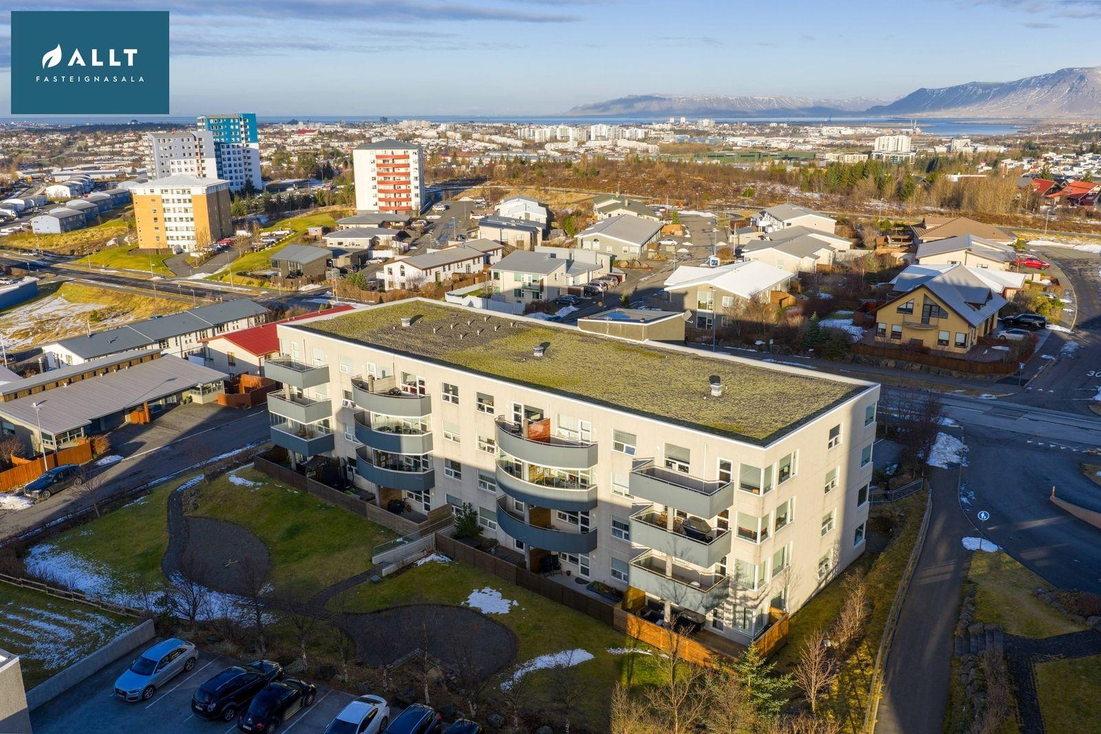 Gengið út á séraflokaða verönd út frá stofu. Sér geymsla í sameign, hjóla- og vagnageymsla, sorpgeymsla,