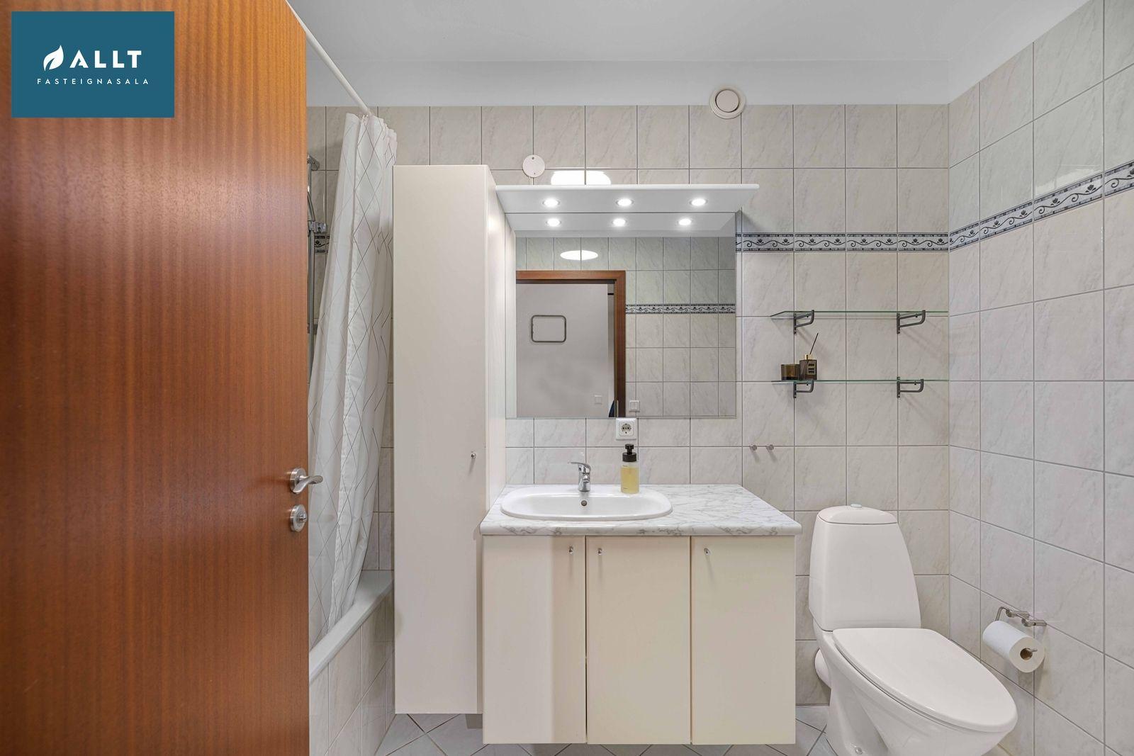 Baðherbergi flísalagðir veggir og gólf, baðkar með sturtuhengi, innrétting með vask ásamt skáp