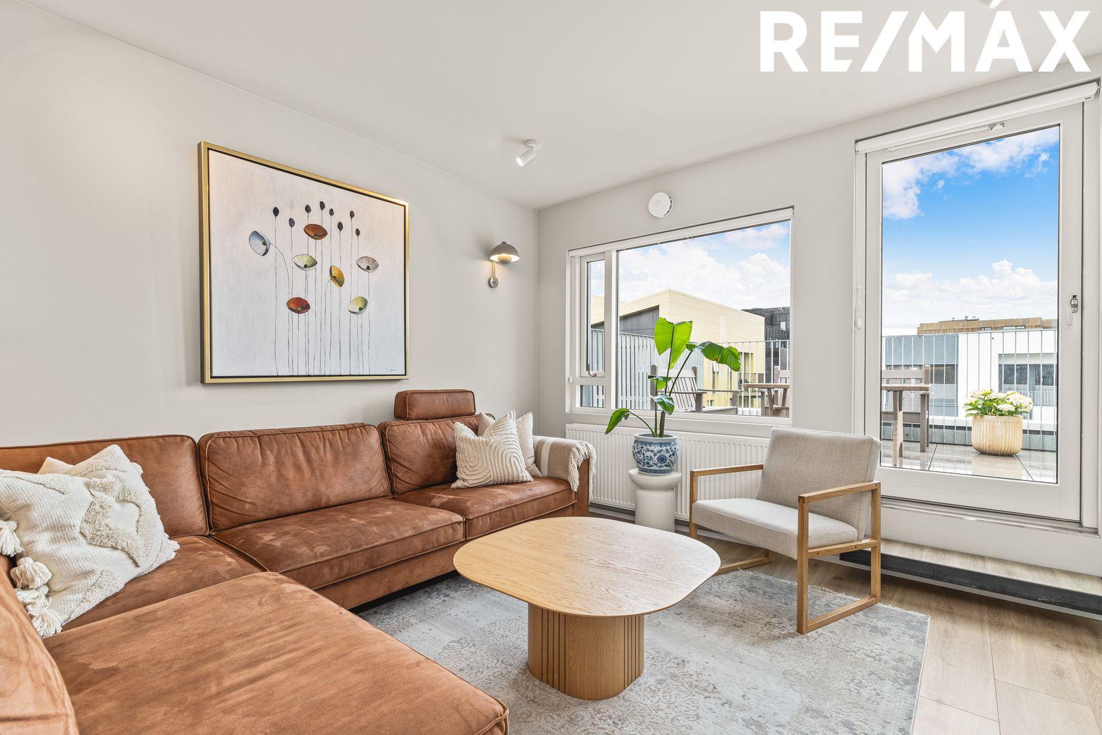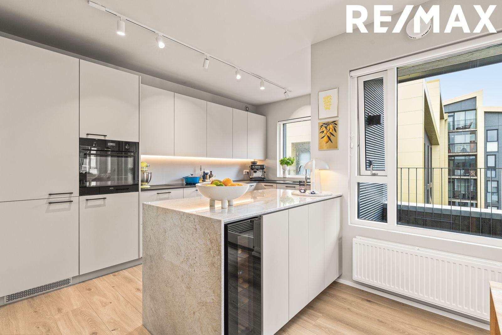 Alrými - eldhús/borðstofa/stofa: Bjart og rúmgott alrými. Í eldhúsi er falleg og vönduð sérsmíðuð innrétting og eldhúseyja með vínkæli mjög gott skápa og vinnupláss, ljúflokun á skúffum og skápum, innbyggð uppþvottavél, ísskápur m/frysti, spanhelluborð, vifta. Öll tæki eru frá AEG. Borðplata á innréttingu er svört á lit er frá Egger. Borðplata á eldhúseyju er Kvartzít steinn. Harðparket á gólfi. Úr alrými er gengið bæði út á svalir 3 m2 og úr stofu er gengið út á 33,7 m2 þaksvalir, möguleiki á að setja heitan pott á þaksvalir vatnskrani og affall er til staðar á svölum.