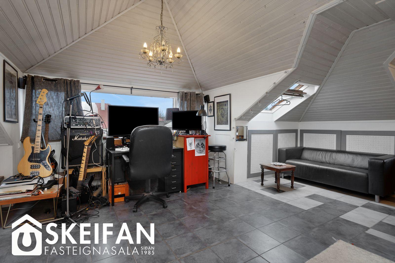 Eignin skiptist í hol, stofu, eldhús, 2 svefnherbergi og baðherbergi. Íbúðin er skráð 45.5 fm. en gólfflötur er nokkuð stærri þar sem hluti íbúðarinnar er undir súð.