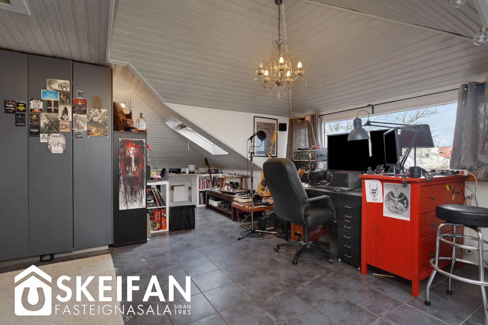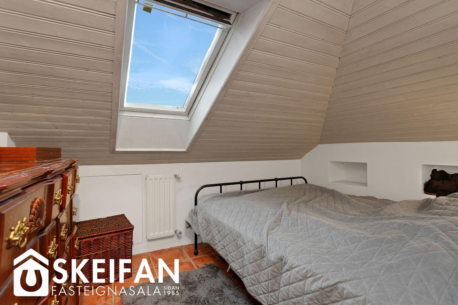 Tvö svefnherbergi, annað herbergið er undir súð og er með þakglugga, bæði herbergin eru með brúnum flísum á gólfi.
