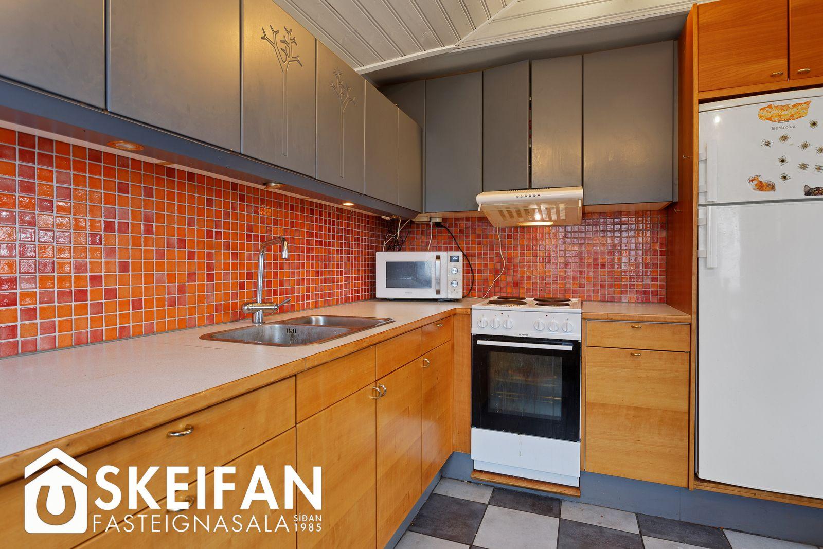 Stofa og eldhús eru í sameiginlegu rými með stórum gráum flísum á gólfi, hvíttaður panell er í loftum. Eldhús er með ágætum innréttingum og borðkrók, flísar á gólfi.