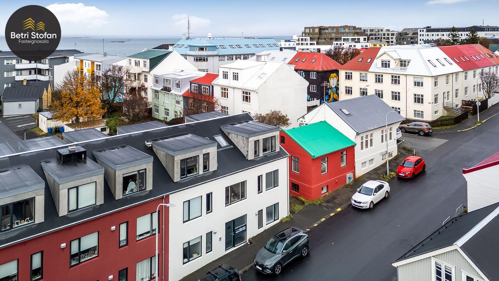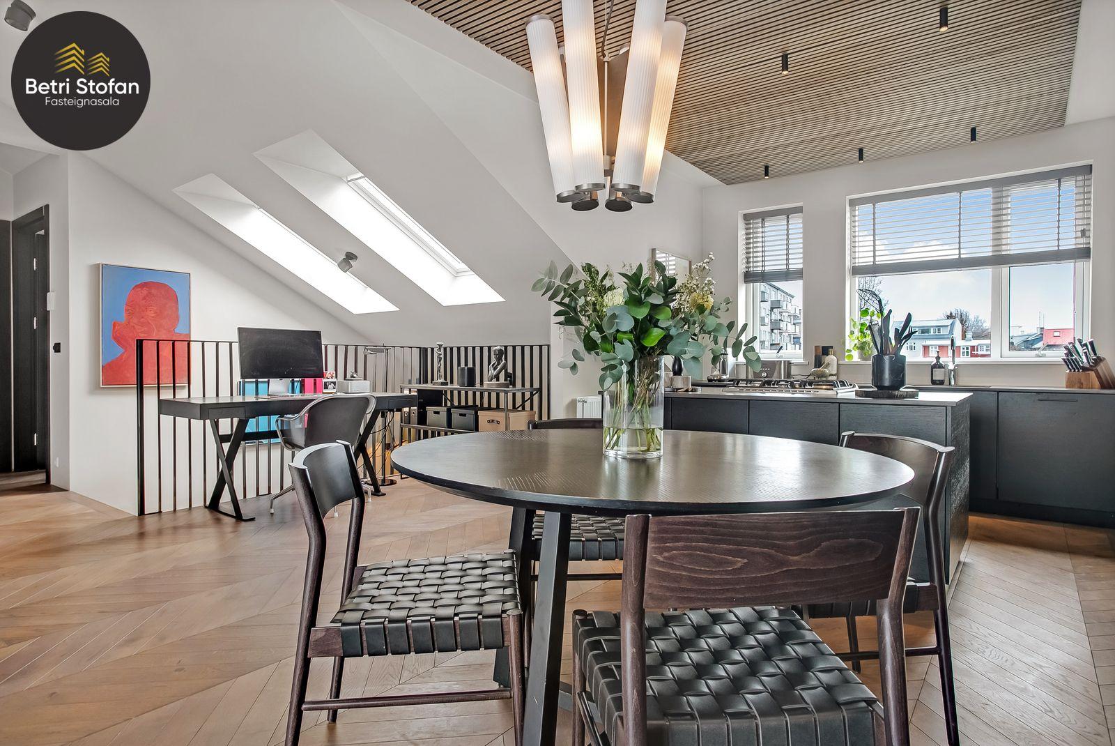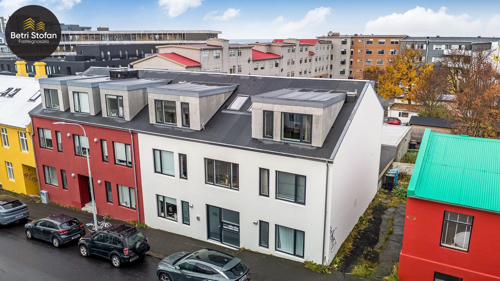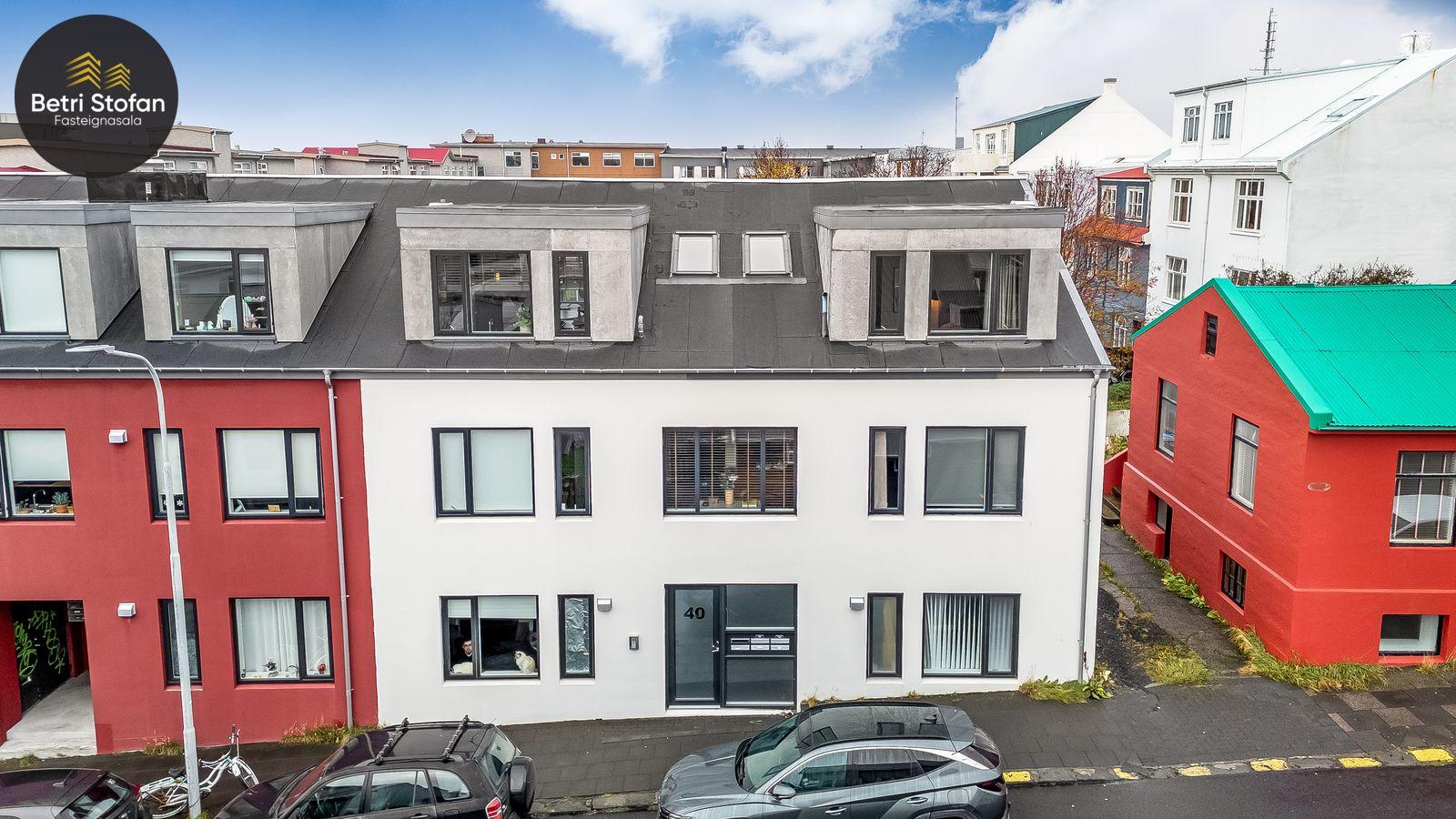 Betri Stofan og Jason Kristinn sími 7751515 jason@betristofan.is kynna: Nýlega íbúð 109,1 fermetra við Framnesveg 40. Eignin skiptist í forstofu, eldhús, stofu, tvö svefnherbergi, baðherbergi, tvennar svalir og geymslu ásamt sérmerktu stæði. Nánari lýsing. Gengið er inn í forstofu með innbyggðum skápum. Teppalagður stigi tekur við sem leiðir mann upp í alrými íbúðar. Á vinstri hönd er stigapallur sem nýttur er í dag sem skrifstofa. Eldhús: Opið er inn fallegt eldhús með fallegum innréttingum á tvo vegu og góðri eyju með miklu skápa plássi. Steinn er á borðum og niðurfelldur vaskur. SMEG gashelluborð er staðsett í miðri eyjunni. SMEG bakarofn er í vinnuhæð. Stofur: eru samliggjandi með gólfsíðum gluggum en frá stofu er gengið út á góðar svalir. Hjónaherbergið er rúmgott, skráð 17,3 fm með góðum skápum og opnum hillum undir súð. Frá hjónaherbergi er einnig gengið út á svalir. Svefnherbergi II: rúmgott, skráð 12,4 fm. Baðherbegi er staðsett á milli svefnherbergja. Góð sturta, upphengt salerni og innrétting með stein á borði. Flísalagt með fallegum flísum. Þvottahús er innan íbúðar með góðri innréttingu þar sem gert er ráð fyrir þvottavél í vinnuhæð. Þakgluggi er á þvottahúsi. Geymsla skráð 6,2 fm. Stæði sérmerkt er á baklóð. Gegnheilt chevron parket er á gólfum, vandaðar flísar á votrýmum og teppi á stigagangi sem er innan íbúðar. Hljóðmottur frá Ebson í loftum alrýmis. Eldhús er opið inn í fallegt alrými og eru útgengt út á góðar svalir frá stofu. Tvö rúmgóð svefnherbergi, annað með fataherbergi undir súð og útgengt út á svalir. Gott þvottahús með innréttingum og þvottavél í vinnuhæð er innan íbúðar. íbúði er skráð 109,1 fermetrar en er stærri þar sem að eigin er að hluta til undir súð, Sameiginleg vagna og hjólageymsla er í bakhúsi.