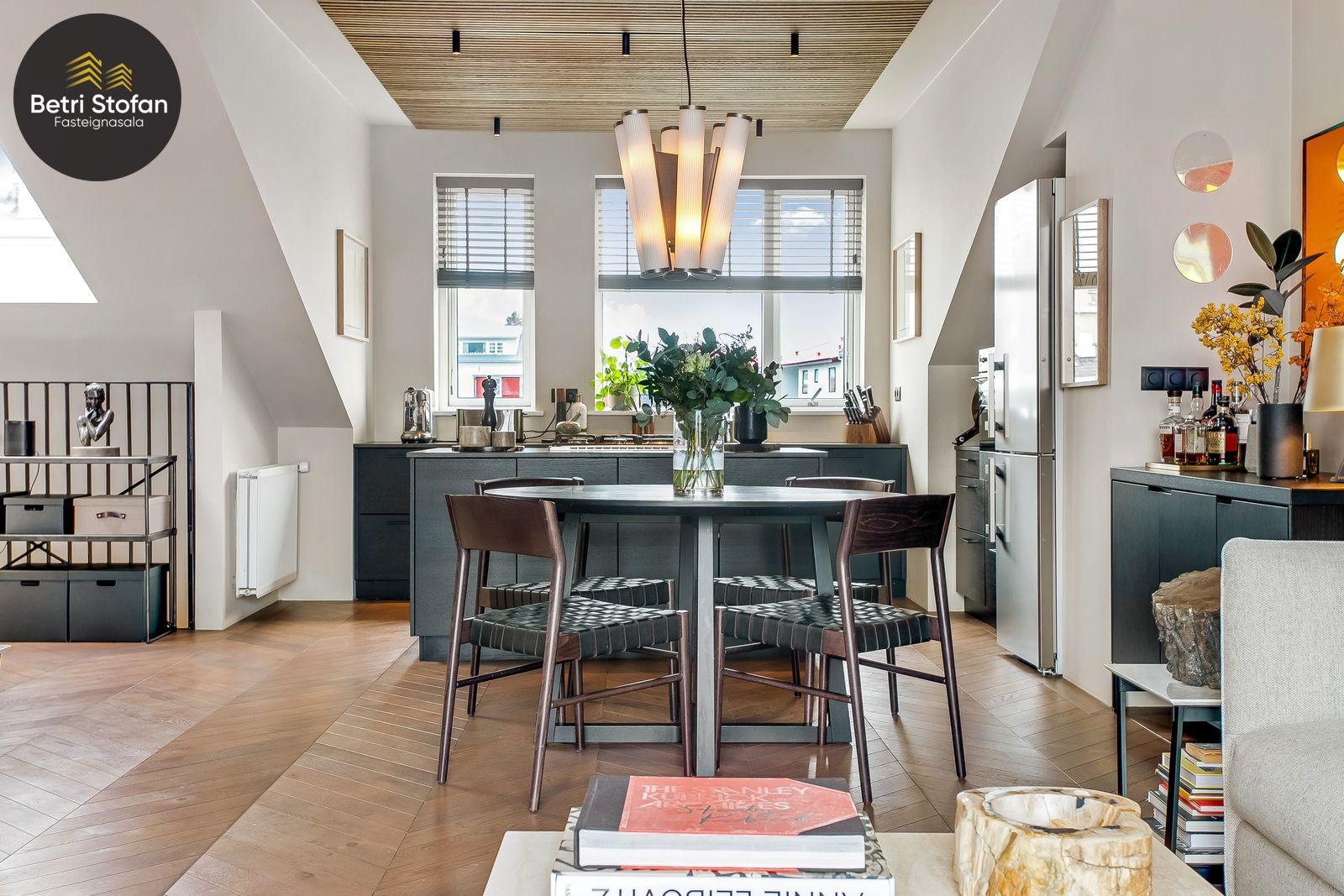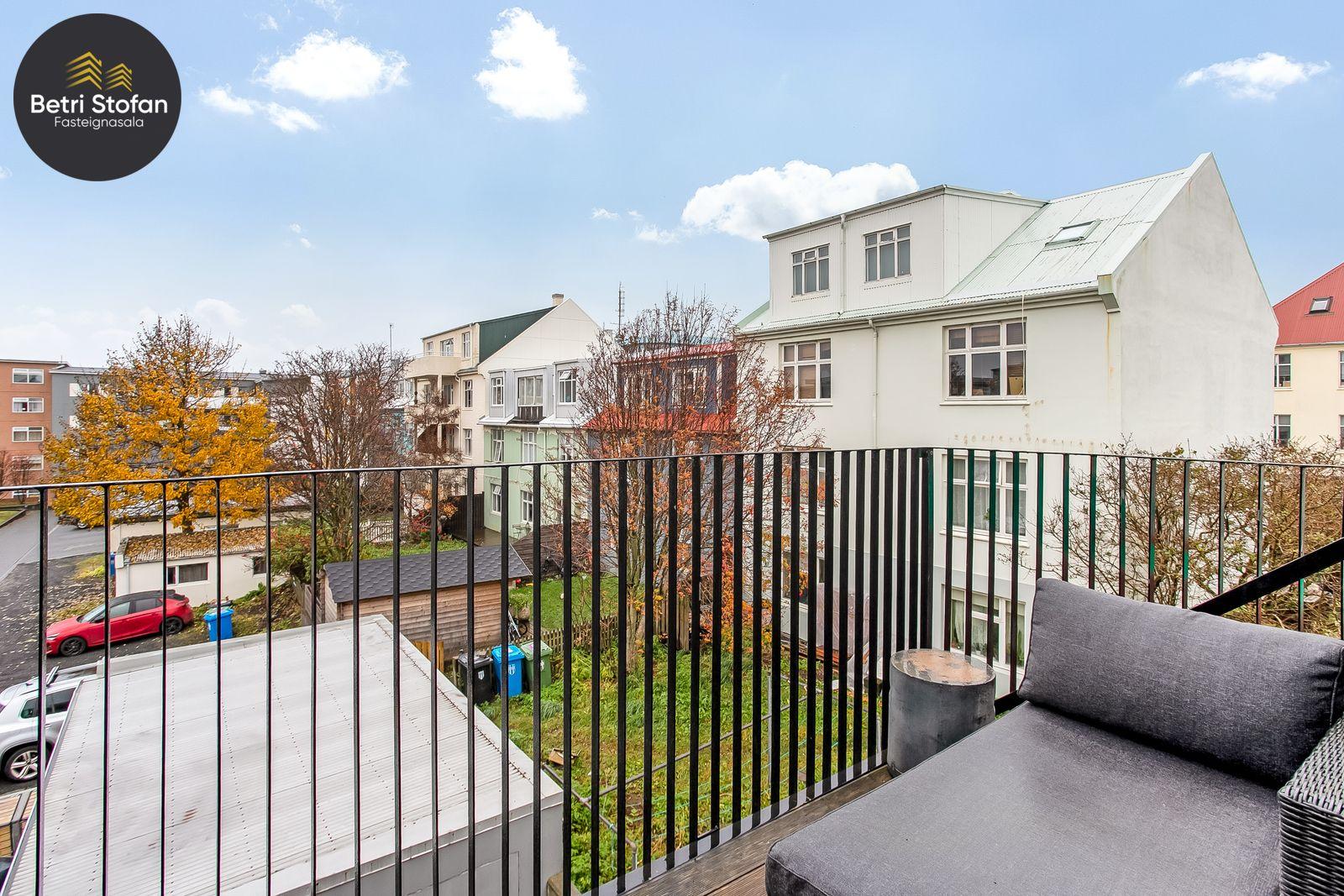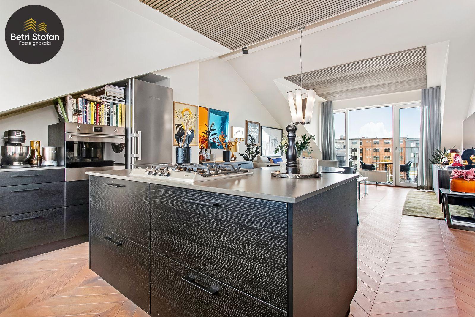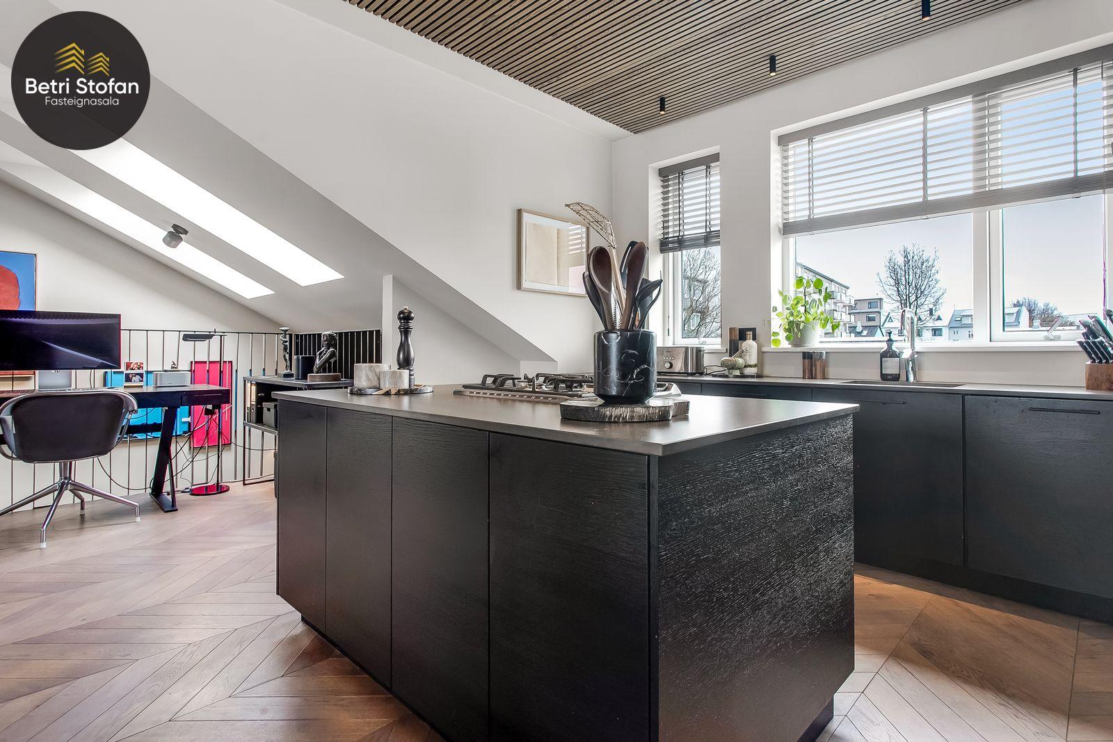 Betri Stofan og Jason Kristinn sími 7751515 jason@betristofan.is kynna: Nýlega íbúð 109,1 fermetra við Framnesveg 40. Eignin skiptist í forstofu, eldhús, stofu, tvö svefnherbergi, baðherbergi, tvennar svalir og geymslu ásamt sérmerktu stæði. Nánari lýsing. Gengið er inn í forstofu með innbyggðum skápum. Teppalagður stigi tekur við sem leiðir mann upp í alrými íbúðar. Á vinstri hönd er stigapallur sem nýttur er í dag sem skrifstofa. Eldhús: Opið er inn fallegt eldhús með fallegum innréttingum á tvo vegu og góðri eyju með miklu skápa plássi. Steinn er á borðum og niðurfelldur vaskur. SMEG gashelluborð er staðsett í miðri eyjunni. SMEG bakarofn er í vinnuhæð. Stofur: eru samliggjandi með gólfsíðum gluggum en frá stofu er gengið út á góðar svalir. Hjónaherbergið er rúmgott, skráð 17,3 fm með góðum skápum og opnum hillum undir súð. Frá hjónaherbergi er einnig gengið út á svalir. Svefnherbergi II: rúmgott, skráð 12,4 fm. Baðherbegi er staðsett á milli svefnherbergja. Góð sturta, upphengt salerni og innrétting með stein á borði. Flísalagt með fallegum flísum. Þvottahús er innan íbúðar með góðri innréttingu þar sem gert er ráð fyrir þvottavél í vinnuhæð. Þakgluggi er á þvottahúsi. Geymsla skráð 6,2 fm. Stæði sérmerkt er á baklóð. Gegnheilt chevron parket er á gólfum, vandaðar flísar á votrýmum og teppi á stigagangi sem er innan íbúðar. Hljóðmottur frá Ebson í loftum alrýmis. Eldhús er opið inn í fallegt alrými og eru útgengt út á góðar svalir frá stofu. Tvö rúmgóð svefnherbergi, annað með fataherbergi undir súð og útgengt út á svalir. Gott þvottahús með innréttingum og þvottavél í vinnuhæð er innan íbúðar. íbúði er skráð 109,1 fermetrar en er stærri þar sem að eigin er að hluta til undir súð, Sameiginleg vagna og hjólageymsla er í bakhúsi.