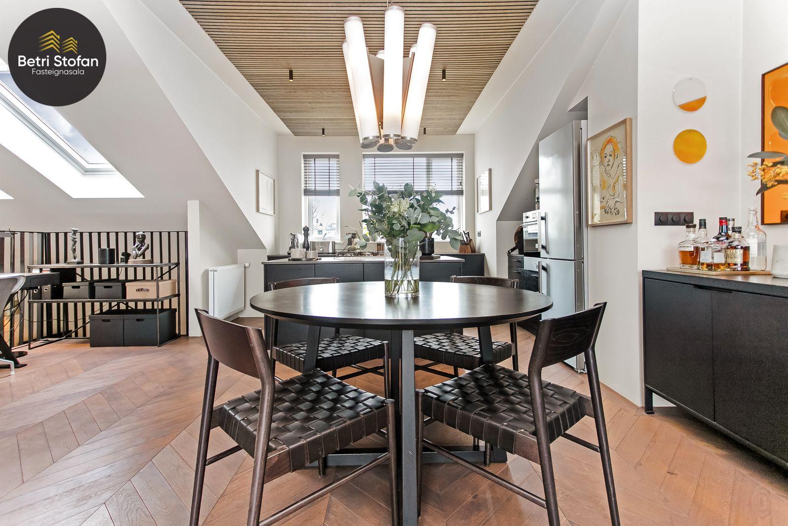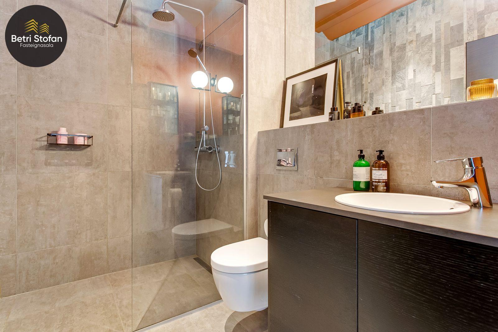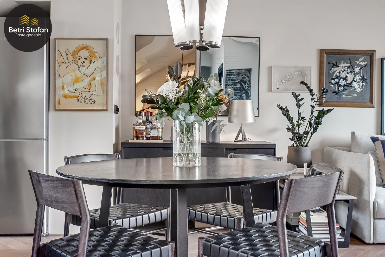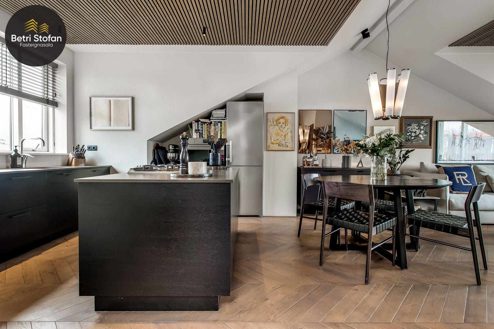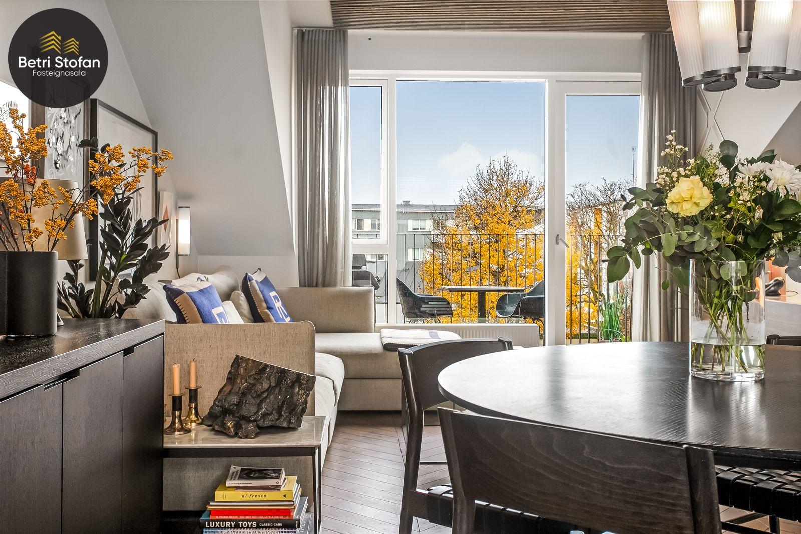 Betri Stofan og Jason Kristinn sími 7751515 jason@betristofan.is kynna: Nýlega íbúð 109,1 fermetra við Framnesveg 40. Eignin skiptist í forstofu, eldhús, stofu, tvö svefnherbergi, baðherbergi, tvennar svalir og geymslu ásamt sérmerktu stæði. Nánari lýsing. Gengið er inn í forstofu með innbyggðum skápum. Teppalagður stigi tekur við sem leiðir mann upp í alrými íbúðar. Á vinstri hönd er stigapallur sem nýttur er í dag sem skrifstofa. Eldhús: Opið er inn fallegt eldhús með fallegum innréttingum á tvo vegu og góðri eyju með miklu skápa plássi. Steinn er á borðum og niðurfelldur vaskur. SMEG gashelluborð er staðsett í miðri eyjunni. SMEG bakarofn er í vinnuhæð. Stofur: eru samliggjandi með gólfsíðum gluggum en frá stofu er gengið út á góðar svalir. Hjónaherbergið er rúmgott, skráð 17,3 fm með góðum skápum og opnum hillum undir súð. Frá hjónaherbergi er einnig gengið út á svalir. Svefnherbergi II: rúmgott, skráð 12,4 fm. Baðherbegi er staðsett á milli svefnherbergja. Góð sturta, upphengt salerni og innrétting með stein á borði. Flísalagt með fallegum flísum. Þvottahús er innan íbúðar með góðri innréttingu þar sem gert er ráð fyrir þvottavél í vinnuhæð. Þakgluggi er á þvottahúsi. Geymsla skráð 6,2 fm. Stæði sérmerkt er á baklóð. Gegnheilt chevron parket er á gólfum, vandaðar flísar á votrýmum og teppi á stigagangi sem er innan íbúðar. Hljóðmottur frá Ebson í loftum alrýmis. Eldhús er opið inn í fallegt alrými og eru útgengt út á góðar svalir frá stofu. Tvö rúmgóð svefnherbergi, annað með fataherbergi undir súð og útgengt út á svalir. Gott þvottahús með innréttingum og þvottavél í vinnuhæð er innan íbúðar. íbúði er skráð 109,1 fermetrar en er stærri þar sem að eigin er að hluta til undir súð, Sameiginleg vagna og hjólageymsla er í bakhúsi.