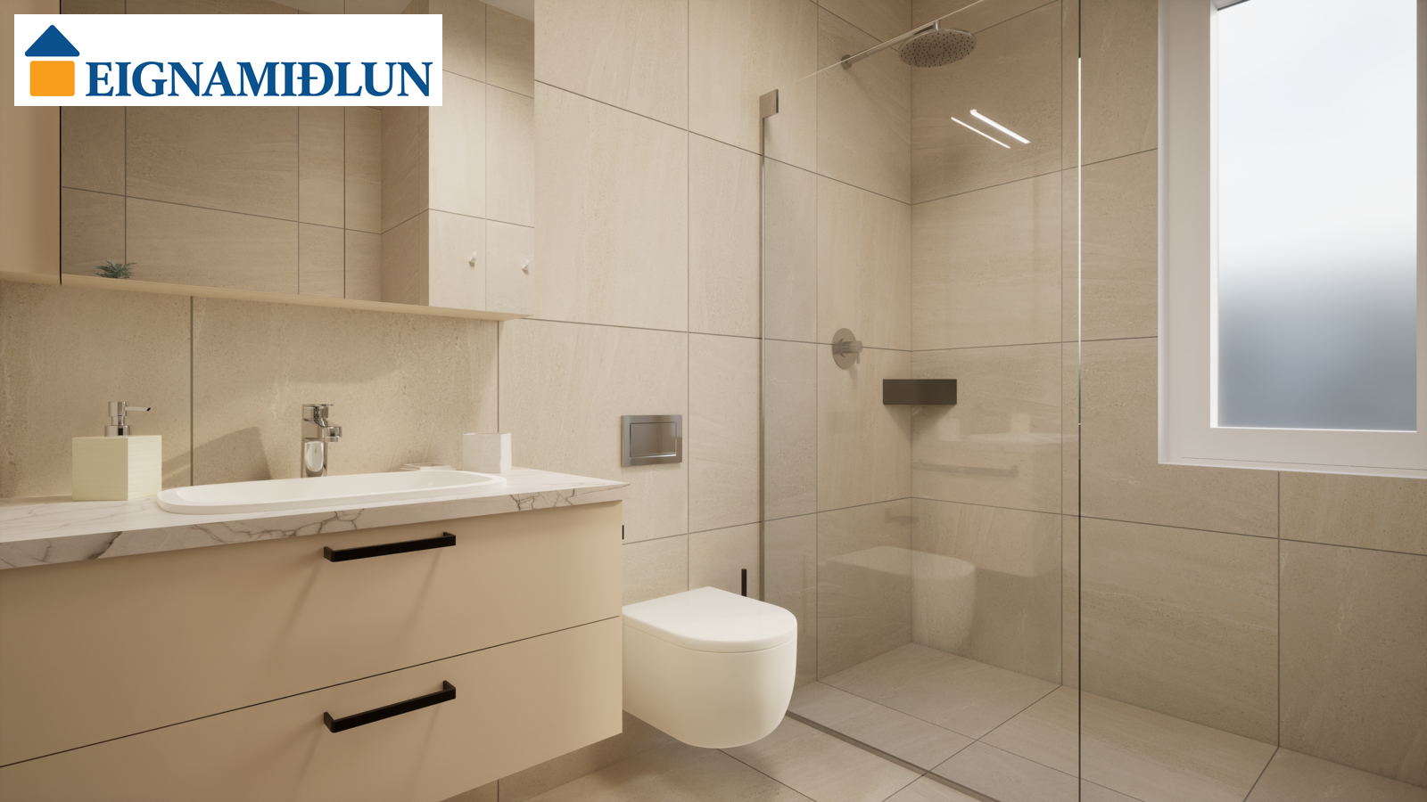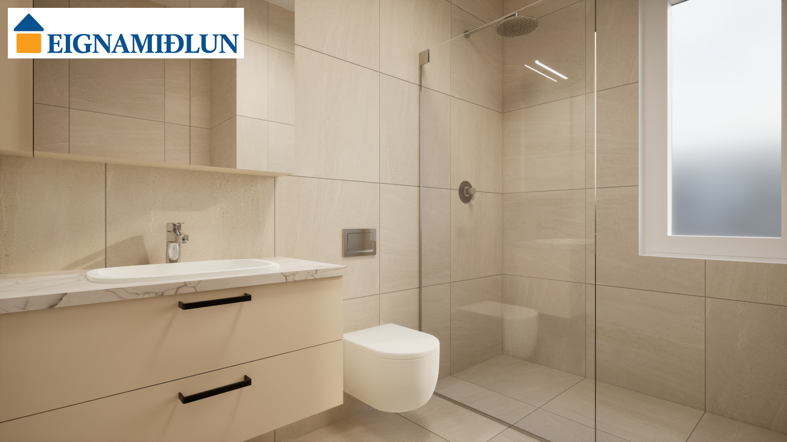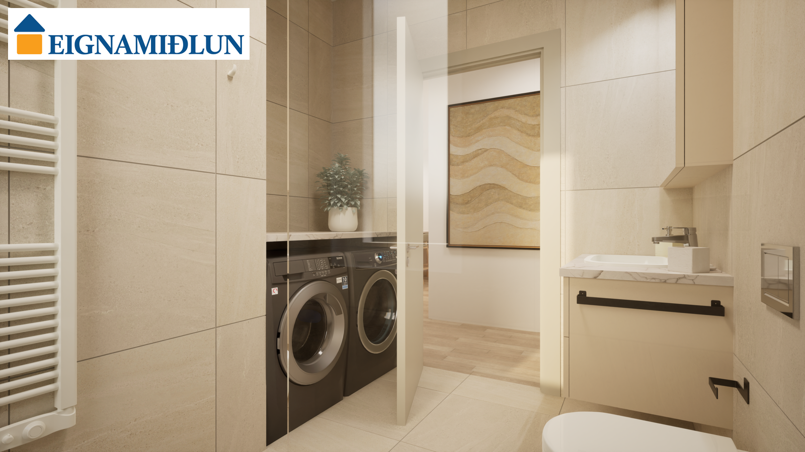 Baðherbergi: Baðherbergi með sturtuklefa. Handlaug, handklæðaofn og upphengt salerni. Flísar á gólfum og veggjum. Aðstaða fyrir þvottavél og þurrkara inn á sér þvottahúsi inn af eldhúsi.