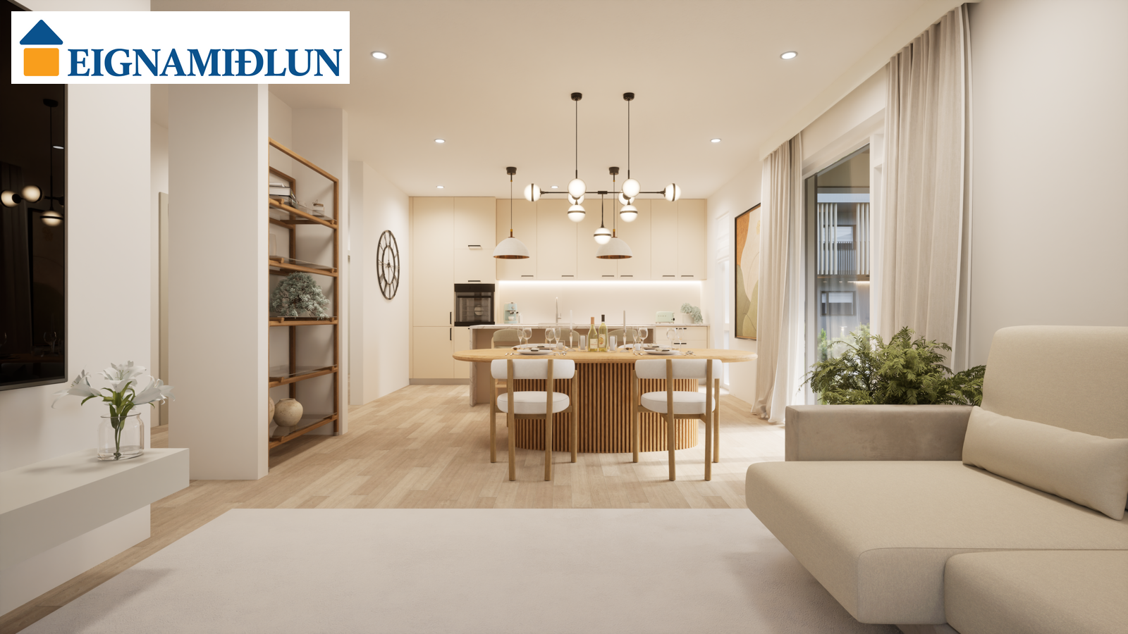 Eldhús: Eldhúsinnrétting með góðu skápaplássi frá Axis. Ofn í vinnuhæð, góð vinnuaðstaða með stórri vinnueyju. Innbyggður ísskápur og uppþvottavél.