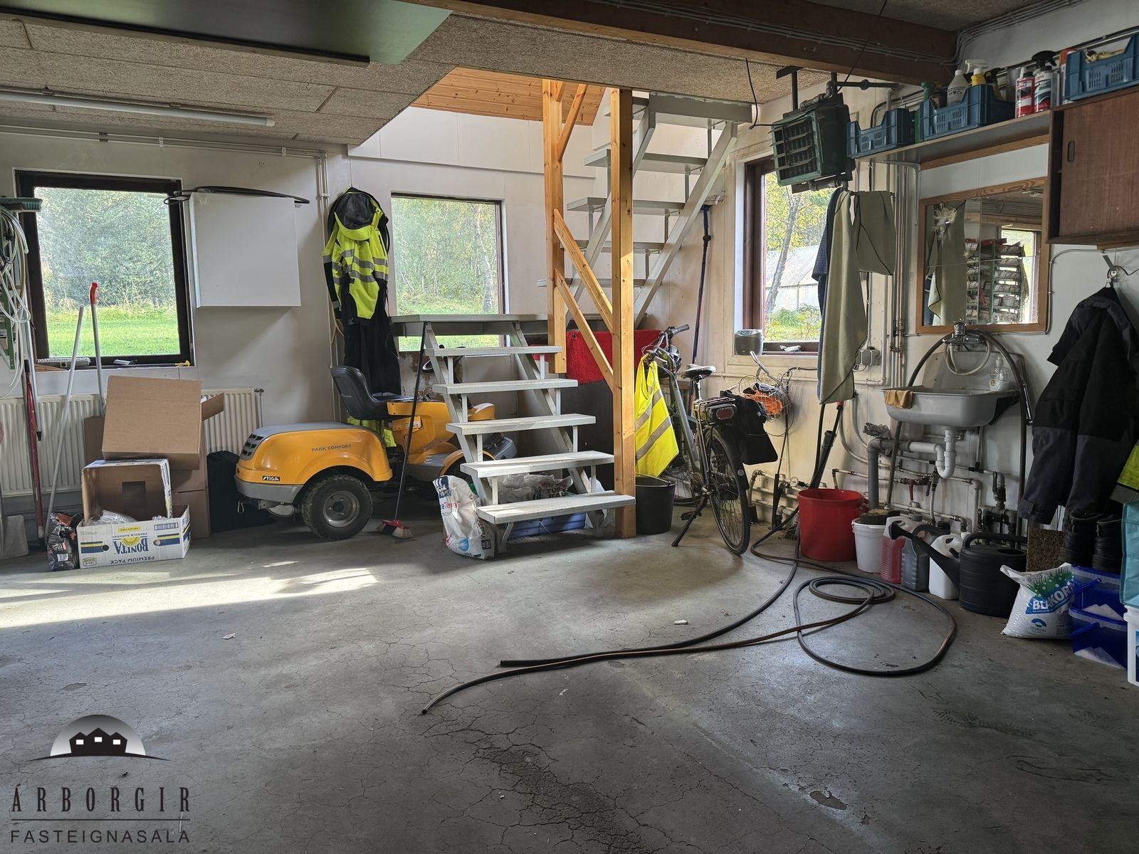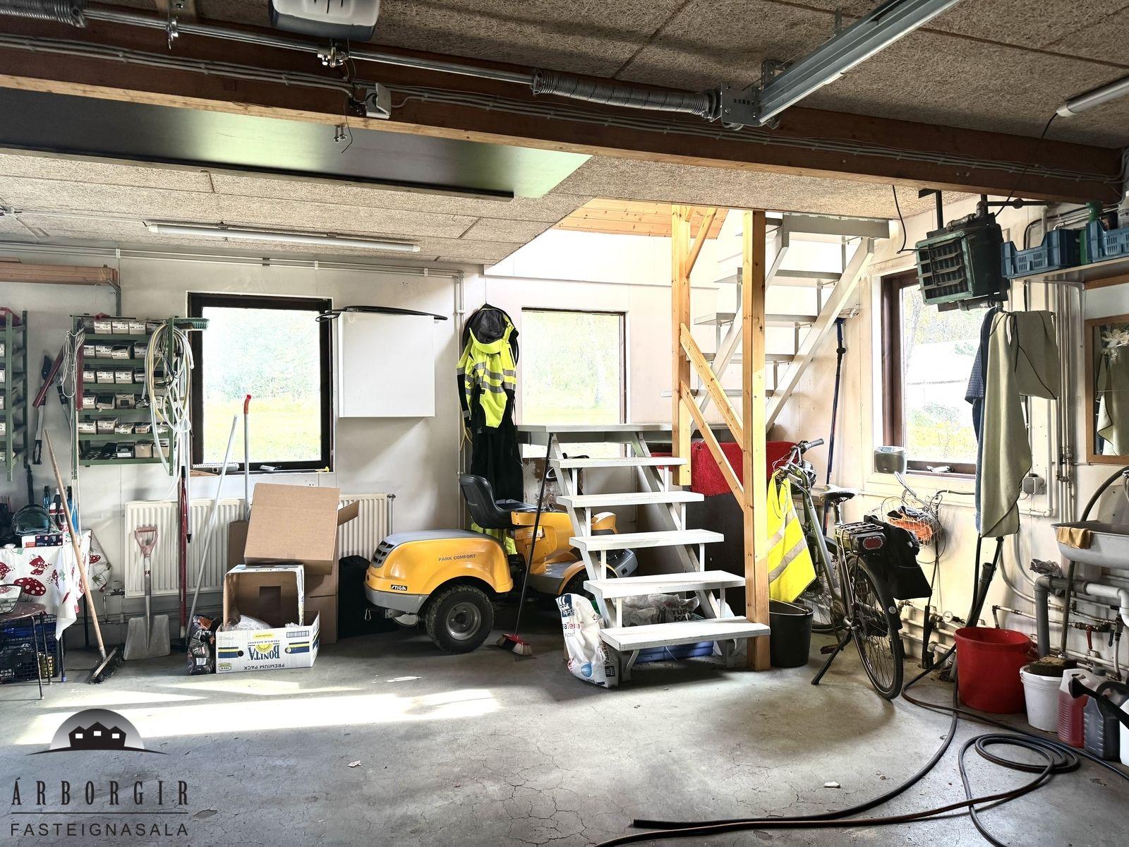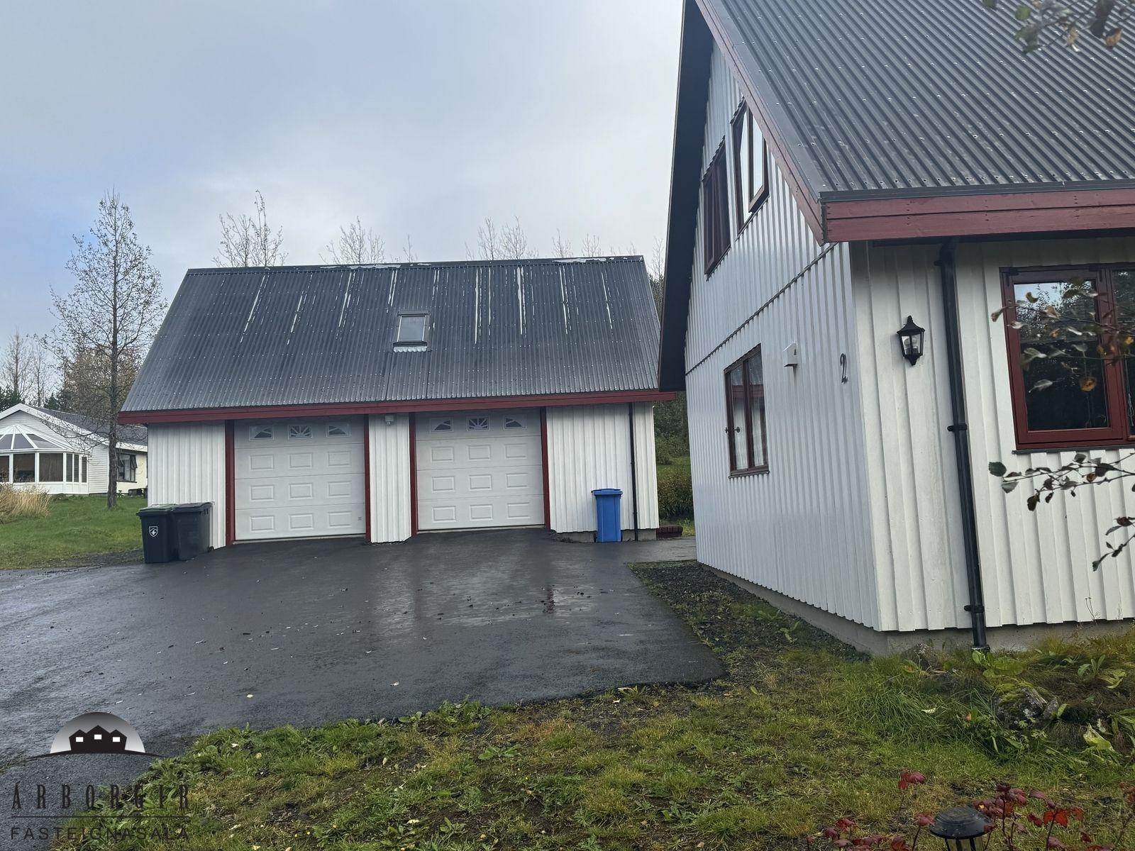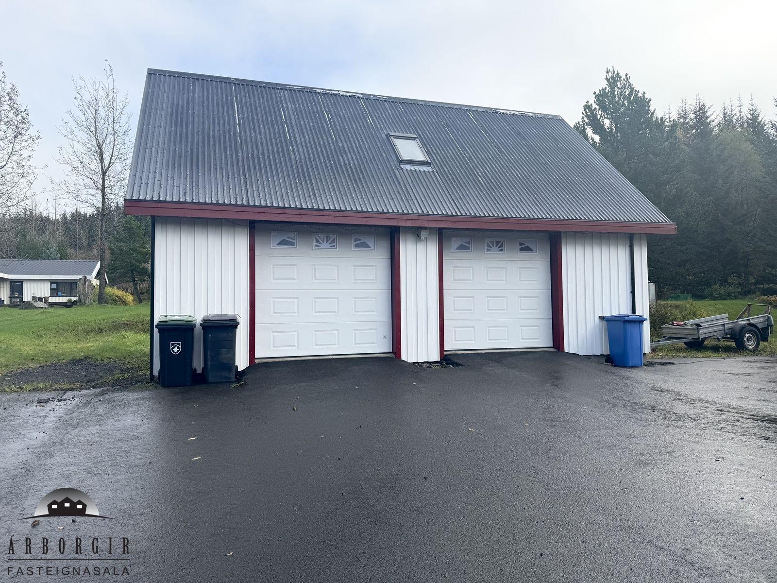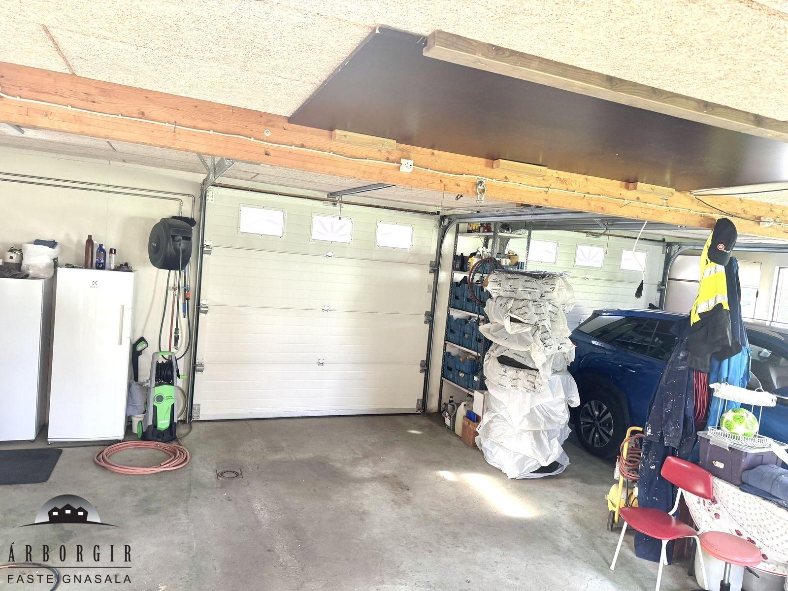 Bílskúrinn er sérbyggður 70m2 að stærð og eru tvær nýlegar innkeyrsluhurðir á honum. Skúrinn er fullbúinn að innan. Milliloft er yfir hluta skúrsins og er því skipt uppí herbergi og opið rými en milliloftið er ekki skráð í heildarstærð hússins.