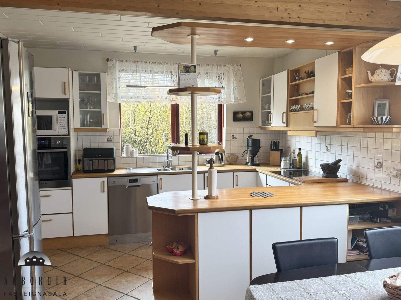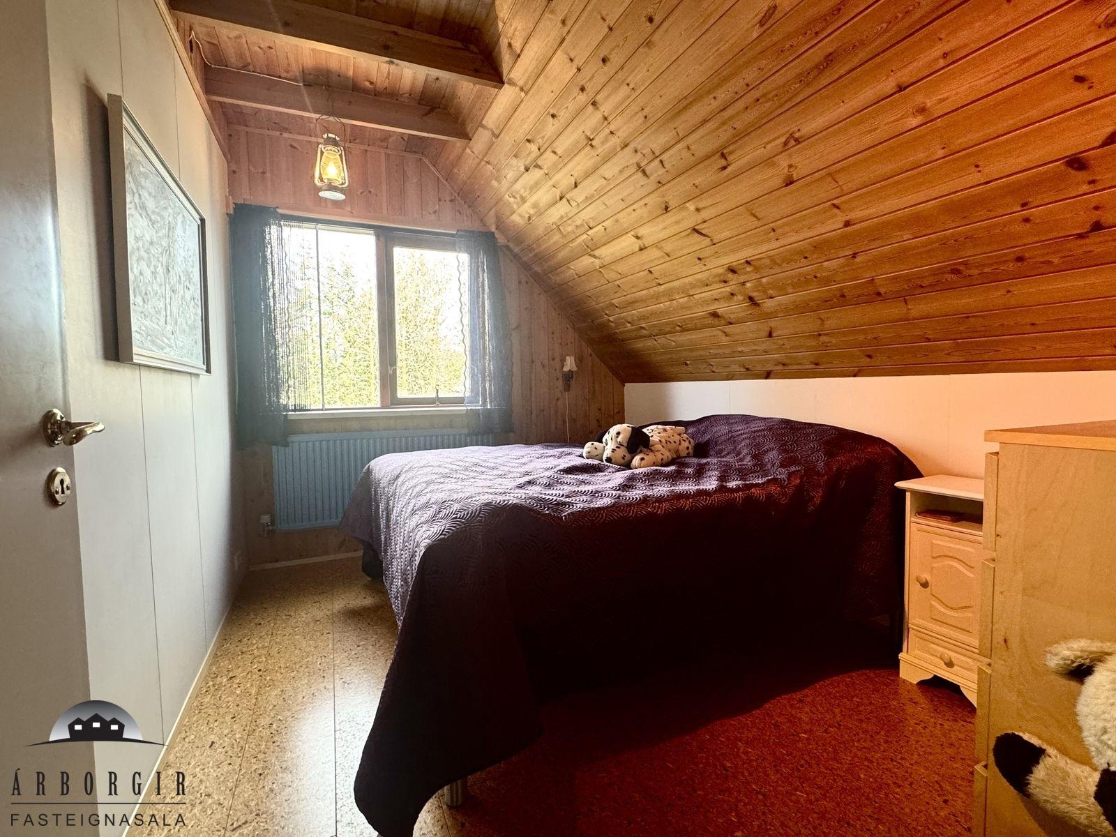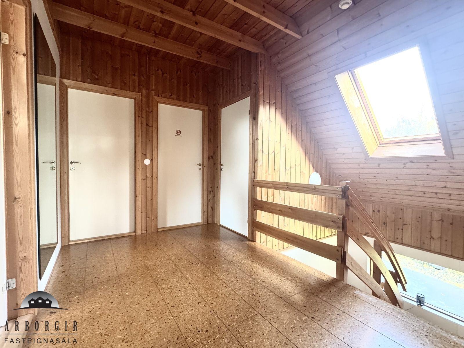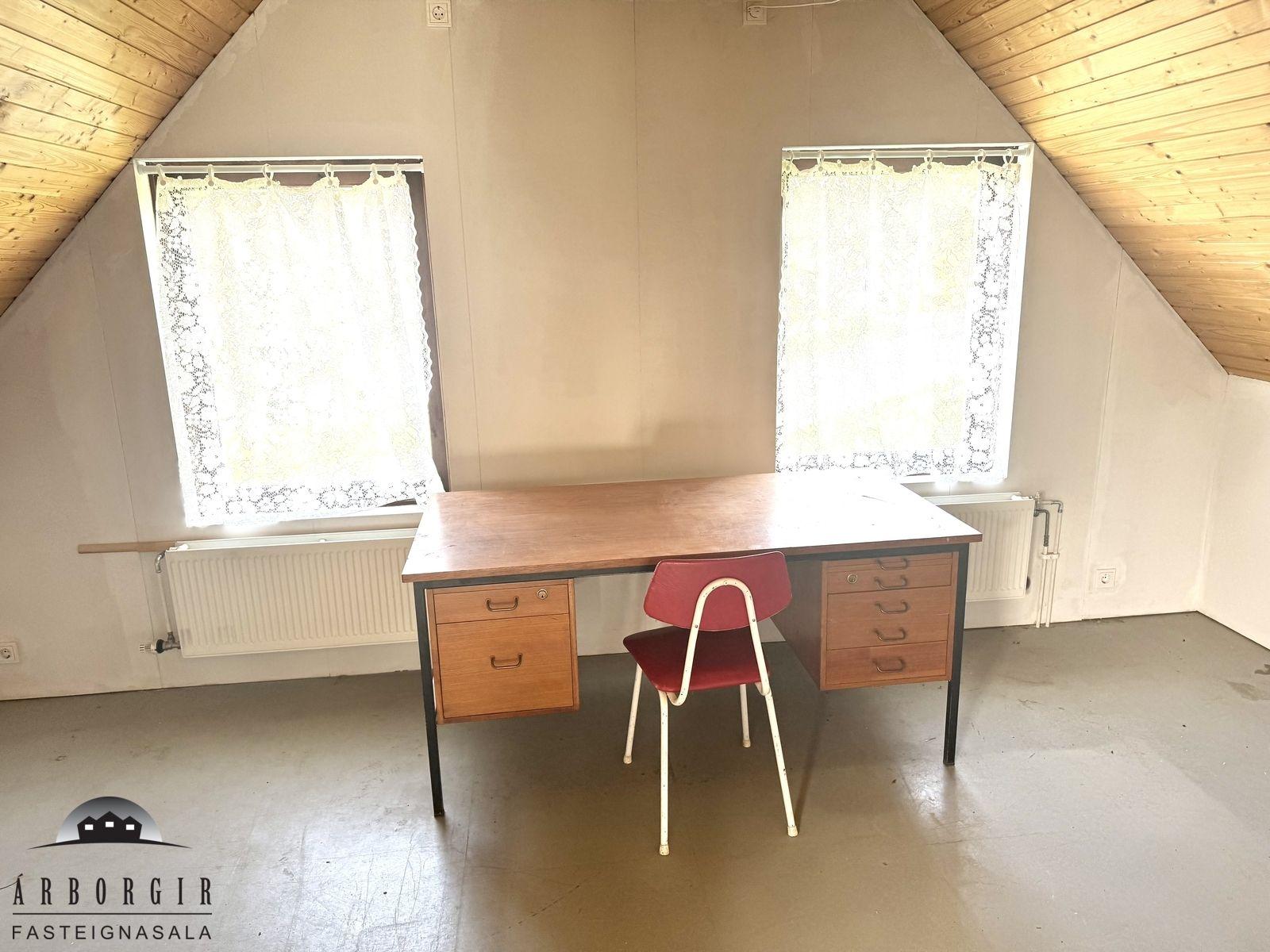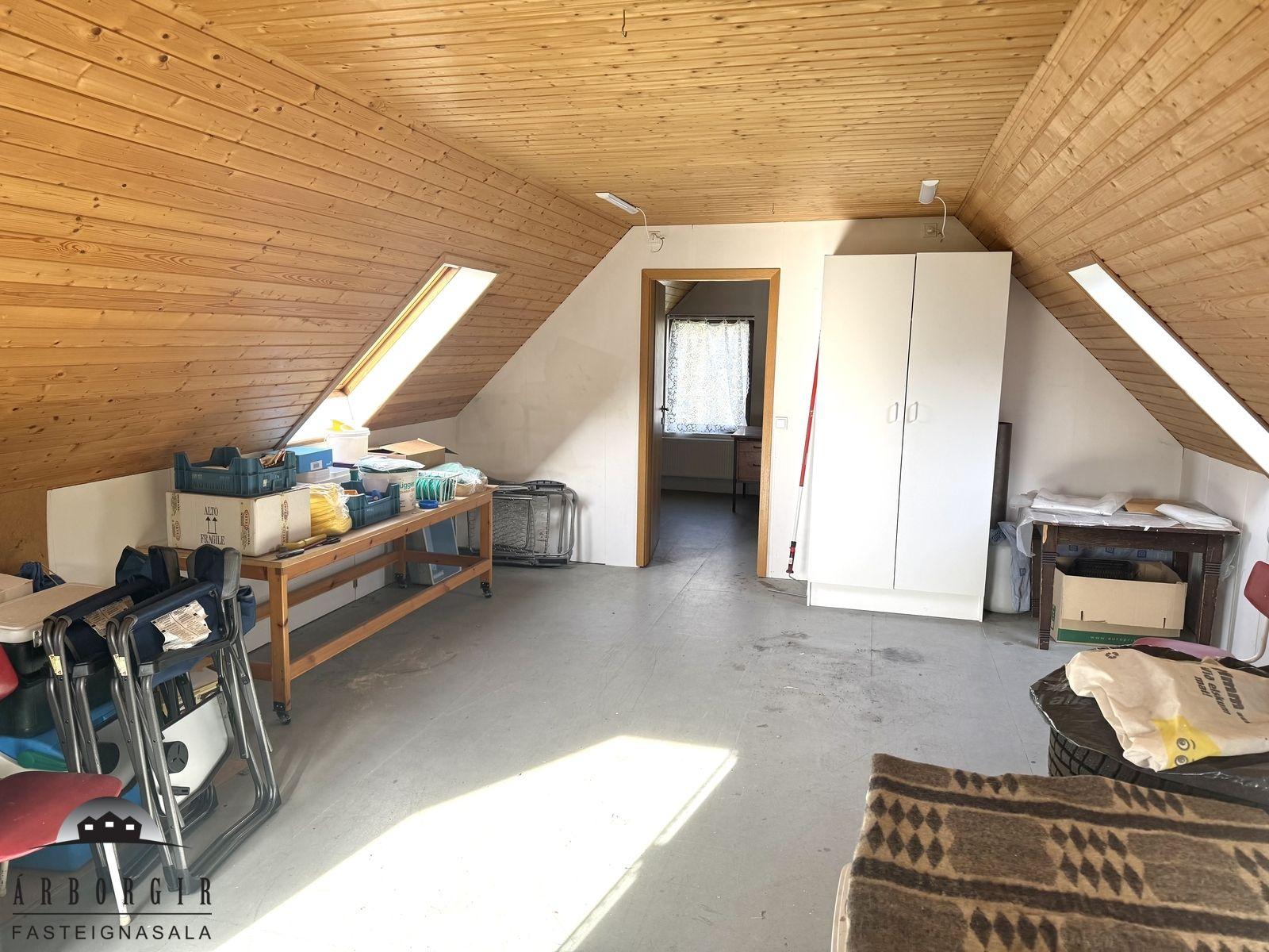 Bílskúrinn er sérbyggður 70m2 að stærð og eru tvær nýlegar innkeyrsluhurðir á honum. Skúrinn er fullbúinn að innan. Milliloft er yfir hluta skúrsins og er því skipt uppí herbergi og opið rými en milliloftið er ekki skráð í heildarstærð hússins.