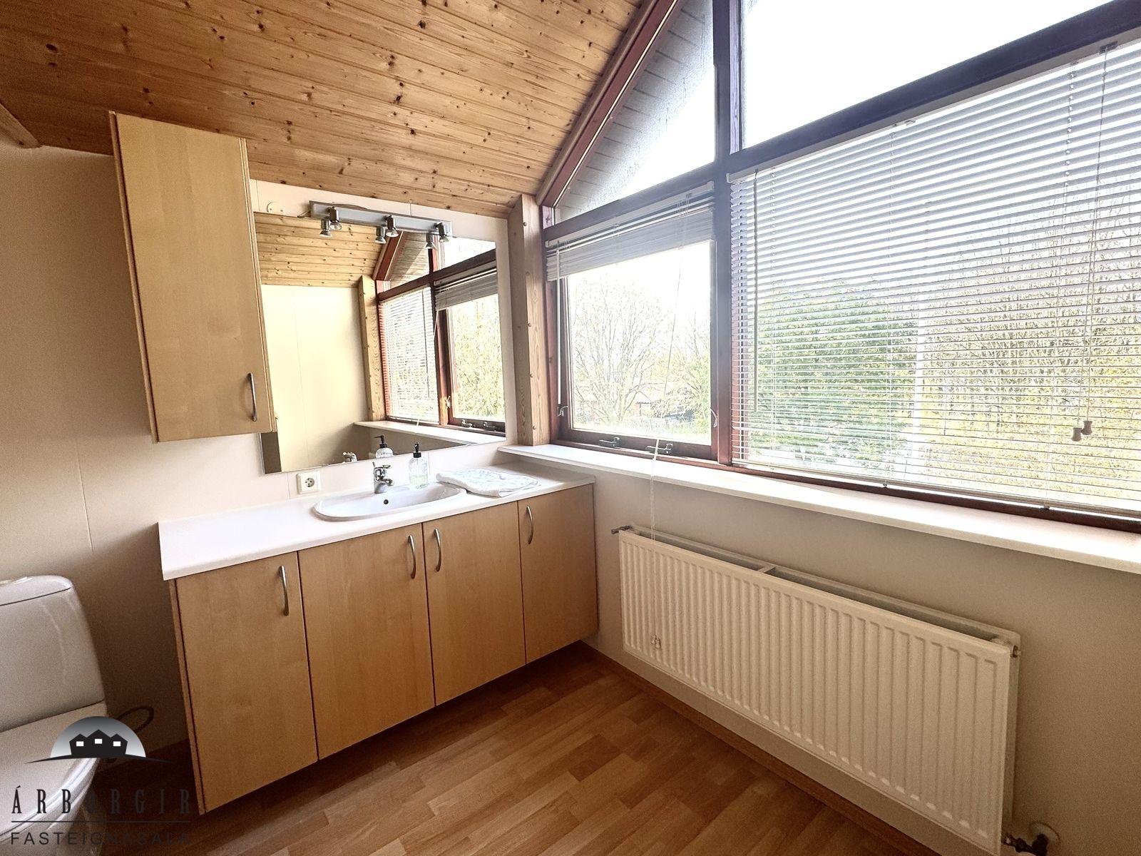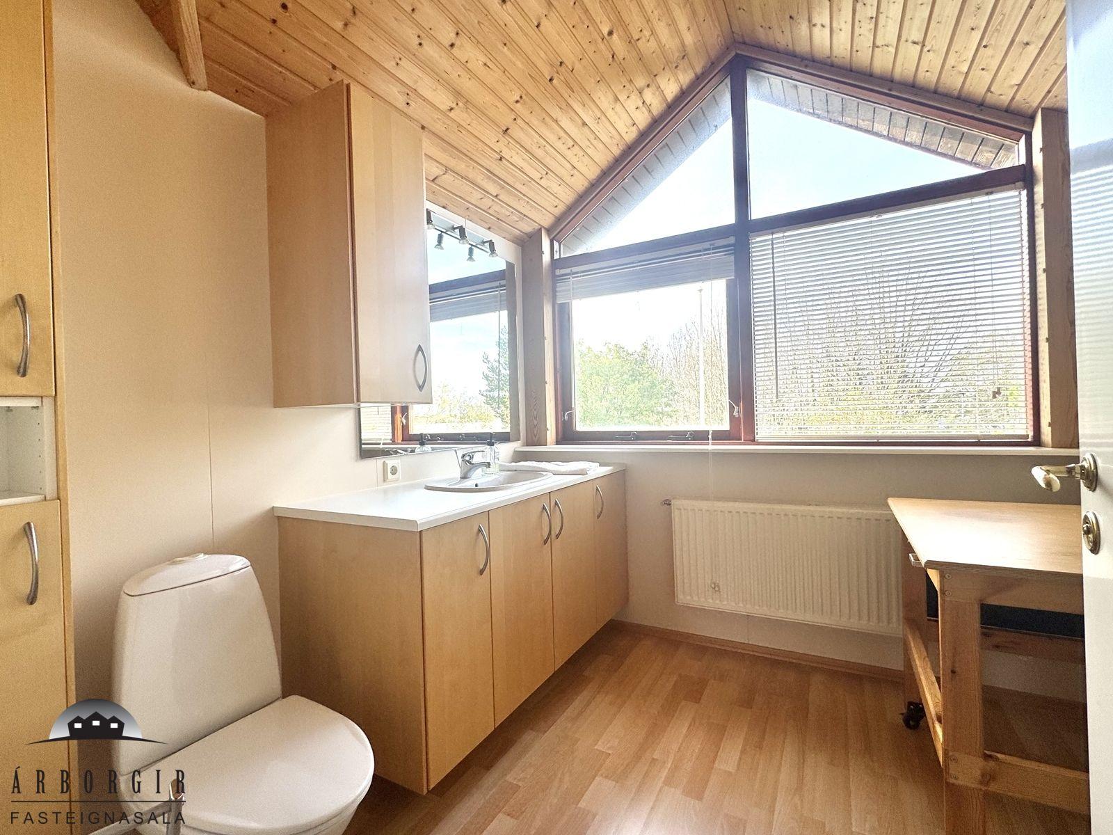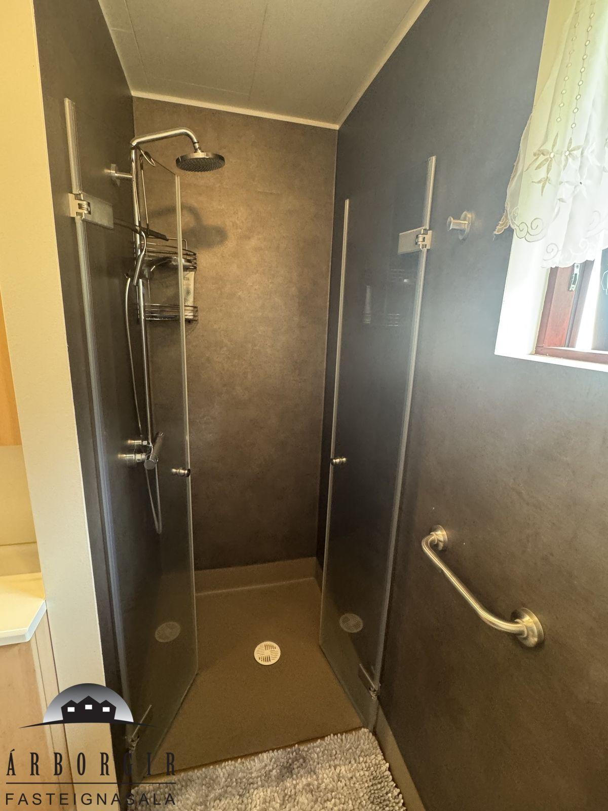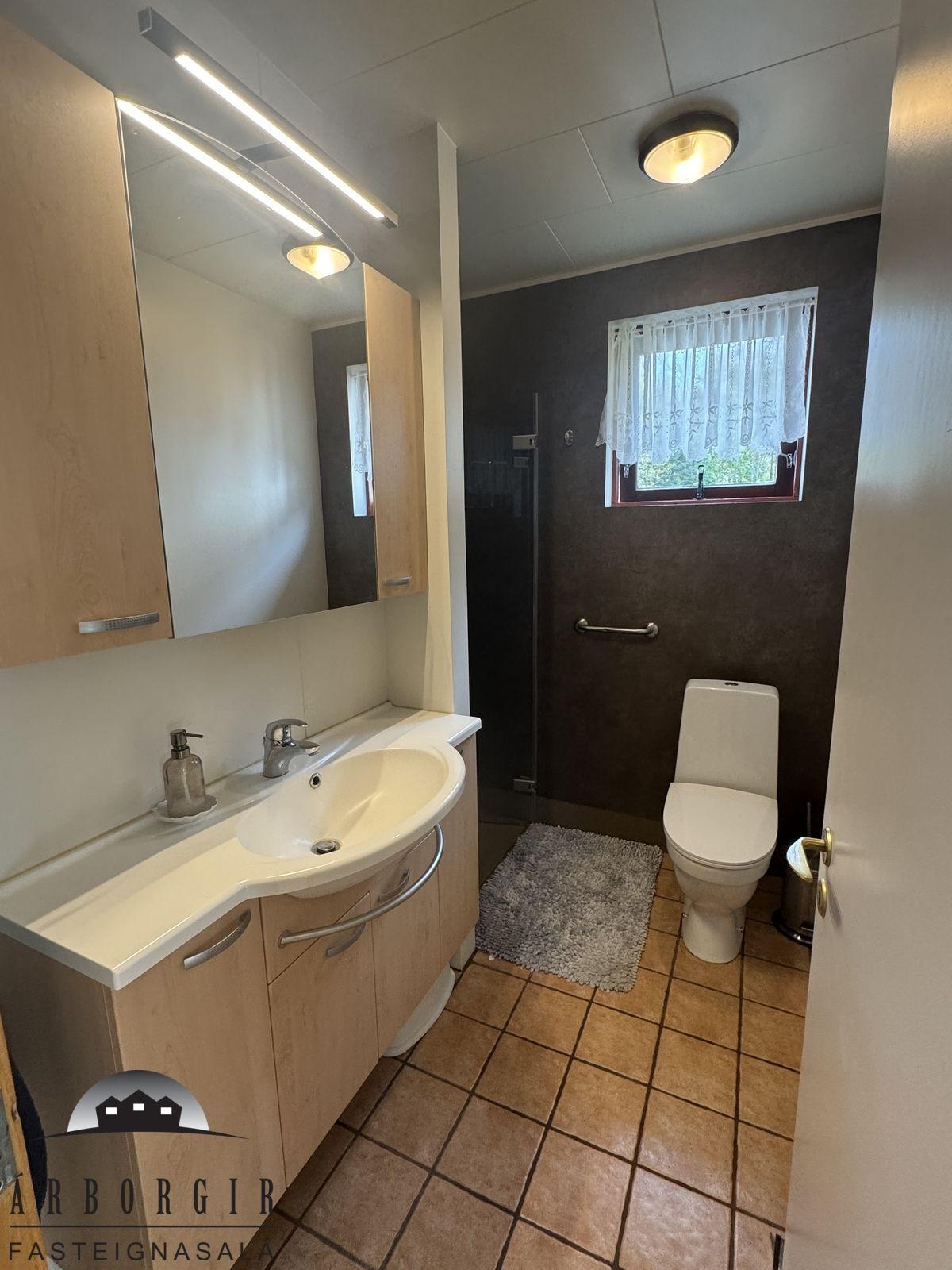 Baðherbergi er flísalagt en þar er er snyrtileg innrétting og góð sturta.