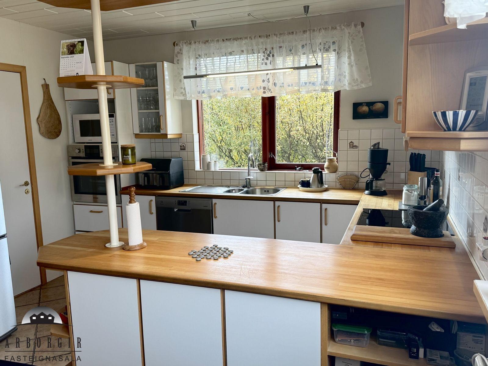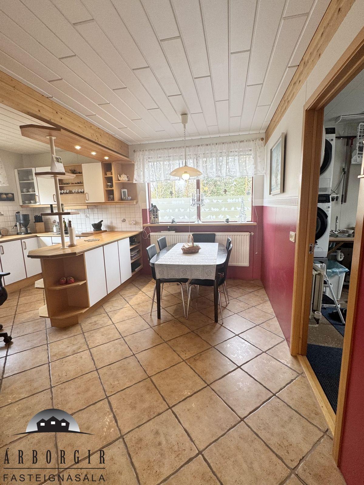 Eldhúsið er flísalagt og þar er snyrtileg eldri innrétting. Búr er innaf eldhúsi.