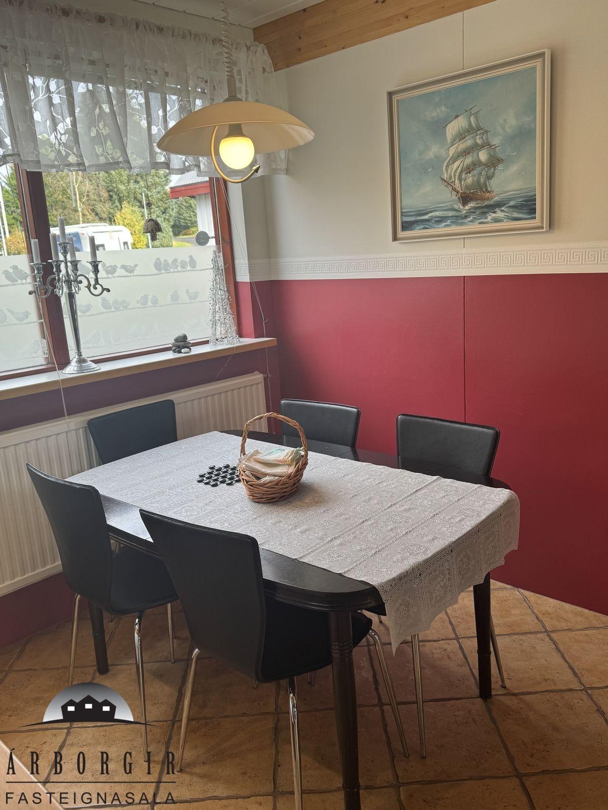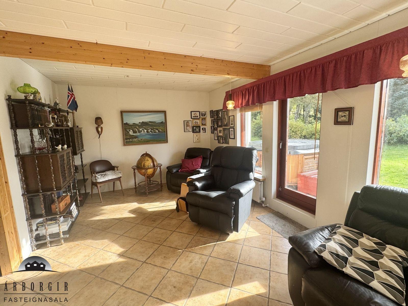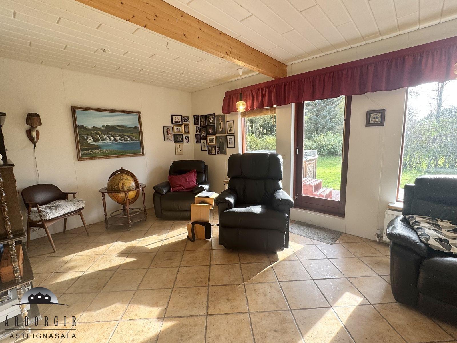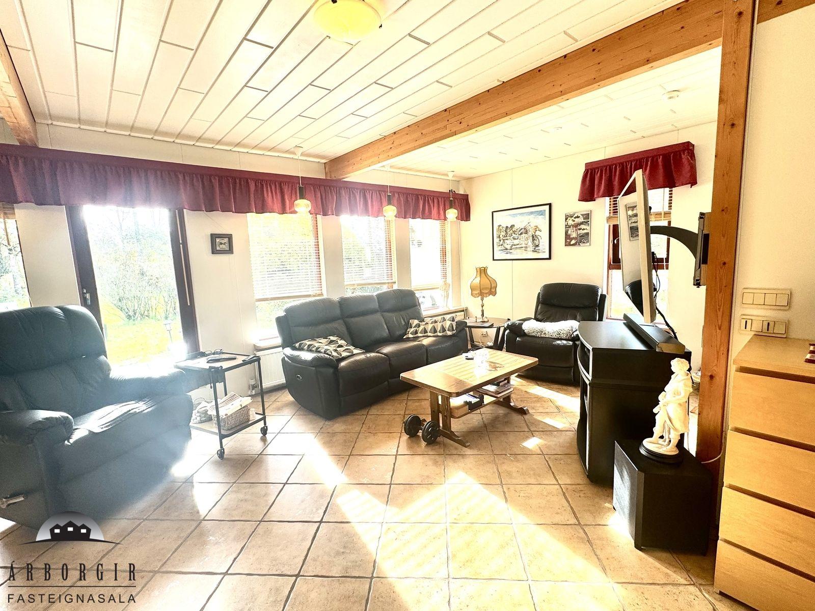 Stofan er rúmgóð, flísar eru á gólfi og þar er hurð út á sólpall.