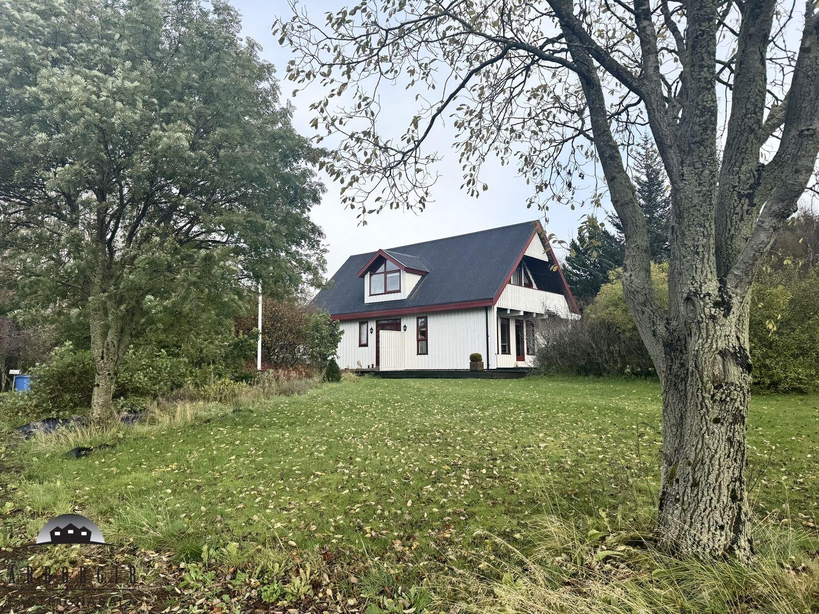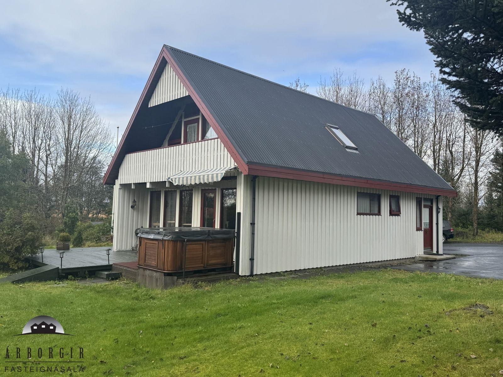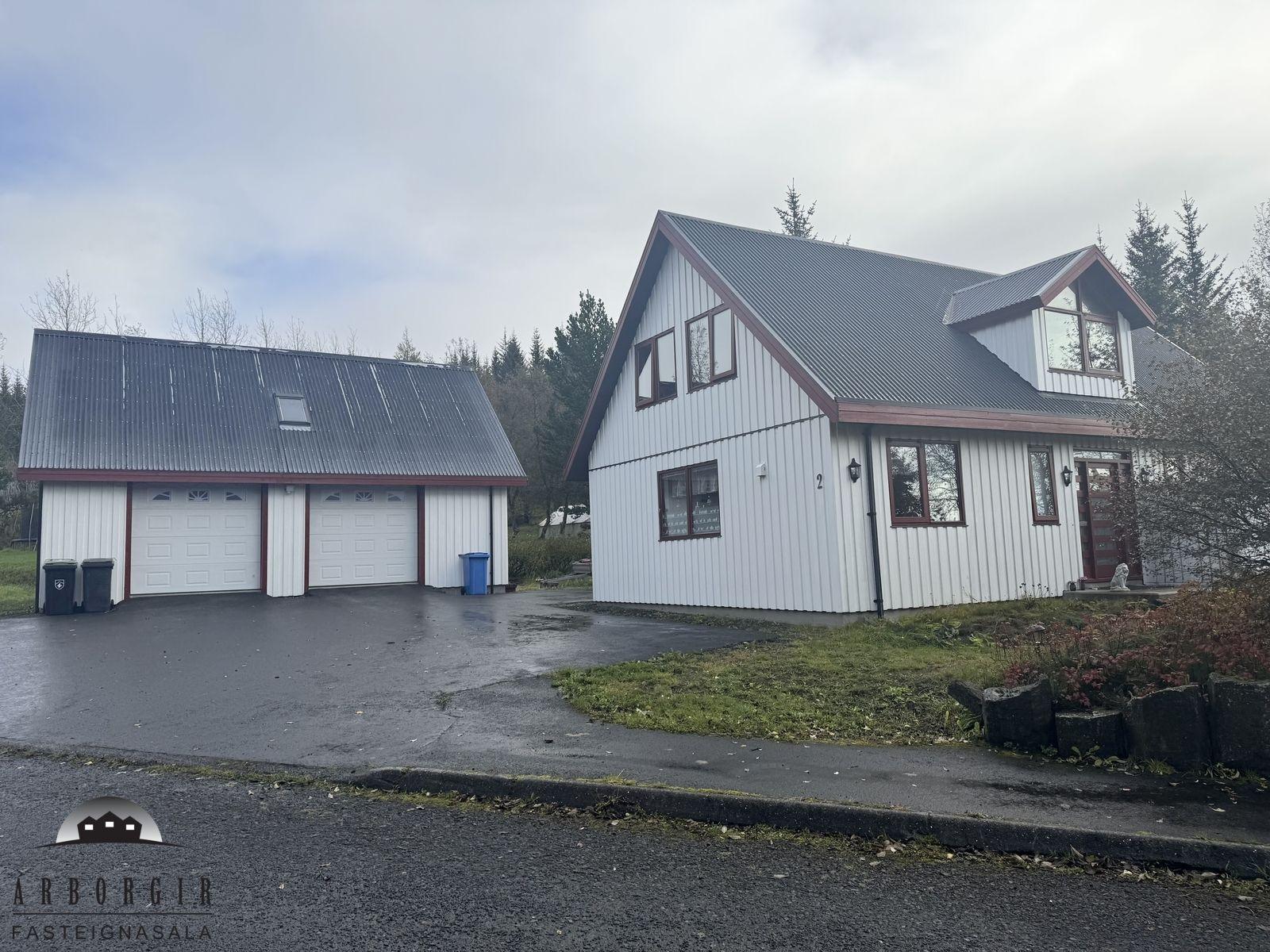 Reisulegt einbýlishús sem stendur á stórri lóð í grónu hverfi á Flúðum.Eignin er timburhús á tveim hæðum auk sérbyggðs bílskúrs samtals skráðið 201,3m2 að heildarstærð.