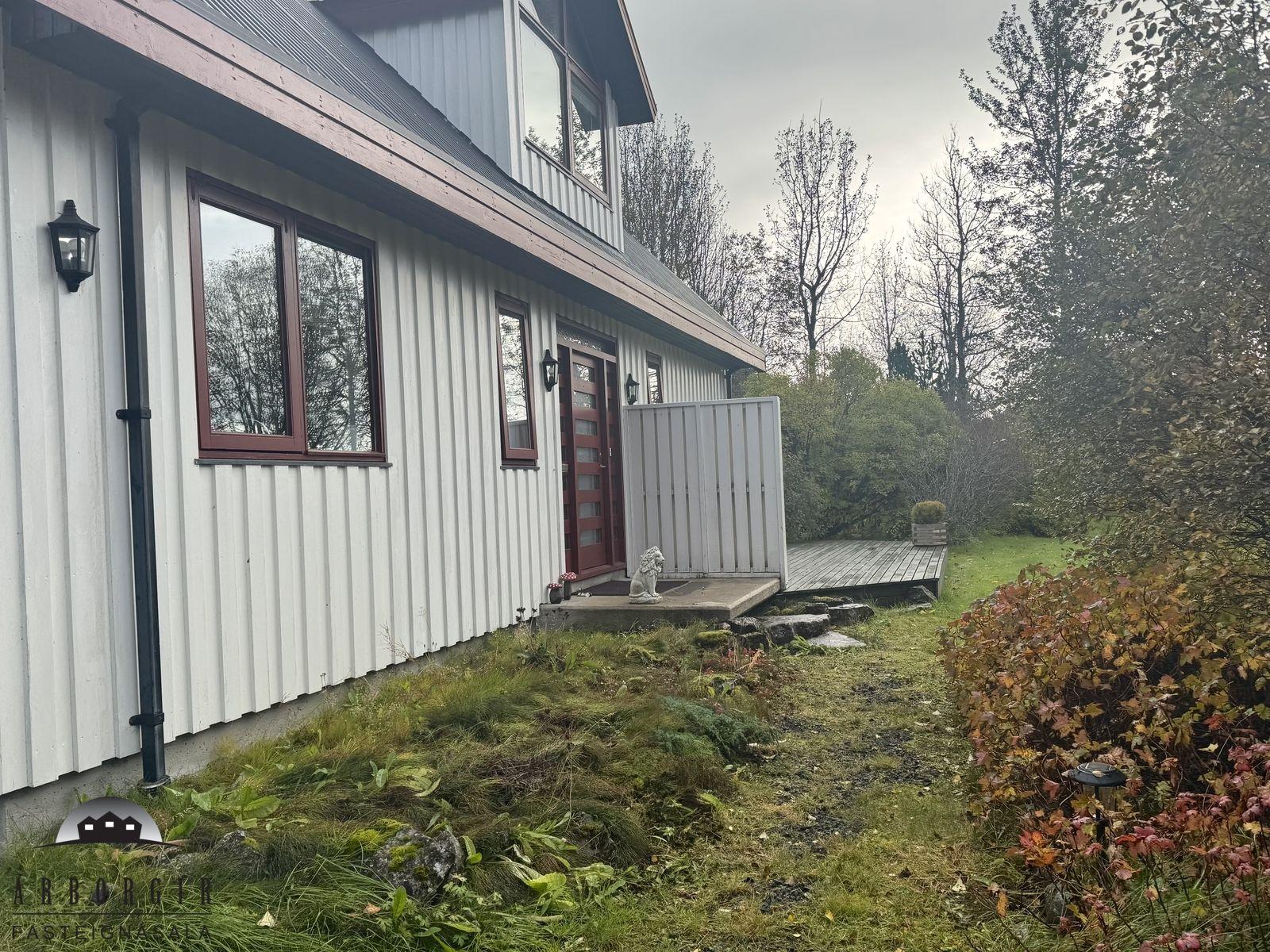 Húsið er klætt að utan með málaðri timburklæðningu, litað járn er á þaki.