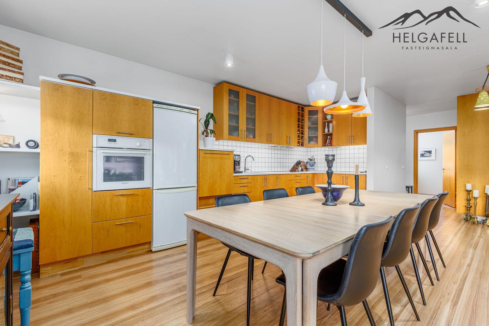Eldhús: Opið eldhús við stofu, upprunaleg, snyrtileg og góð innrétting úr elri. Flísar milli efri og neðri skápa, span helluborð, ofn í vinnuhæð, uppþvottavél og gott skápapláss.