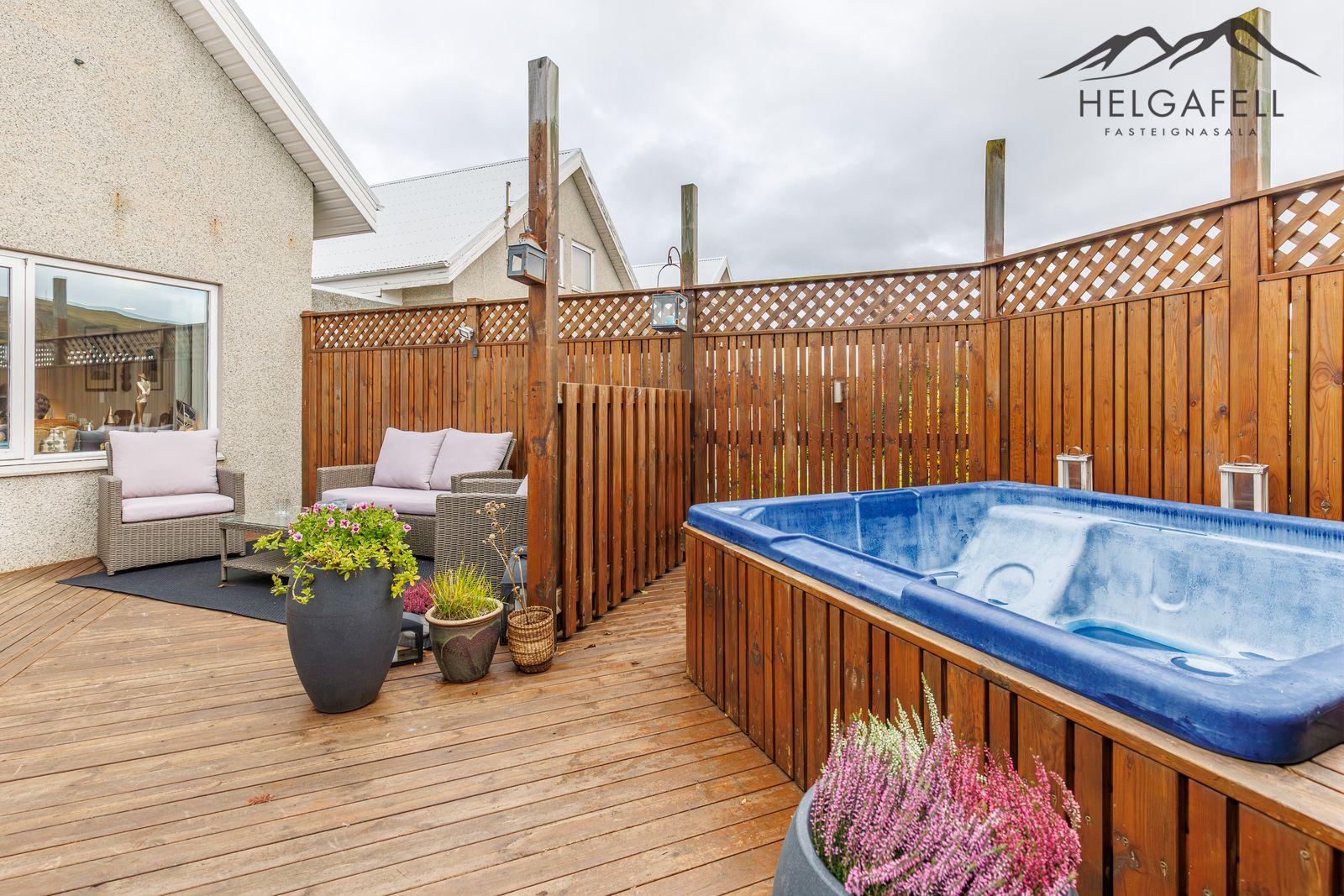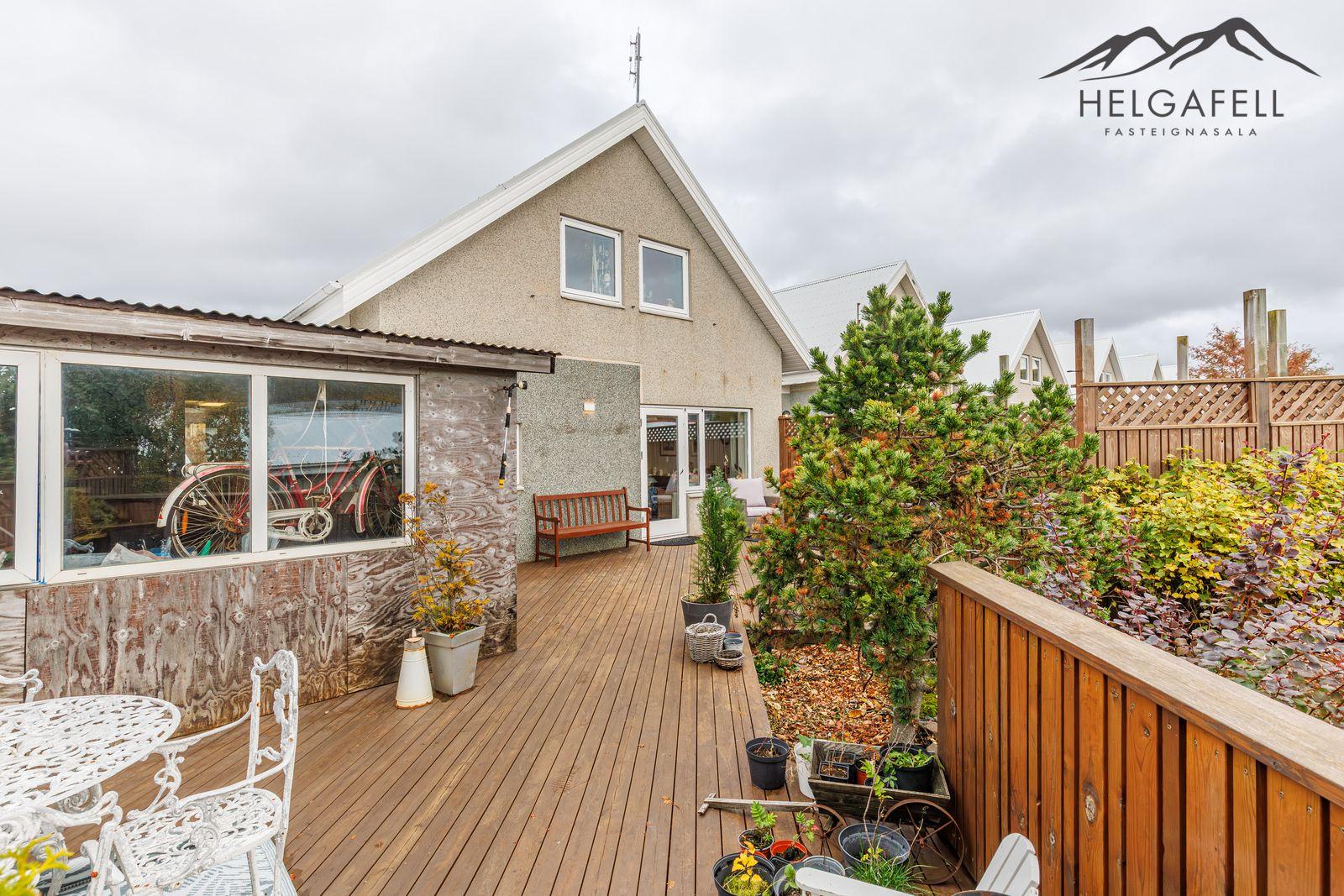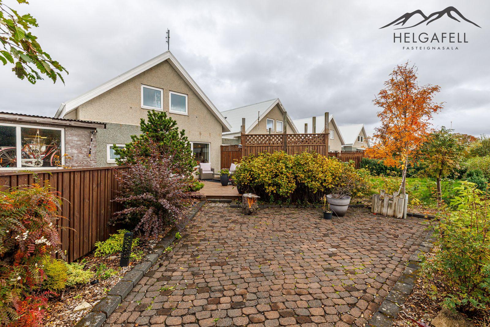 Fallegur, afgirtur pallur til suðurs. Í framhaldi af pallinum er svo búið að helluleggja garðinn sem þarfnast ekki mikillar umhirðu. Falleg blómabeð og ekkert gras til að slá. Fyrir framan bílskúr er hellulagt plan með snjóbræðslu.Fallegt, staðsteypt og steinað með kvarsi fjölskylduhús á mjög eftirsóttum stað í Mosfellsbæ. Skóli, leikskóli og sundlaug í næstu götu. Golfvöllurinn í göngufæri eða í ökufæri á golfbíl.