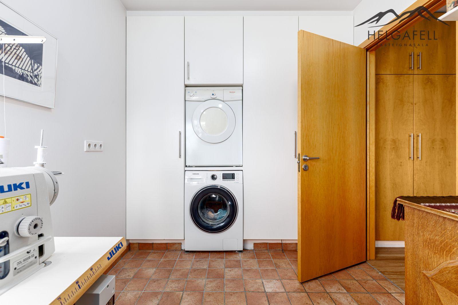 Þvottahús: Rúmgott, flísar á gólfi, innrétting fyrir þvottavél og þurrkara ásamt skápum og ræstivask.
