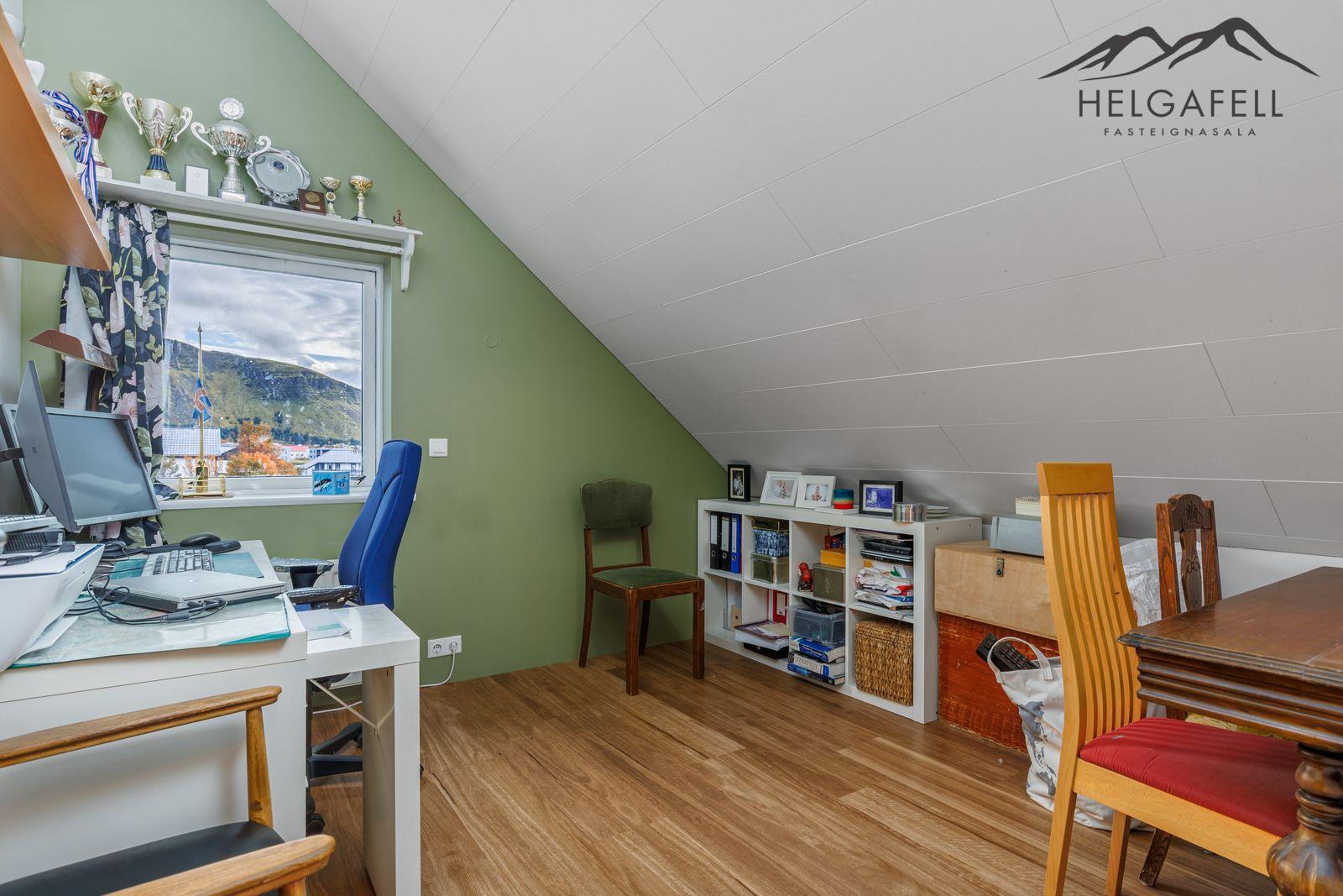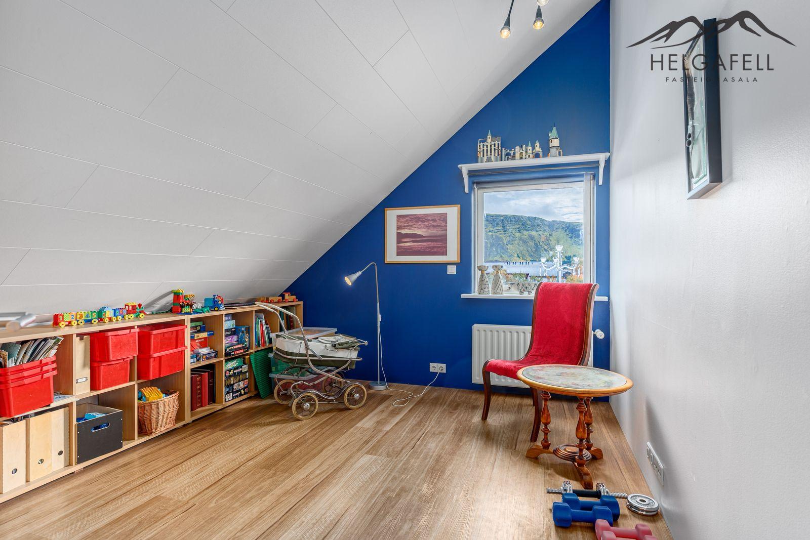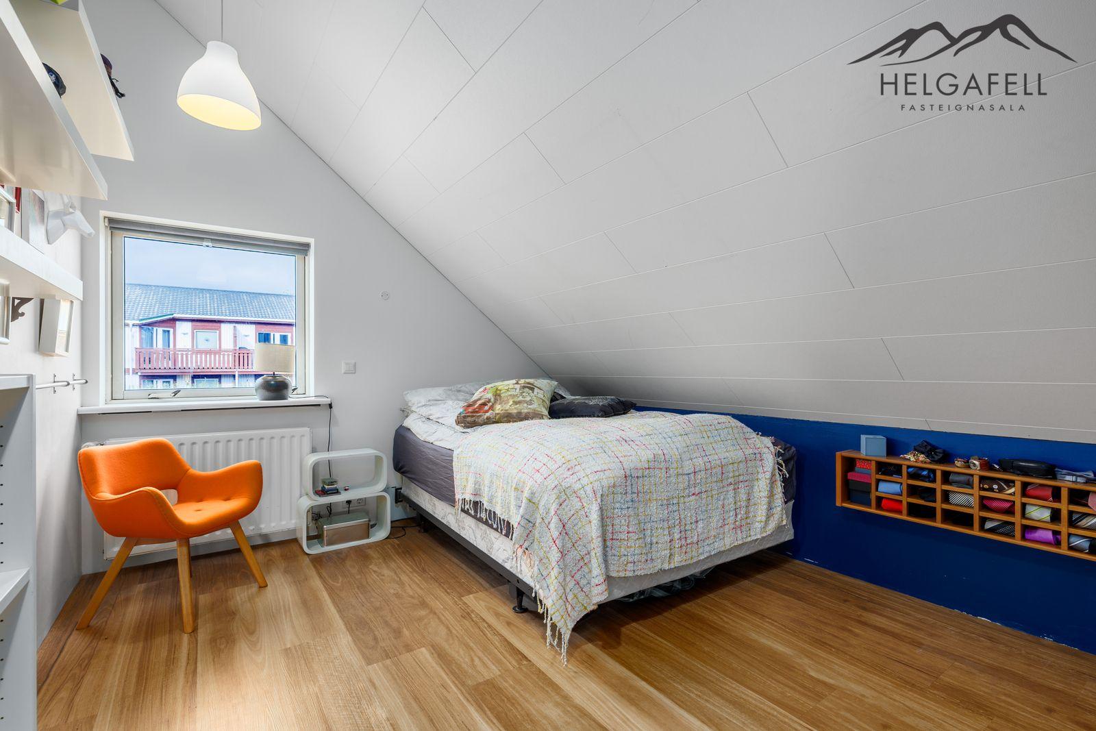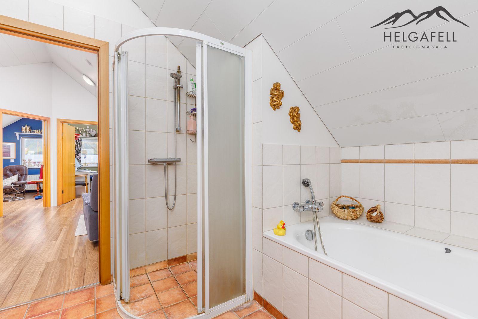 Efri hæð, hol, þrjú svefnherbergi og baðherbergi. Gólfflötur á efri hæð er u.þ.b. 12fm. meiri en 66,6fm., þar sem hluti af efri hæðinni er undir súð.