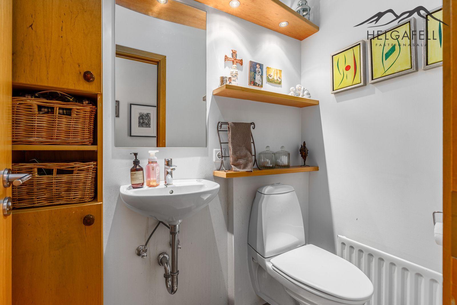 Gestasalerni: Á hægri hönd úr anddyrinu er gestasalerni með handlaug og innréttingu.