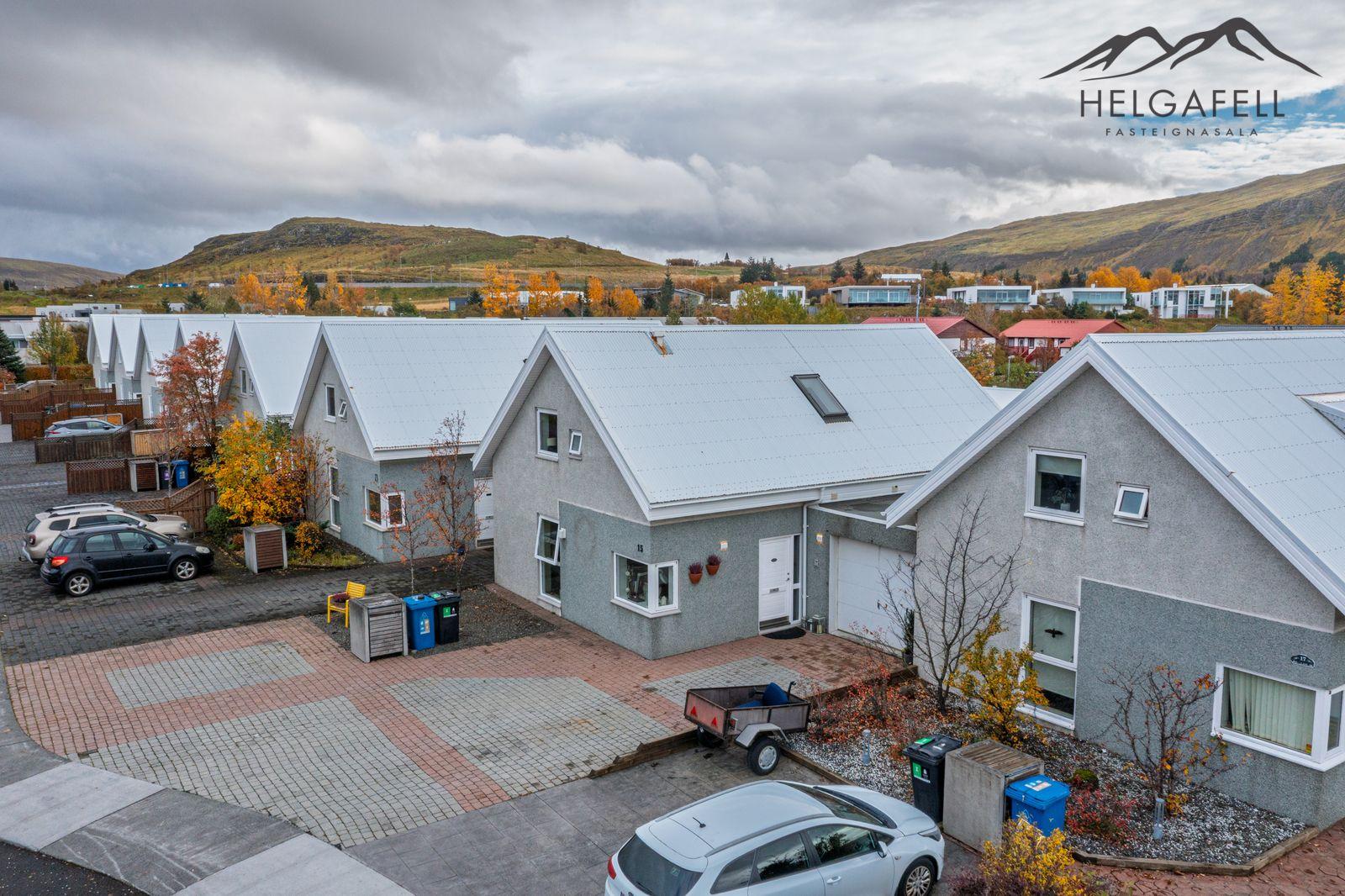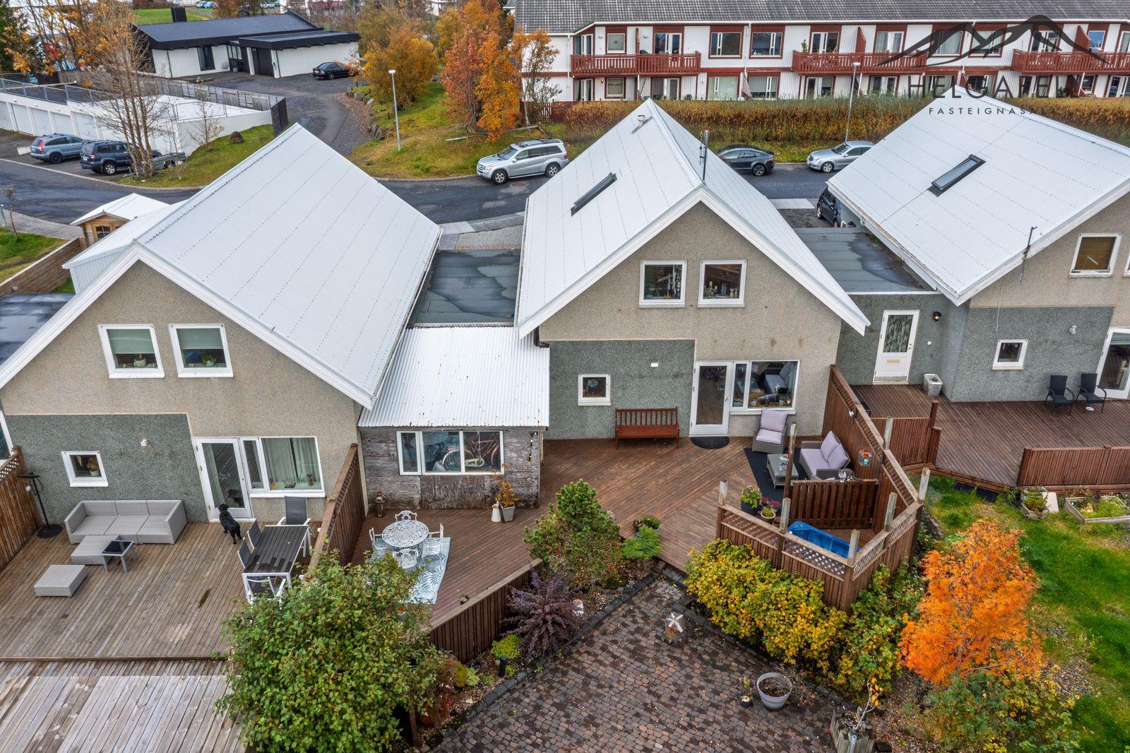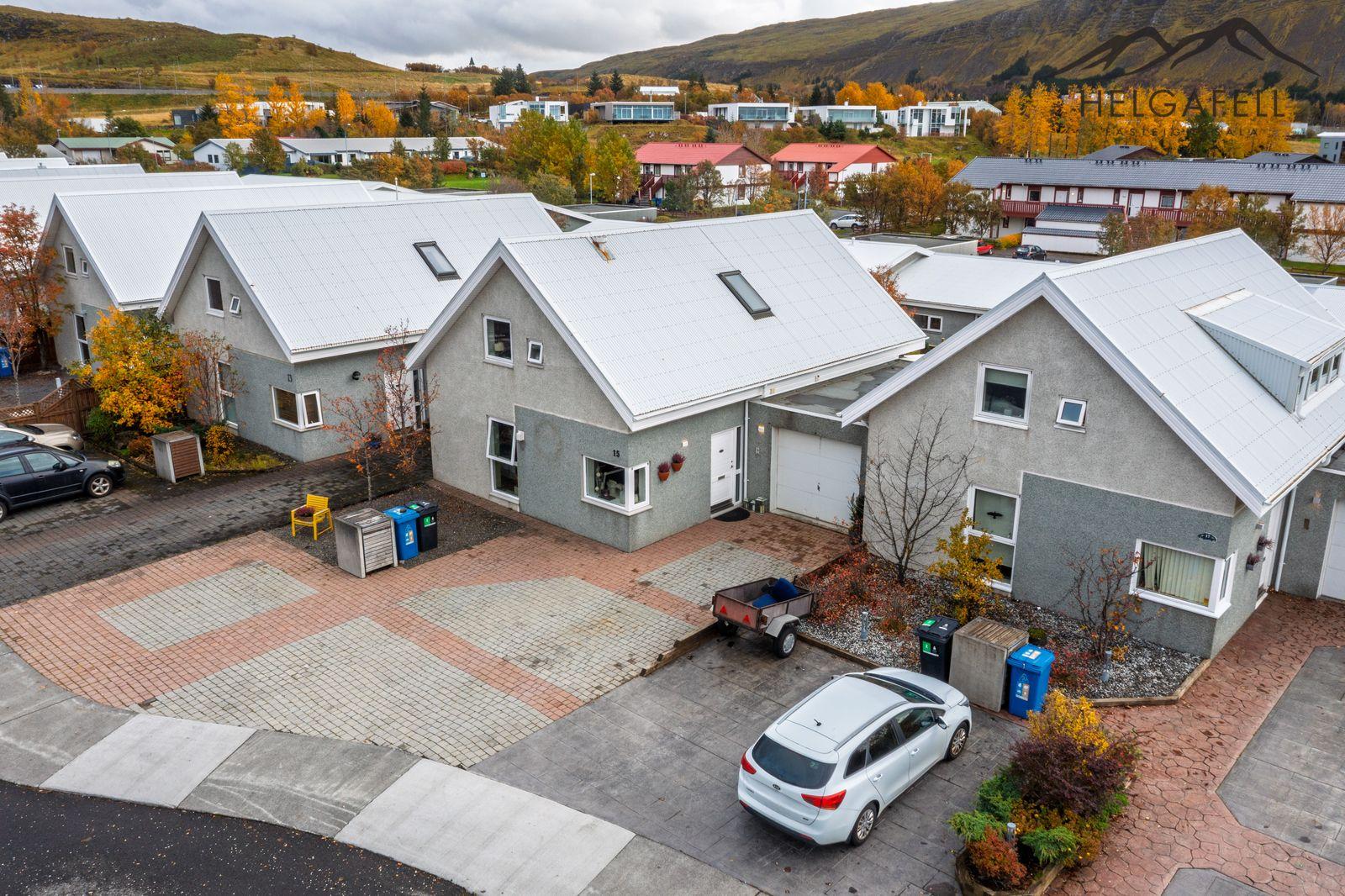 Stór verönd með heitum pott og hellulagt bílaplan með snjóbræðslu eru við eignina. Neðri hæð - stofa/borðstofa, eldhús, svefnherbergi, þvottahús og gestasalerni.
