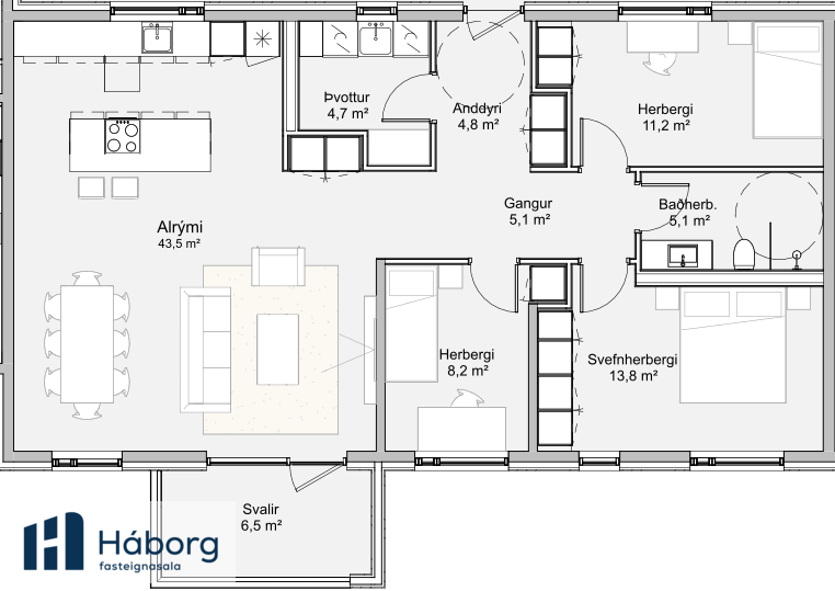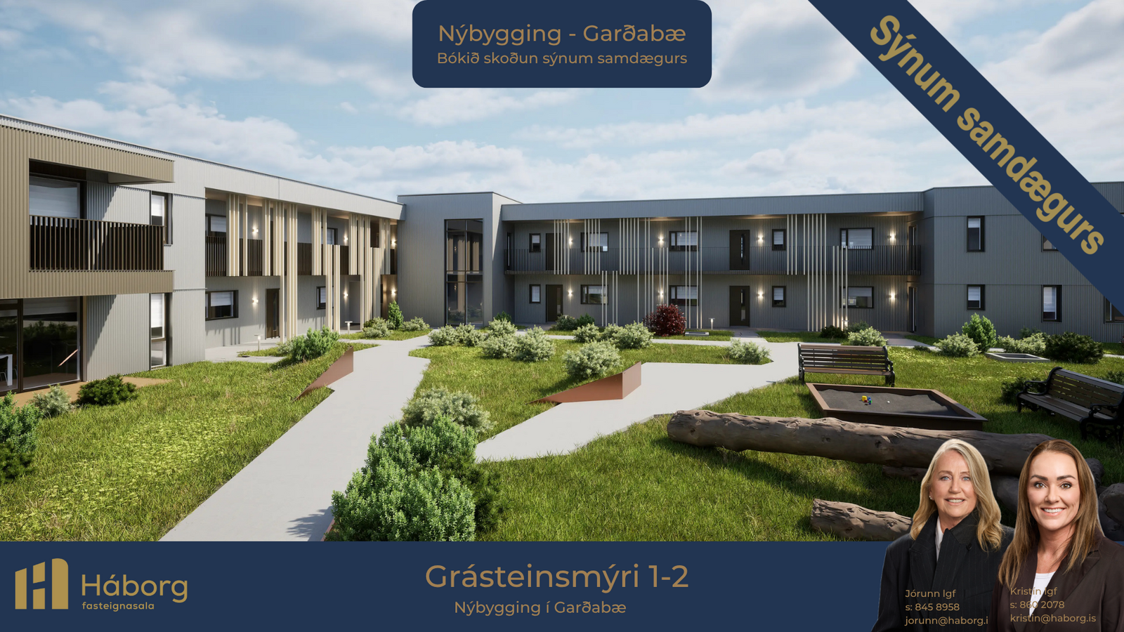 Háborg fasteignasala kynnir Grásteinsmýri 1, Garðabæ. Nýbyggingin er staðsteypt, einangruð að utan og klædd með ál- og bambus klæðningu. Góðar 2ja, 3ja 4ra og 5 herbergja íbúðir í litlu fjölbýli með lyftu. Útsýni er úr flestum íbúðum og timbur-verönd fylgir íbúðum á 1. hæð. Íbúðirnar afhendast án megin gólfefna en baðherbergi eru flísalögð að hluta. Næg bílastæði á lóð. Áætluð afhending íbúða er í mars-apríl 2026.Sölusíða GrásteinsmýriNýr valkostur í fjármögnun. Kaupendur geta nýtt sér nýjan sjóð Öxar 20 sem styður þá með því að fjárfesta með þeim allt að 20% af kaupverði. Kynntu þér málið hér Öxar.isNánari lýsing á íbúð 305 4ra herbergja: Stærð 120,4 fm. Sérinngangur af svölum. Þegar komið er í forstofu eru góðir fataskápar. Barnaherbergi er rúmgott og bjart með góðum fataskápum. Hjónaherbergi er einnig rúmgott og bjart með góðum fataskápum. Baðherbergi er með glugga og góðri snyrtiaðstöðu. Einnig er aðstaða fyrir þvottavél og þurrkara á baði. Alrými er mjög rúmgott og bjart með opið eldhús með eyju sem hægt er að sitja við. Stofur eru rúmgóðar og bjartar. Úr alrými og stofu er útgengt á timbur-verönd (suðvestur) 17,2 fm að stærð. Snýr að inngarði. Eigninni fylgir stæði í bílakjallara merkt B08 og geymsla að stærð 8,7 fm.Nýjar, bjartar og vandaðar íbúðir með góðri lofthæð, þar sem náttúra, ró og nútímaleg hönnun mætast.Innréttingar í íbúðum: AXIS innréttingar í litnum CashmereGrey. AEG innbyggð heimilistæki, ísskápur, uppþvottavél, helluborð og bakarofn. Baðherbergi eru flísalögð að hluta með 60×60 Patch Beige flísum (Ragno). Grohe blöndunartæki eða sambærileg. Egill Árnason hurðir, lamir og hurðabúnaður.