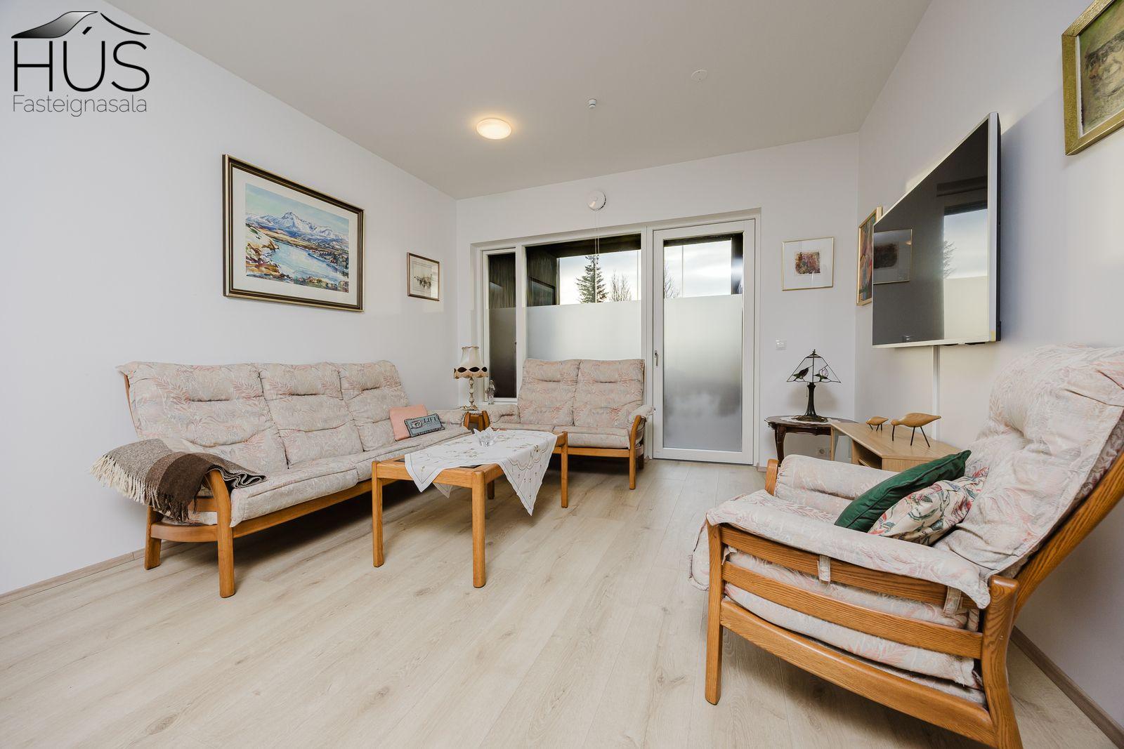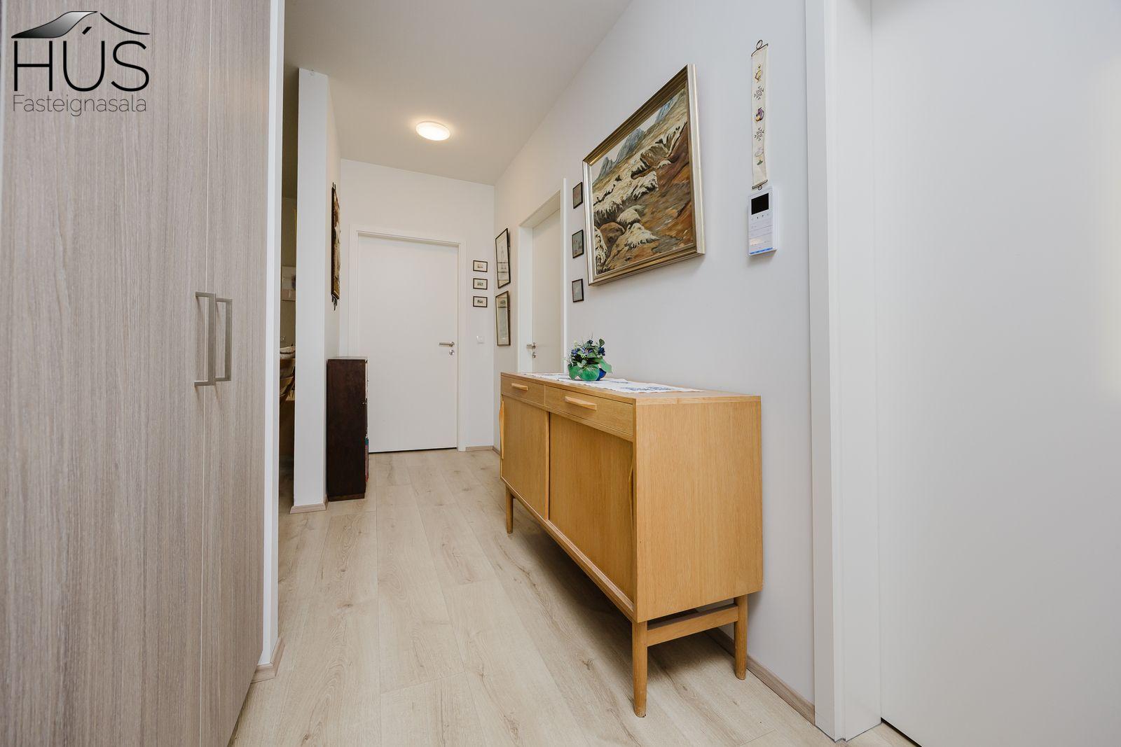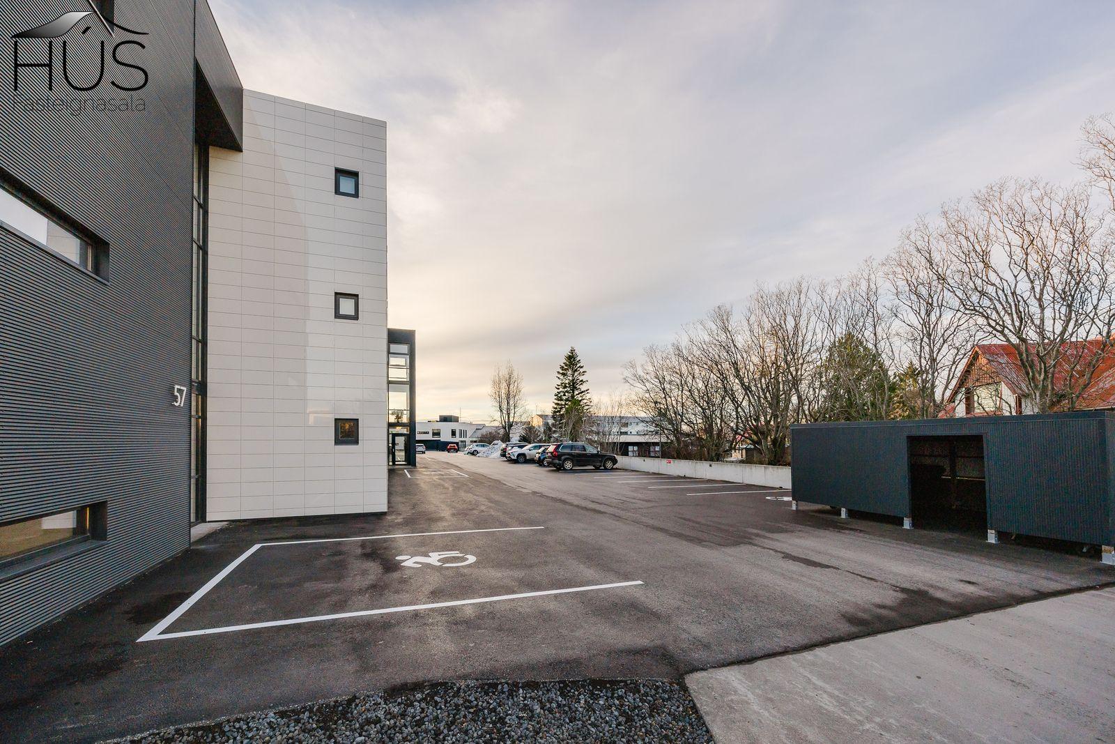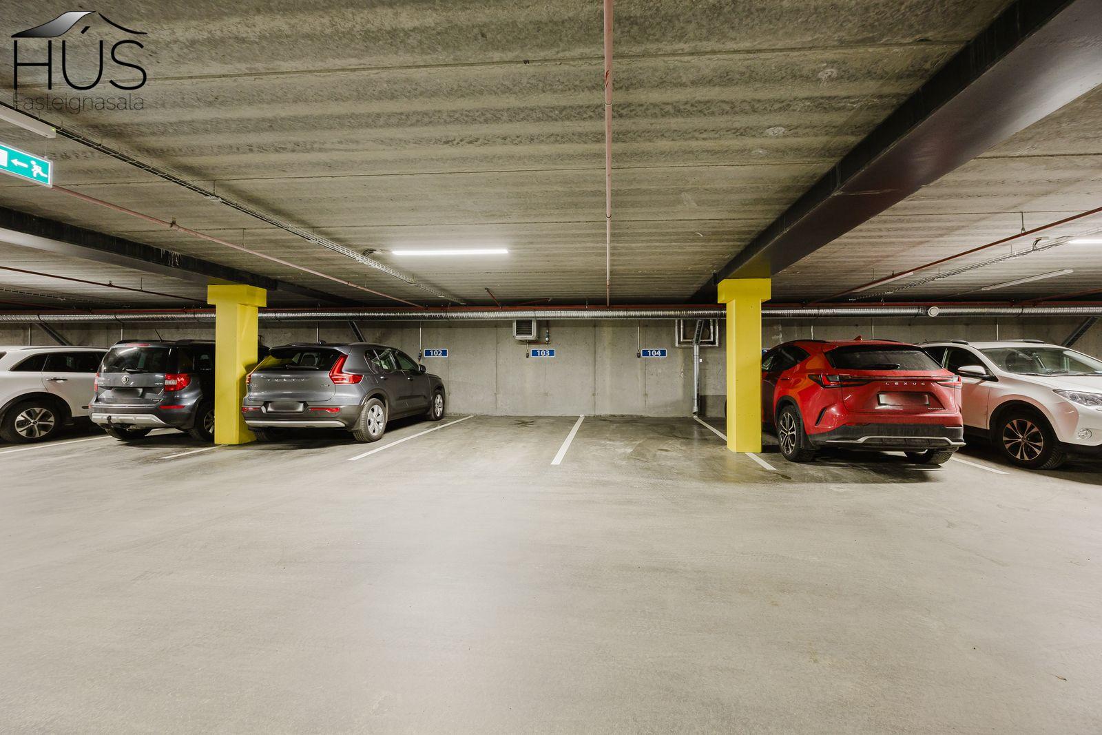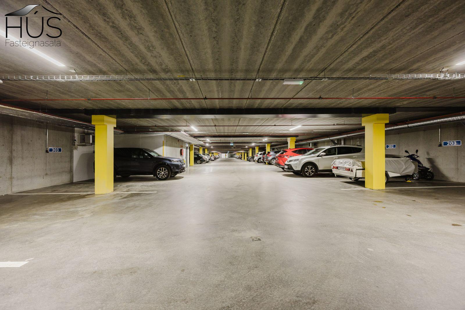 Sér bílastæði í upphituðum kjallara. Rafmagnstengill fyrir hleðslustöð. Rafmagnsopnun á innkeyrsluhurð.