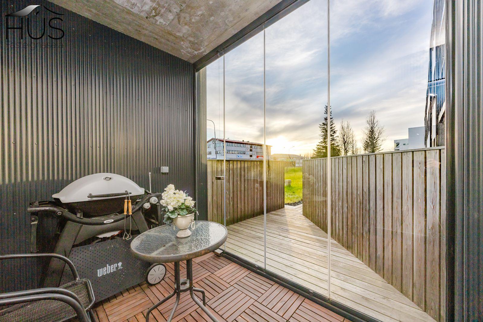 Úr stofu er útgengt á yfirbyggða verönd/svalir með svalalokun sem hægt er að opna út á timburverönd framan við íbúð sem er jafnframt sérafnotaflötur íbúðar.