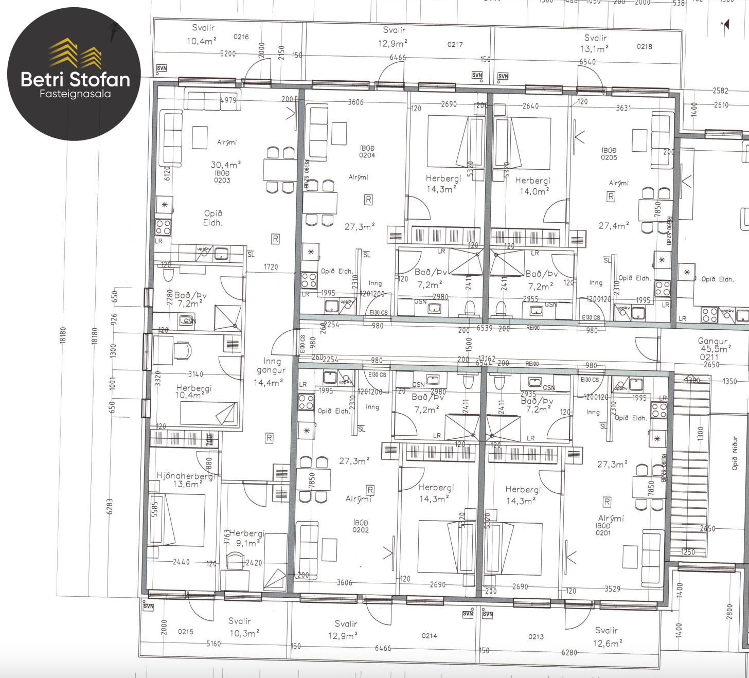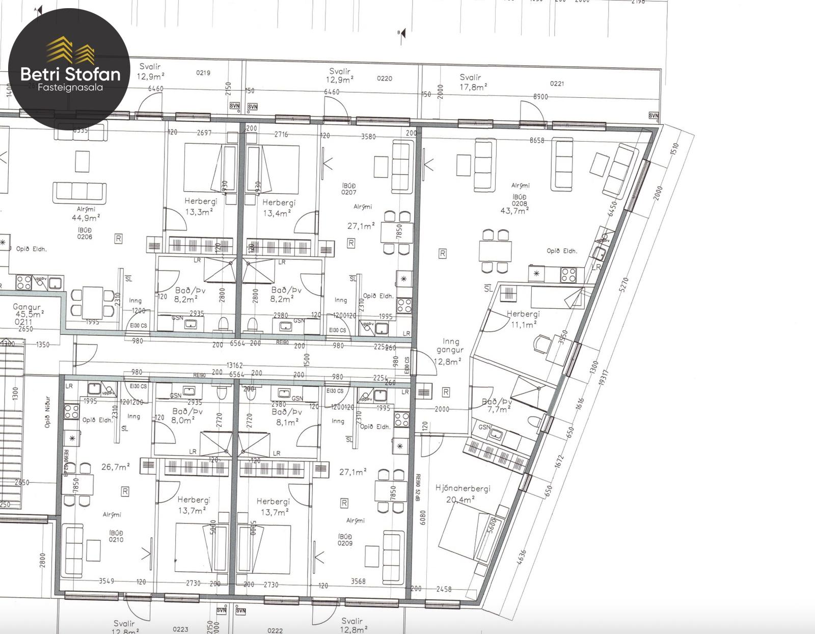 Um er að ræða hægri hluta á efri hæð hússins þar sem inngangur í sameignina er á framhlið hússins. Alls. 5 íbúðir. 3 stk 2ja herbergja íbúðir um 63 fm hver. Eina 3ja herbergja íbúð 81,2 fm og ein 4ra herbergja 122,5 fm íbúð. Hægt er einnig að kaupa 2-3 íbúðir í pakka.