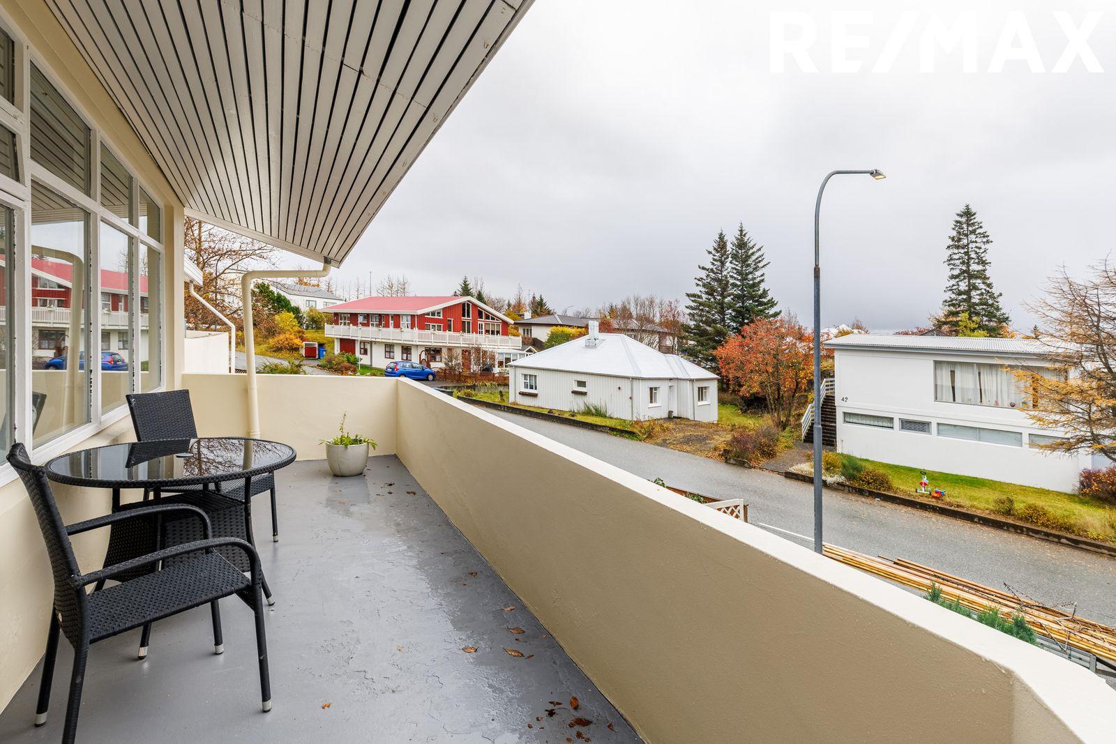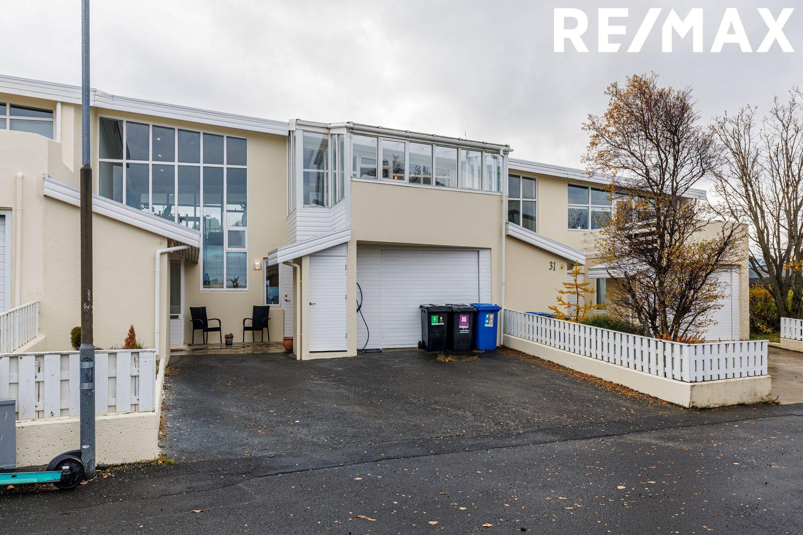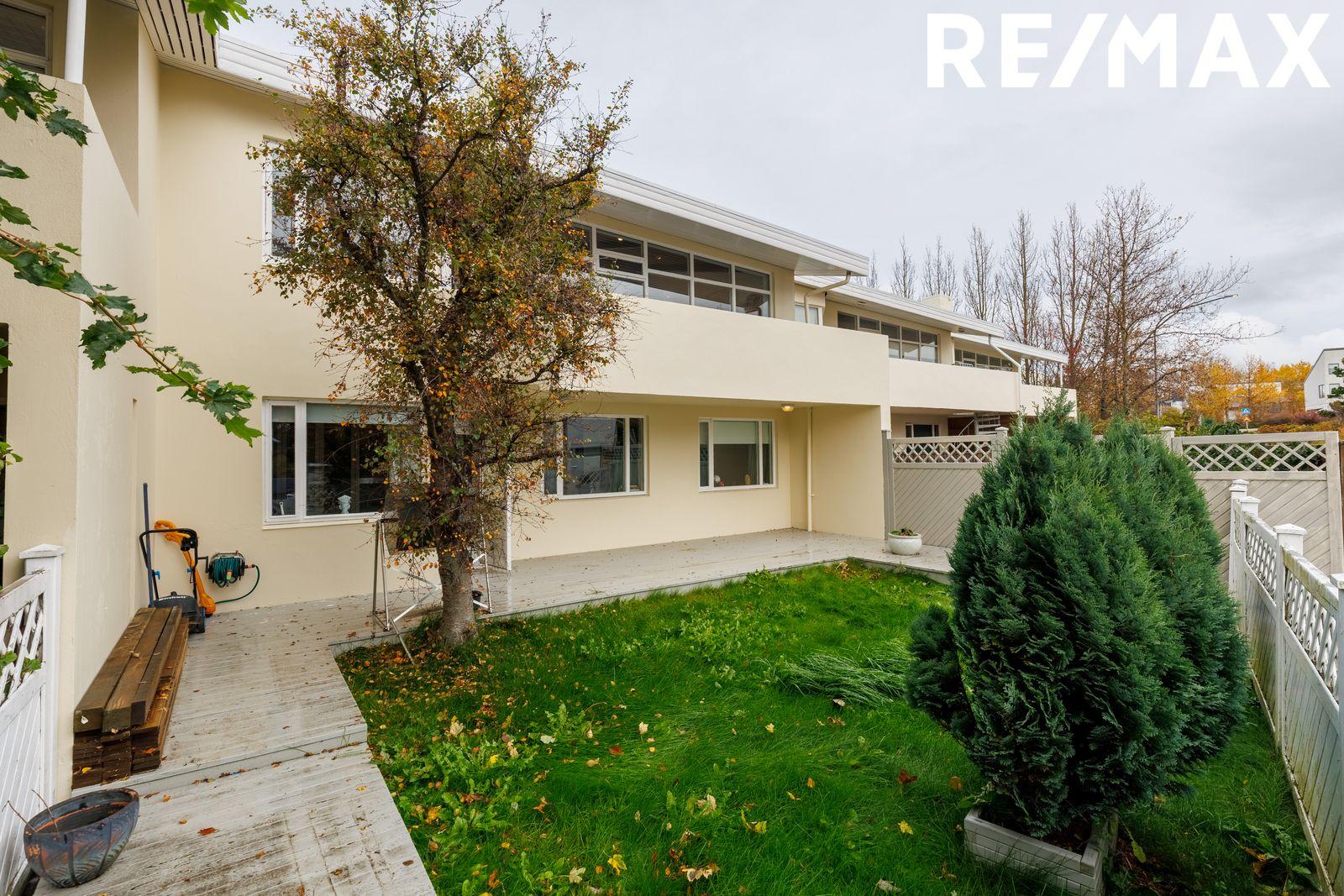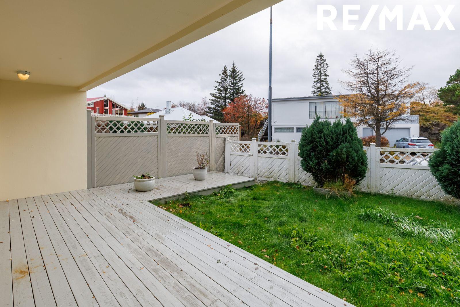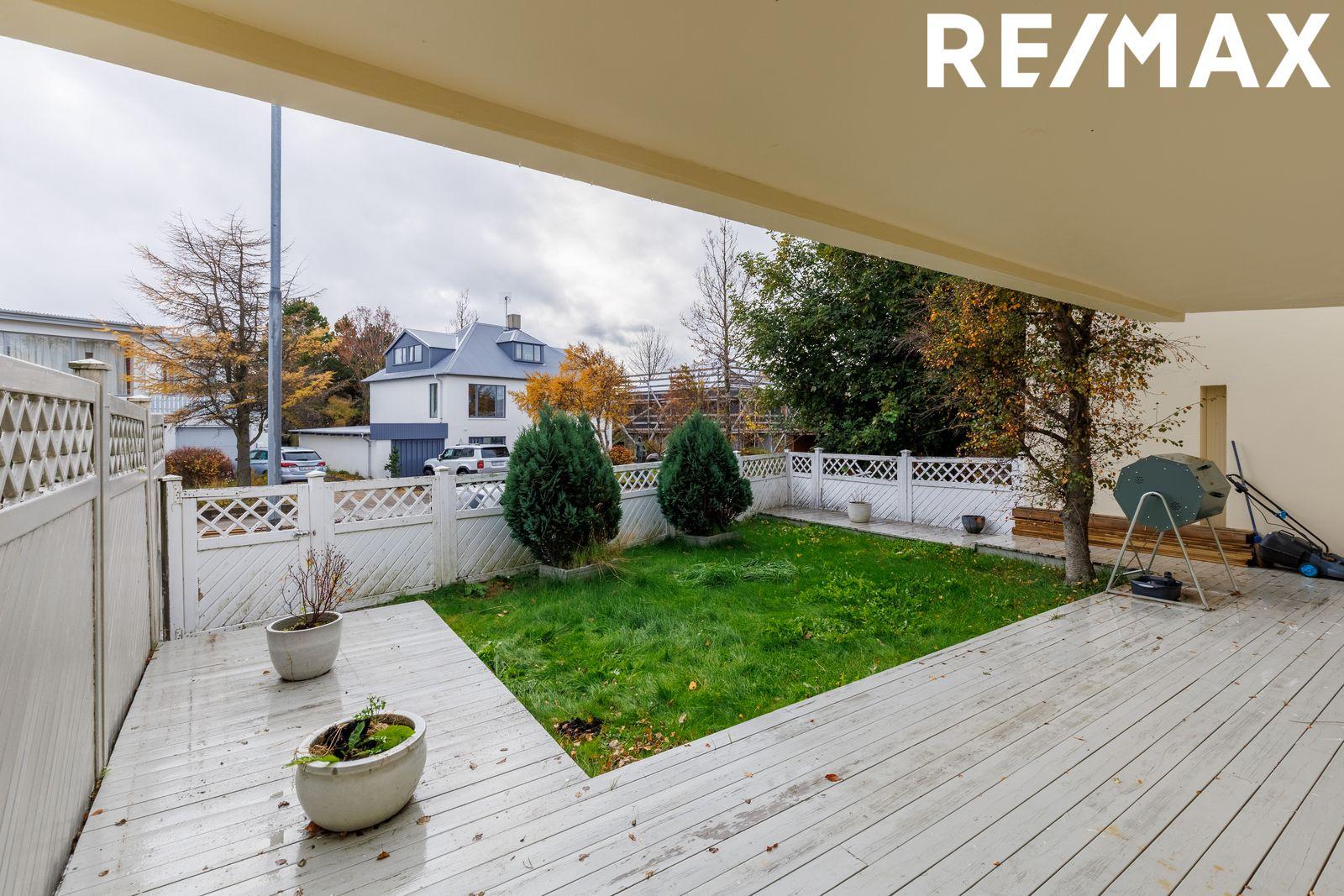 Lóð: Steypt bílaplan með hitalögnum fyrir framan hús og bílskúr. Baklóðin snýr til suðurs og er með timburverönd og hluti hennar er tyrft grasflöt.
