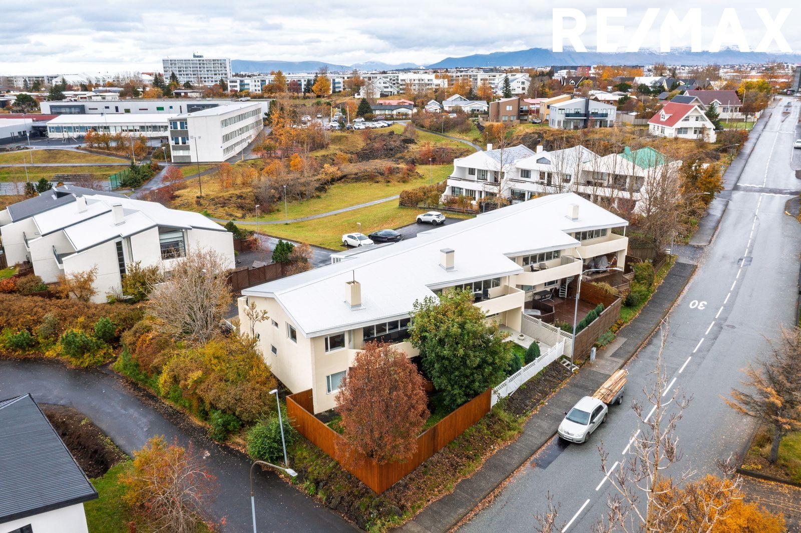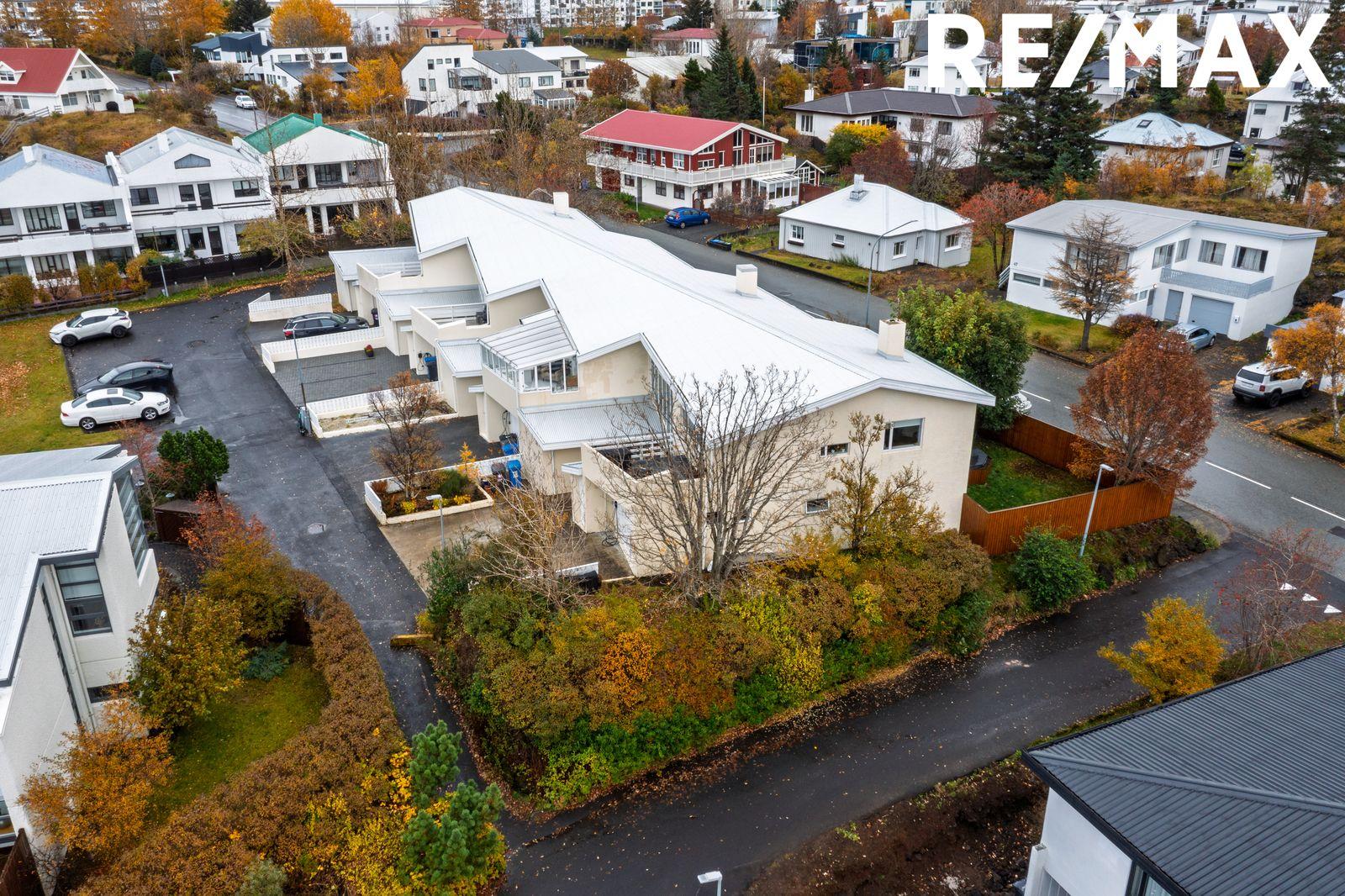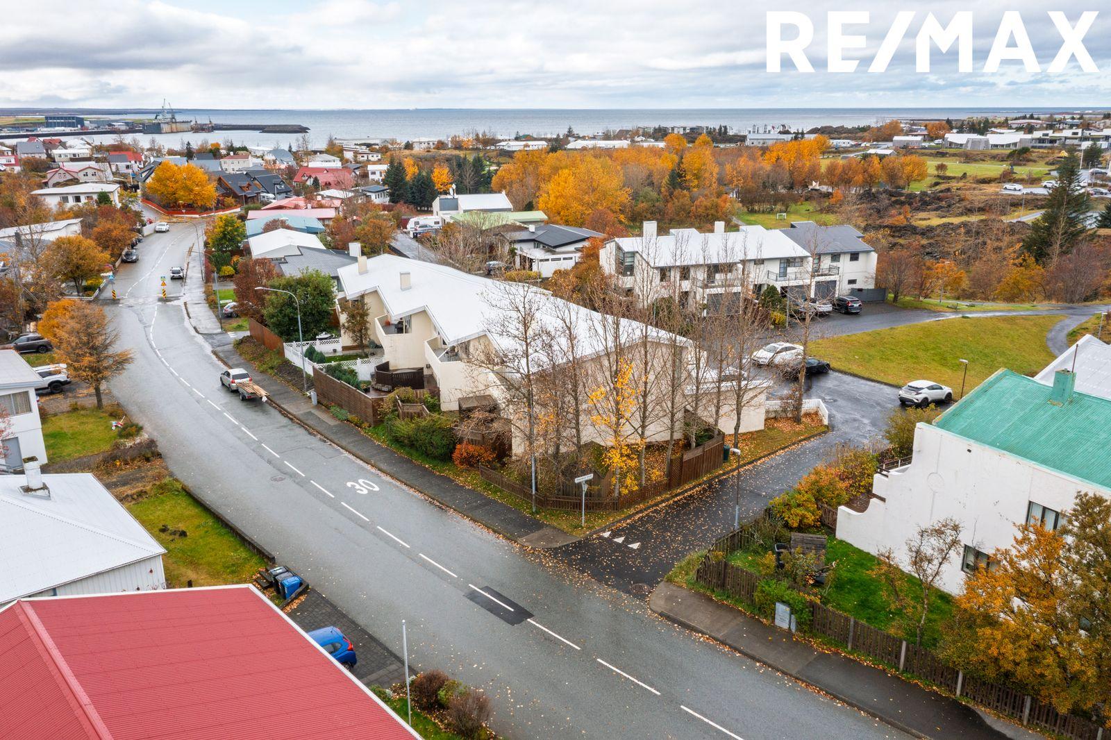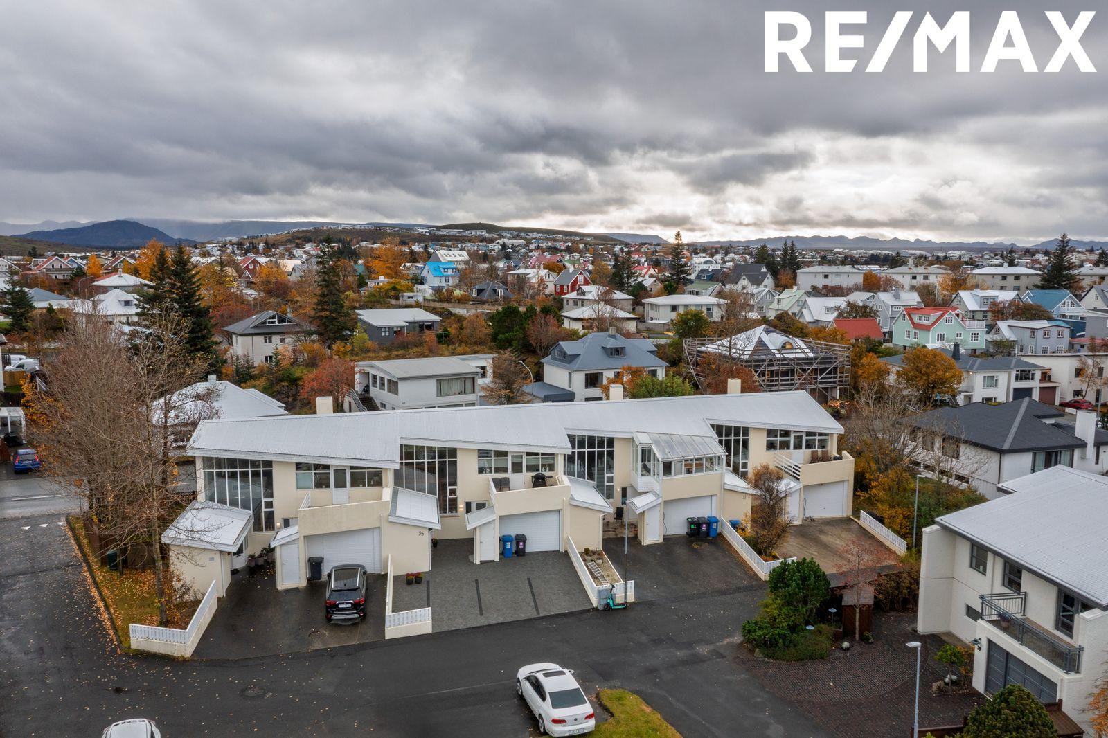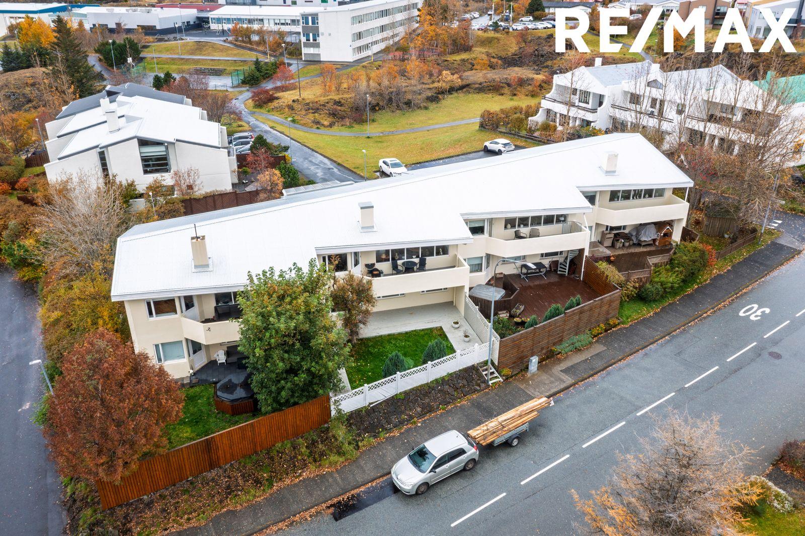 Lóð: Steypt bílaplan með hitalögnum fyrir framan hús og bílskúr. Baklóðin snýr til suðurs og er með timburverönd og hluti hennar er tyrft grasflöt.