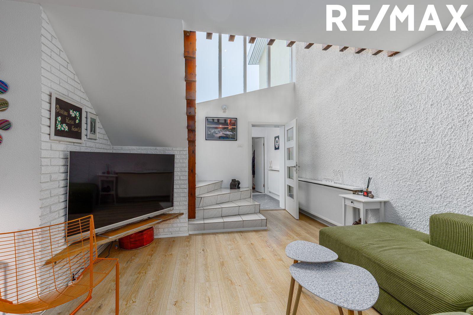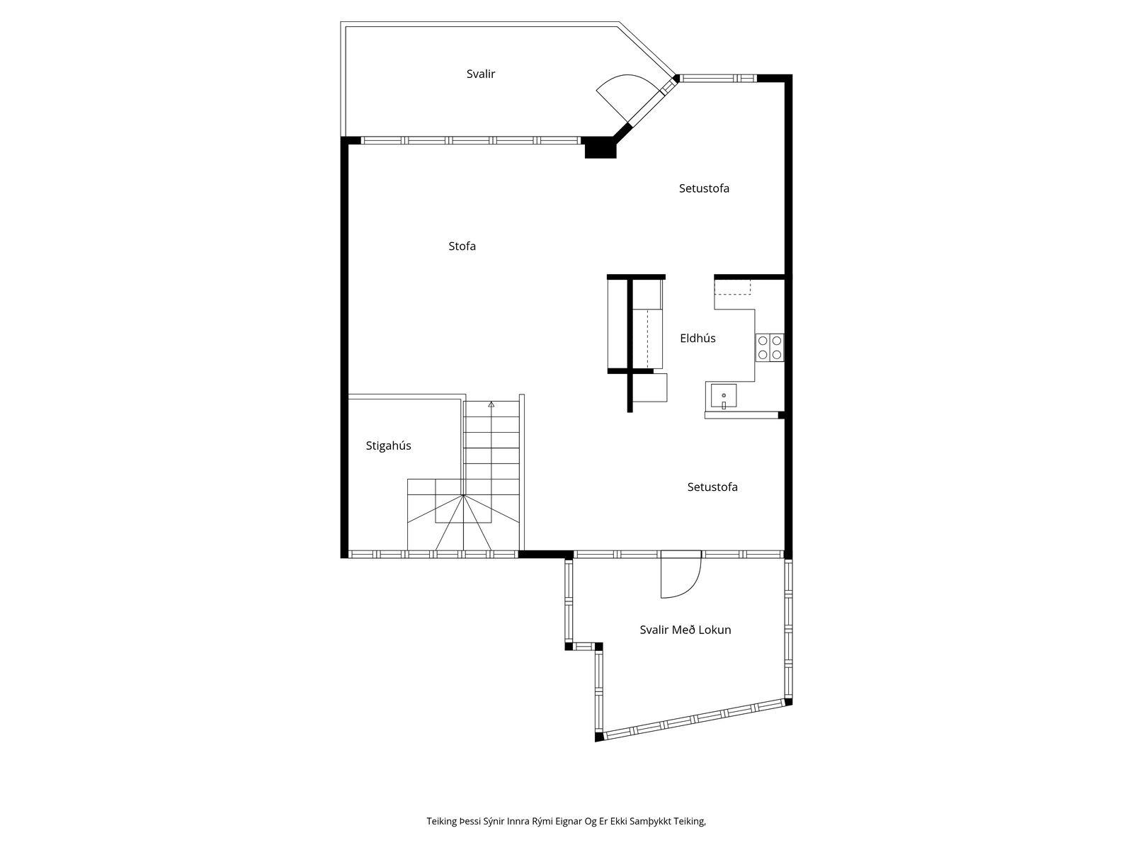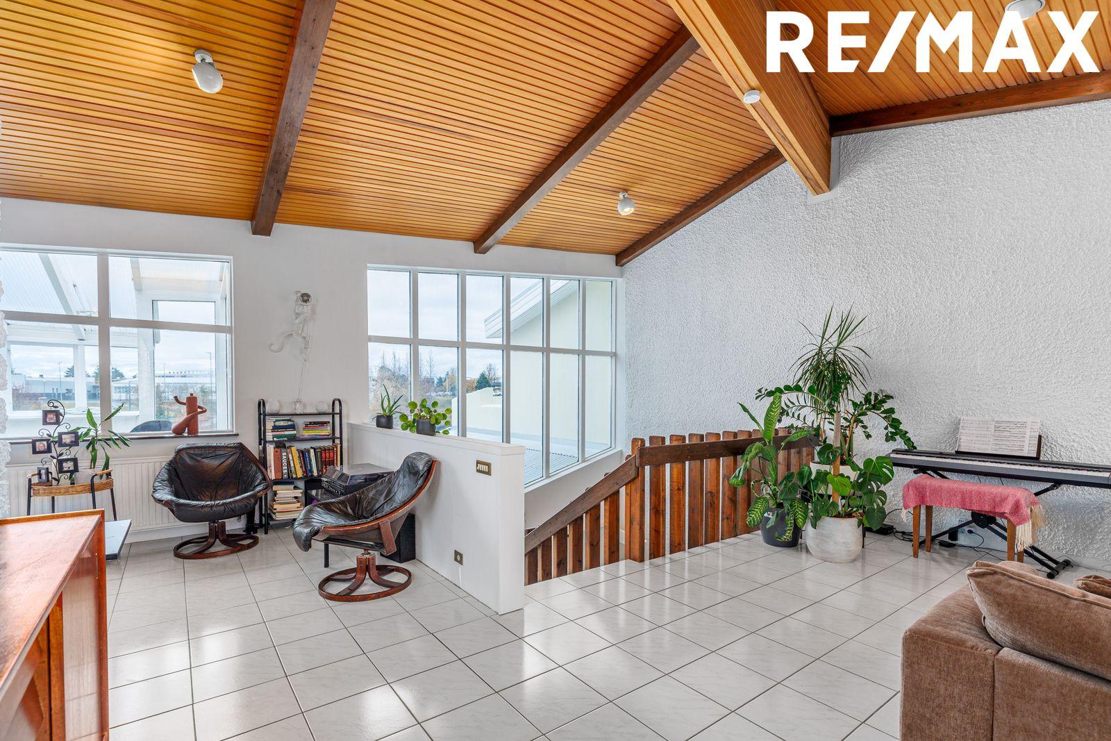 EFRI HÆÐ:Gengið er upp steyptan fallegan stiga með bjálkahandriði upp á efri hæð hússins.Setustofa: Þegar komið er upp stigann er komið upp í stórt opið rými með mikilli lofthæð. Setustofan er sérlega rúmgóð og opin að hluta yfir í borðstofuna og borðkrókinn.