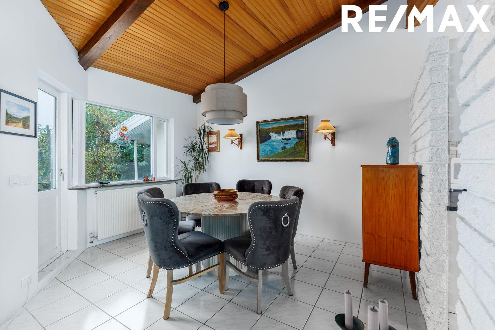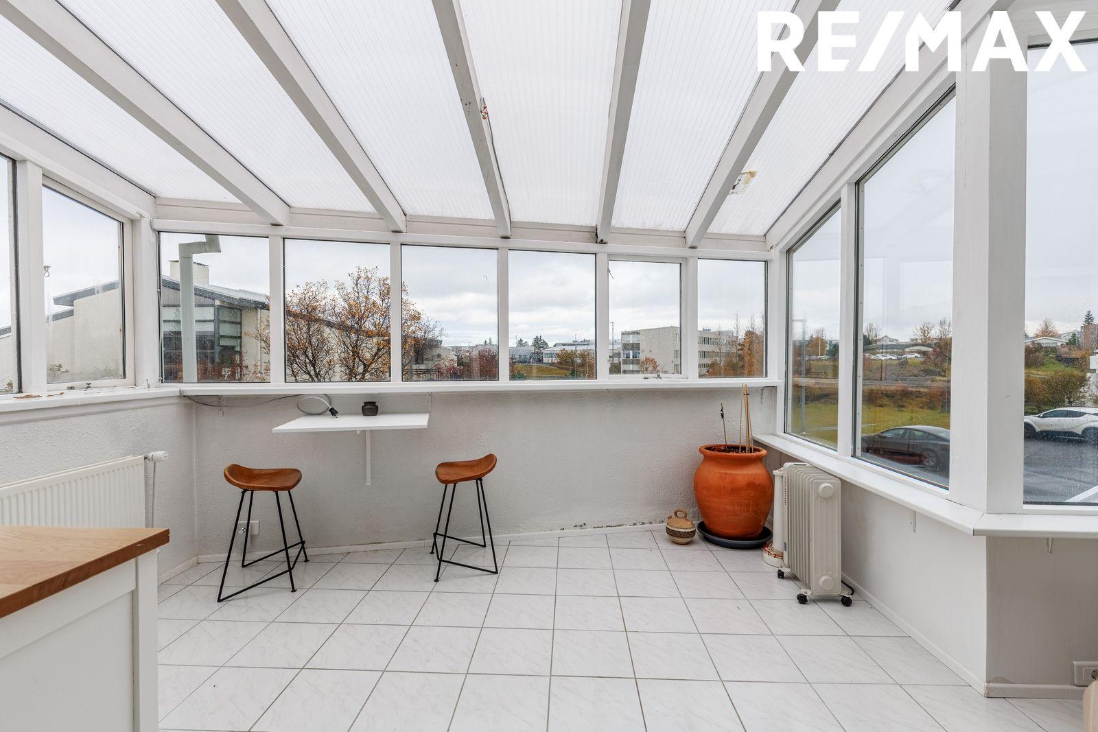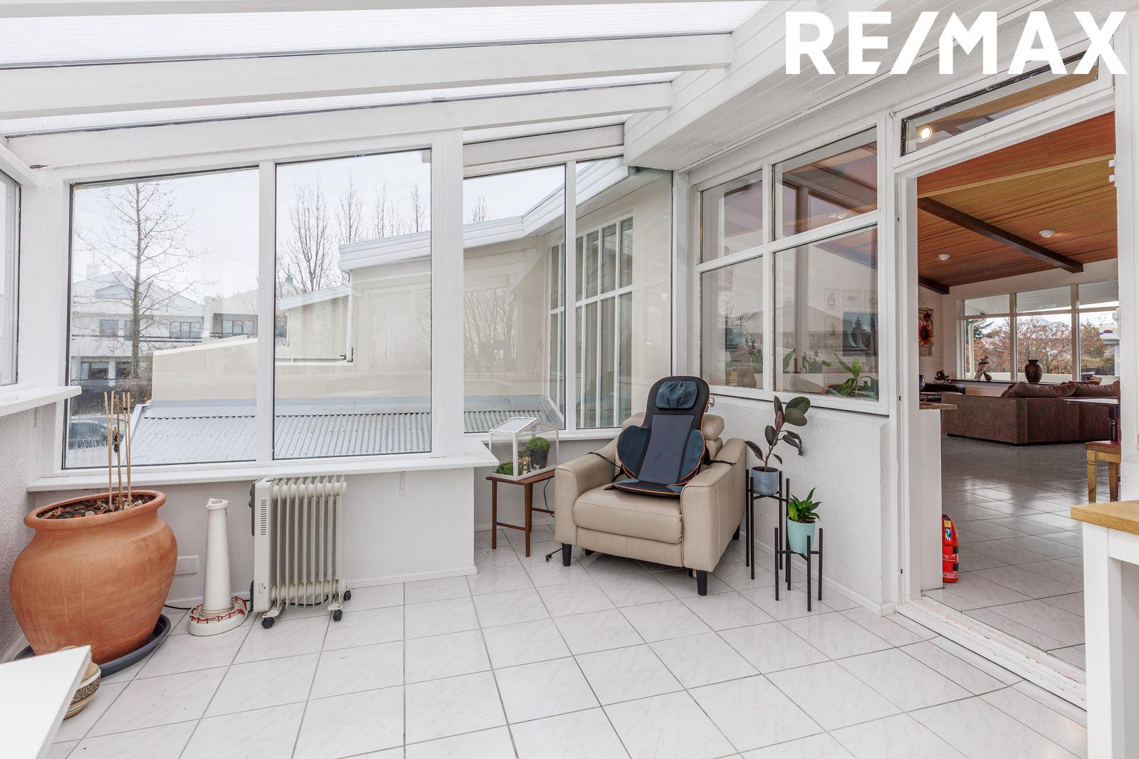 Sólstofa: Stór sólstofa er út frá borðkróknum og stofunni. Sólstofan er um 15-17 fm er til viðbótar við skráða fermetra hússins og var byggð yfir stórar svalir sem liggja yfir bílskúrnum að hluta. Ofn er í rýminu og nýtist það því algjörlega sem viðbótar stofa.