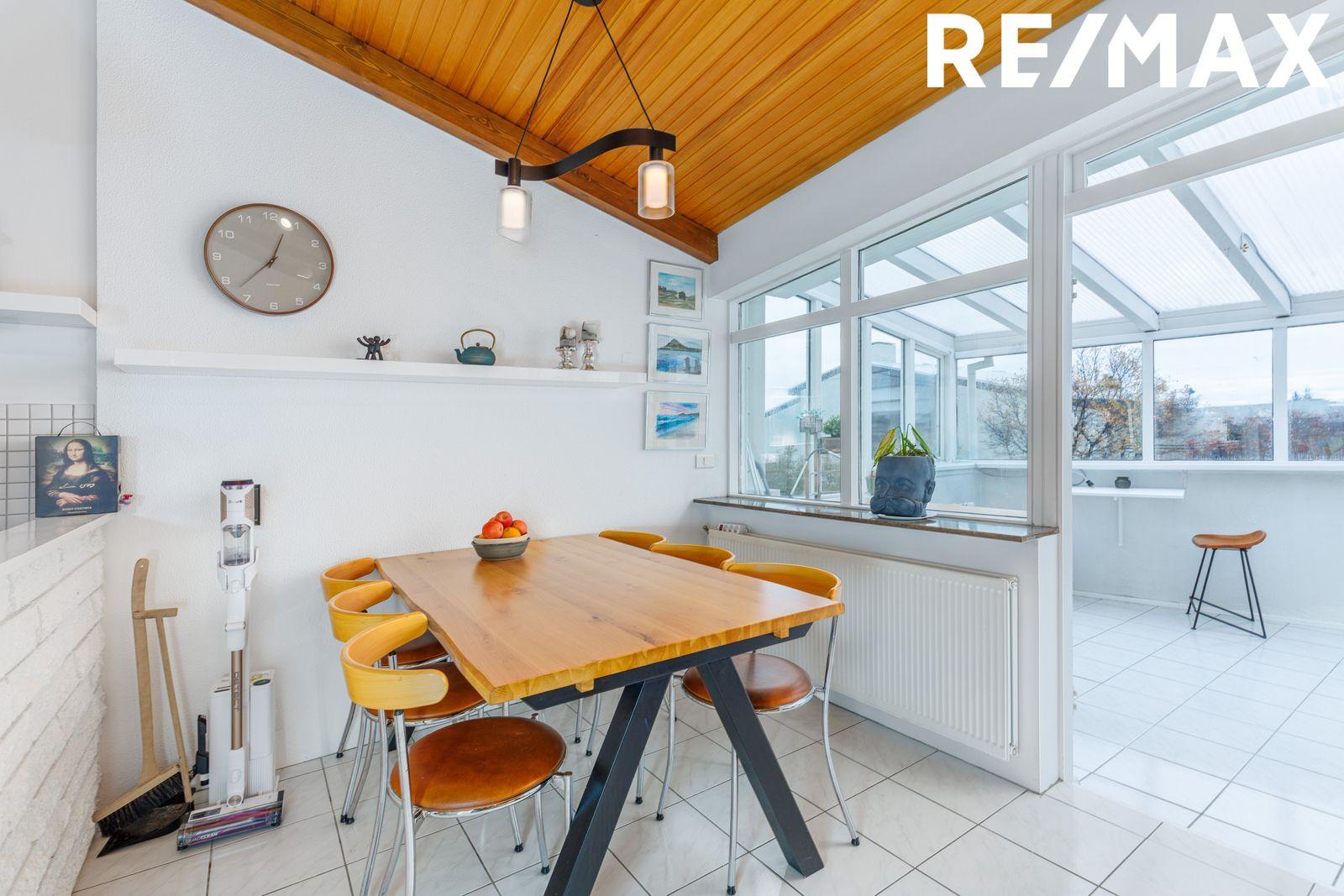 Borðstofa: Borðstofan er rúmgóð við annan enda eldhússins. Útgengt er út á suðursvalir sem snúa upp í hverfið.