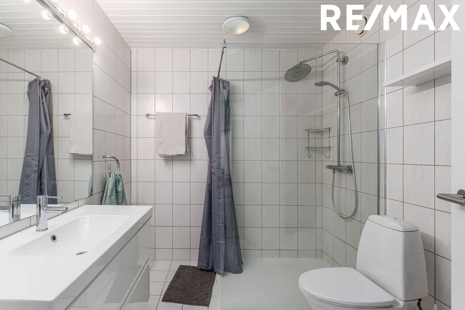 Baðherbergi: Baðherbergið er endurnýjað að mestu með hvítum flísum á gólfi og á veggjum. Stór sturta er beint á gólf með glervegg. Hvít skúffueining er undir vaski og skápur á vegg við hliðina á speglinum. Spegillinn er stór með góðri lýsingu.