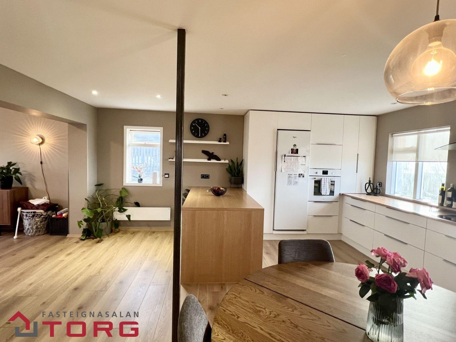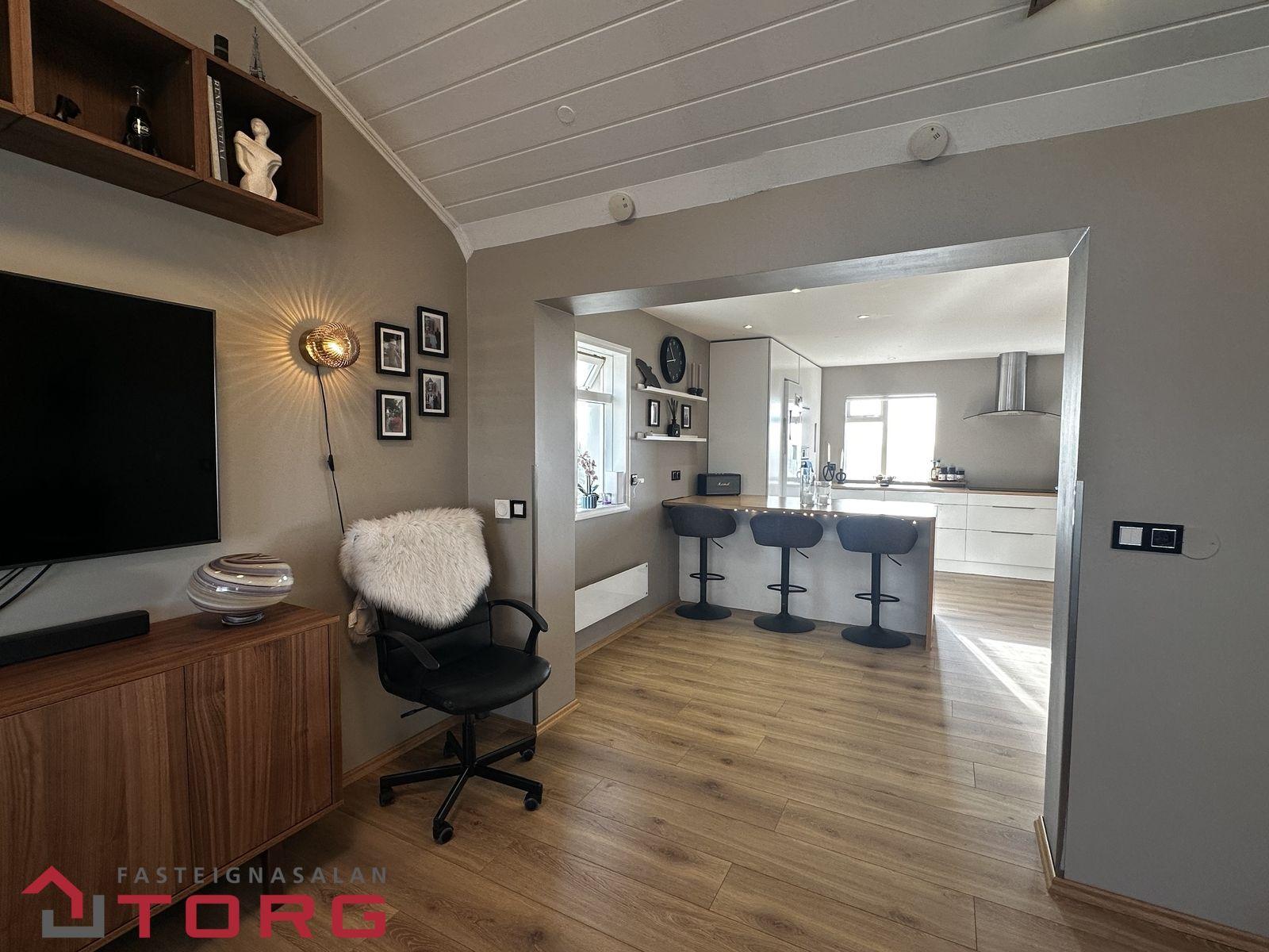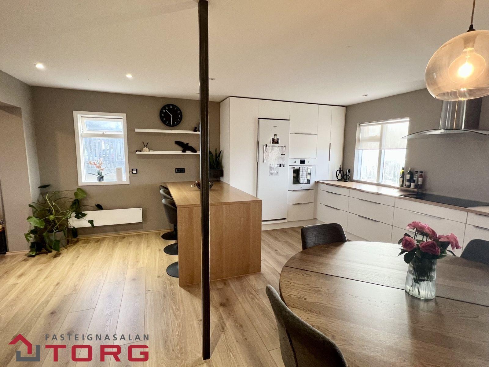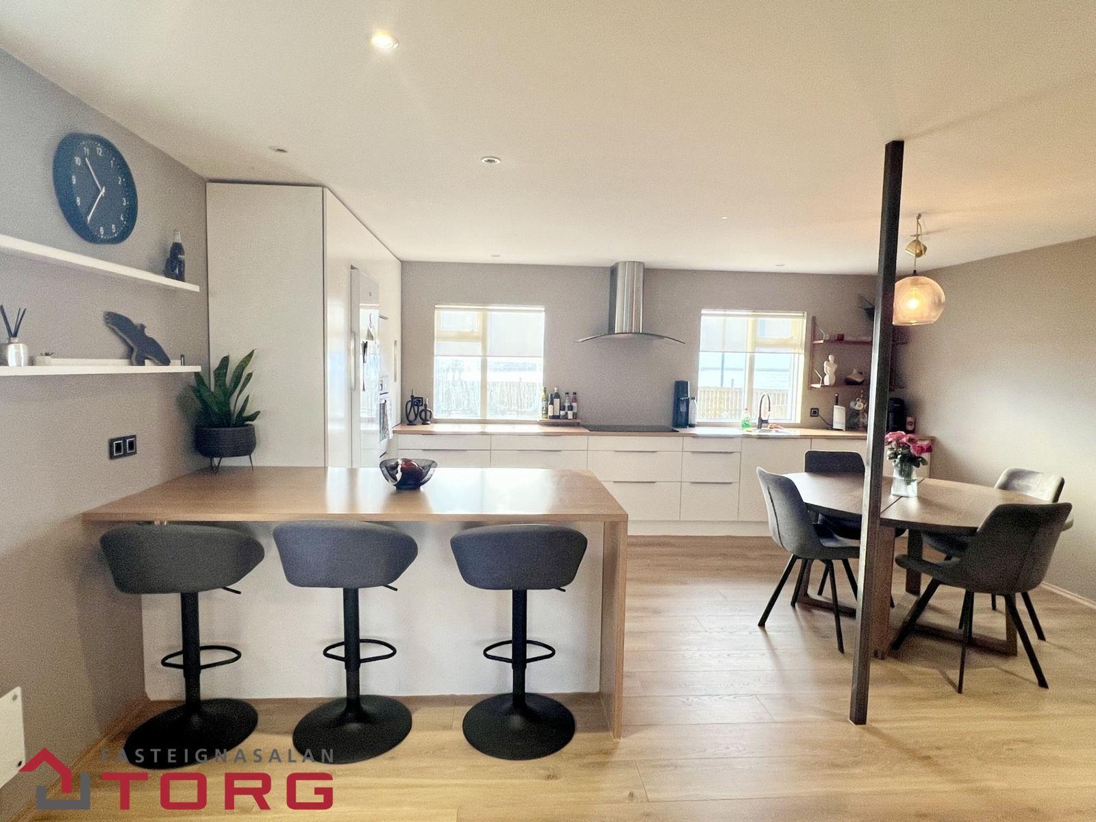 Neðri hæð : Komið er inn í netta forstofu sem er í viðbyggingu sem byggð var 1999. Þar inn af stofa með stórum gluggum til suðurs og vesturs með fallegu útsýni út á fjörðinn og fjalla. Útgengi út á nýbyggða afgirta verönd til suðurs. Frá stofu er komið inn í hol og þaðan inn í mjög rúmgott og bjart eldhús með fallegri hvítri innréttingu frá Brúnás, innbyggð uppþvottavél, parket á gólfi, gólfhiti að hluta í gólfi. Nýstandsett baðherbergi með sturtu, innréttingu með tveim vöskum, handlæðaofn, upphengt salerni, flísar á gólfi og veggjum. Gluggi er á baði. Stofa með gólfhita og parketi á gólfi. Mjög rúmgott þvottahús með máluðu gólfi og glugga.