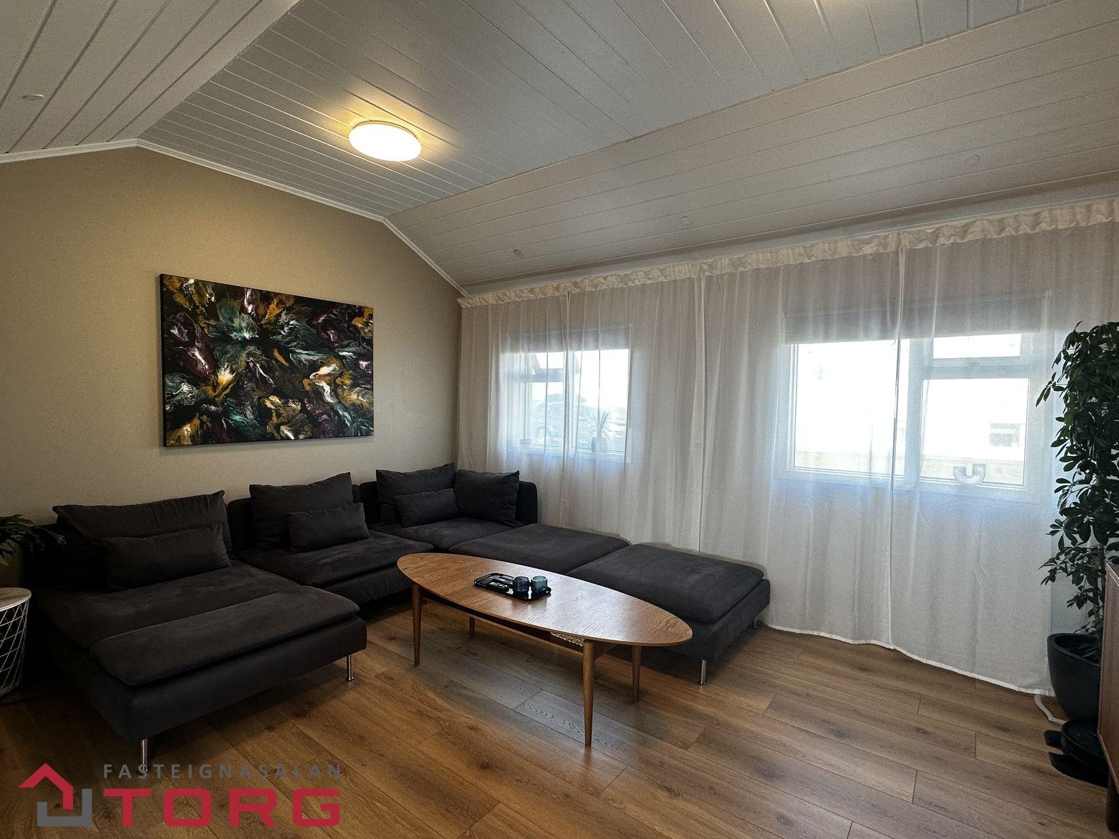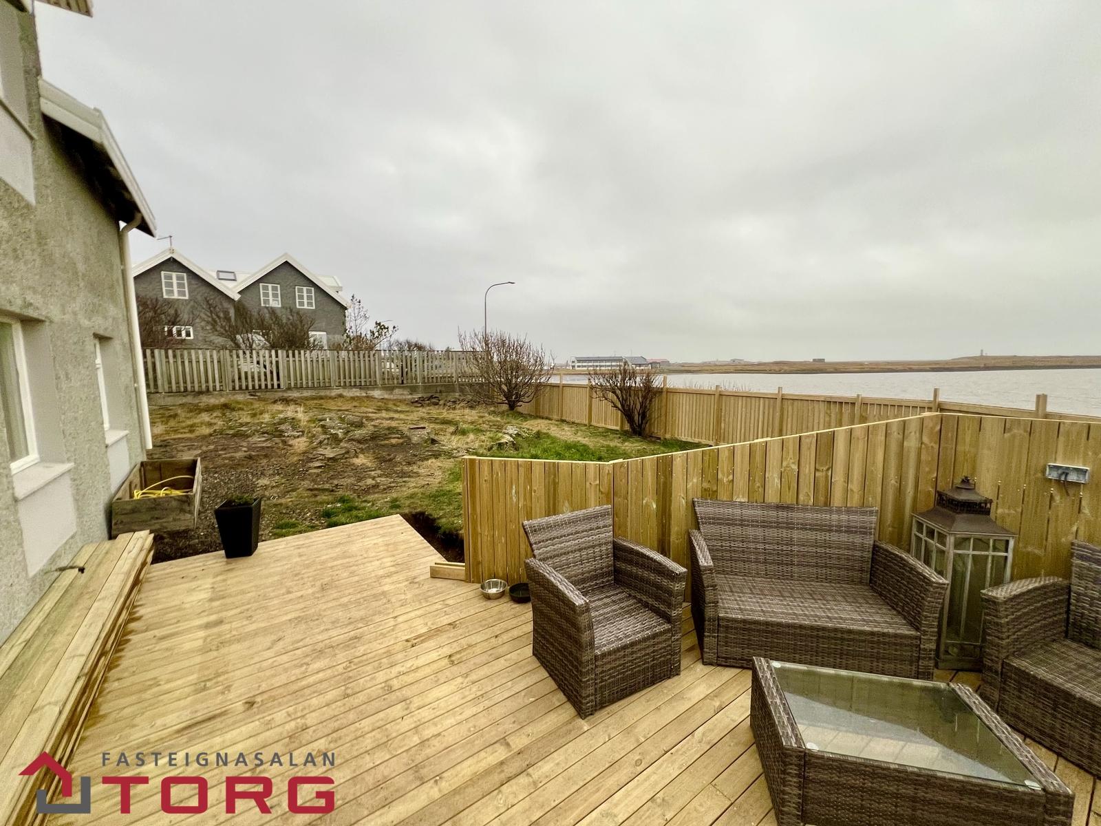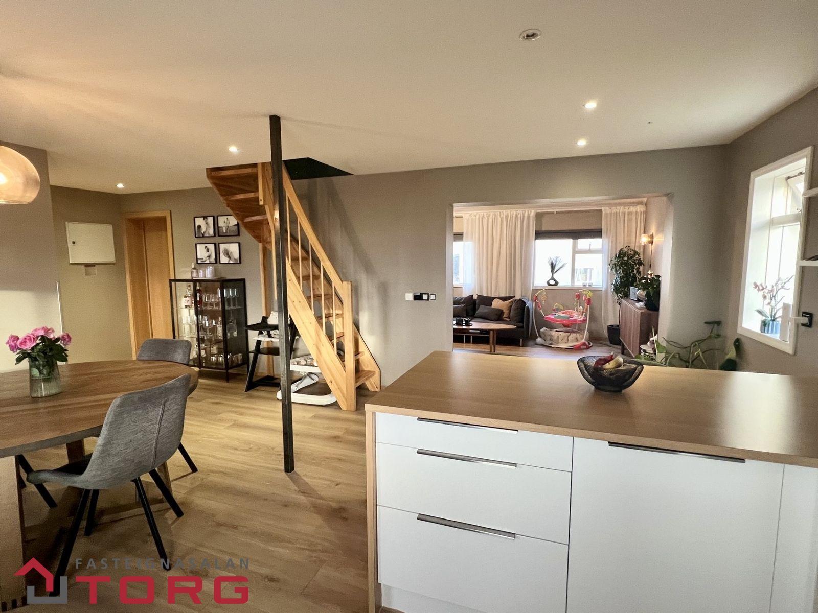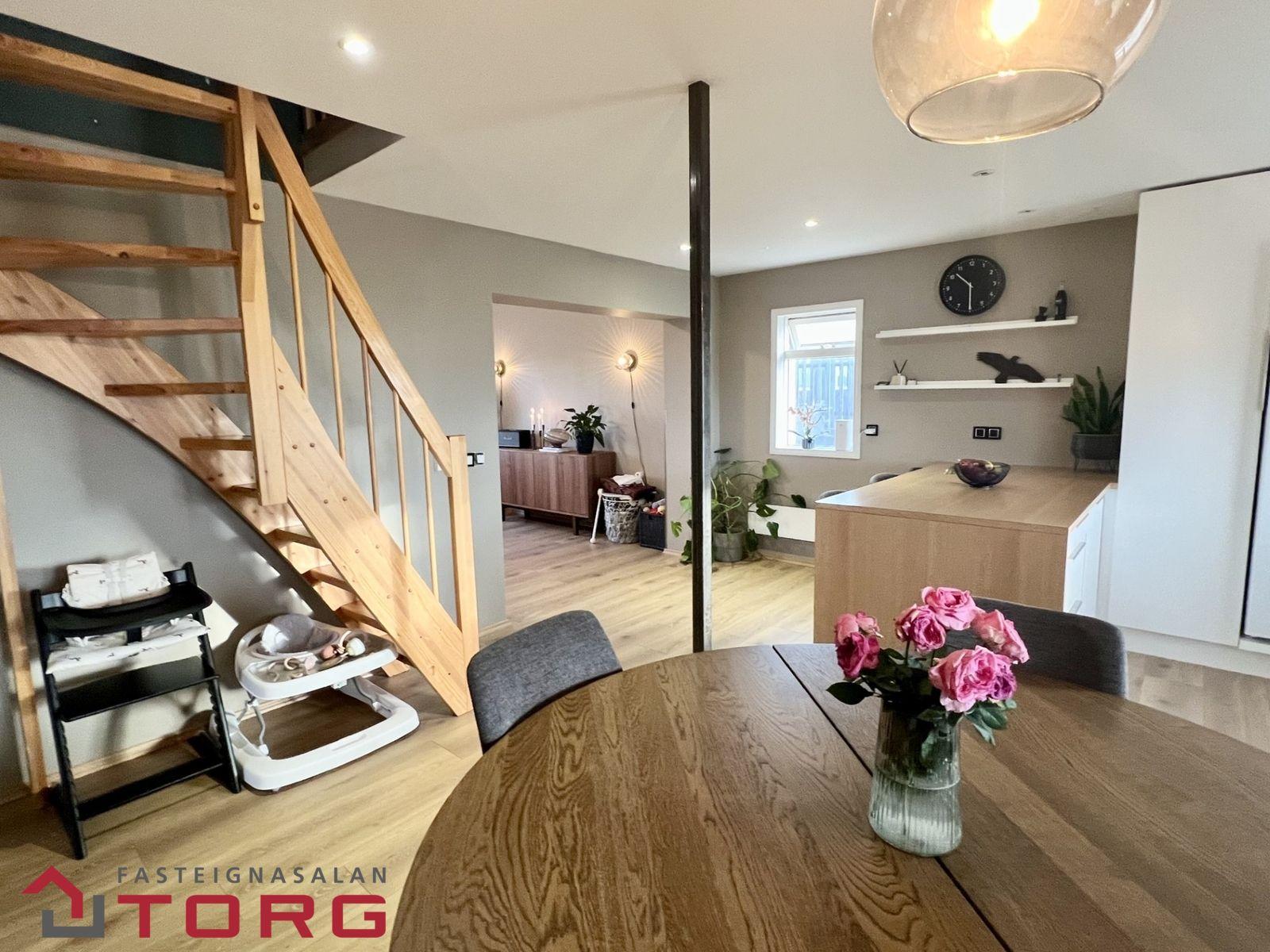Neðri hæð : Komið er inn í netta forstofu sem er í viðbyggingu sem byggð var 1999. Þar inn af stofa með stórum gluggum til suðurs og vesturs með fallegu útsýni út á fjörðinn og fjalla. Útgengi út á nýbyggða afgirta verönd til suðurs. Frá stofu er komið inn í hol og þaðan inn í mjög rúmgott og bjart eldhús með fallegri hvítri innréttingu frá Brúnás, innbyggð uppþvottavél, parket á gólfi, gólfhiti að hluta í gólfi. Nýstandsett baðherbergi með sturtu, innréttingu með tveim vöskum, handlæðaofn, upphengt salerni, flísar á gólfi og veggjum. Gluggi er á baði. Stofa með gólfhita og parketi á gólfi. Mjög rúmgott þvottahús með máluðu gólfi og glugga.