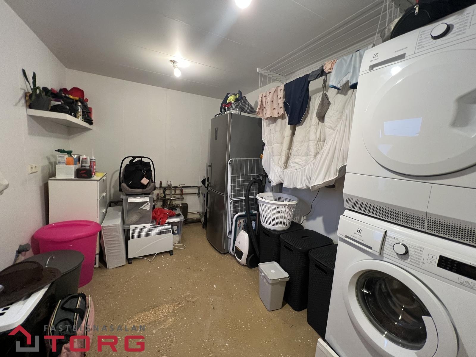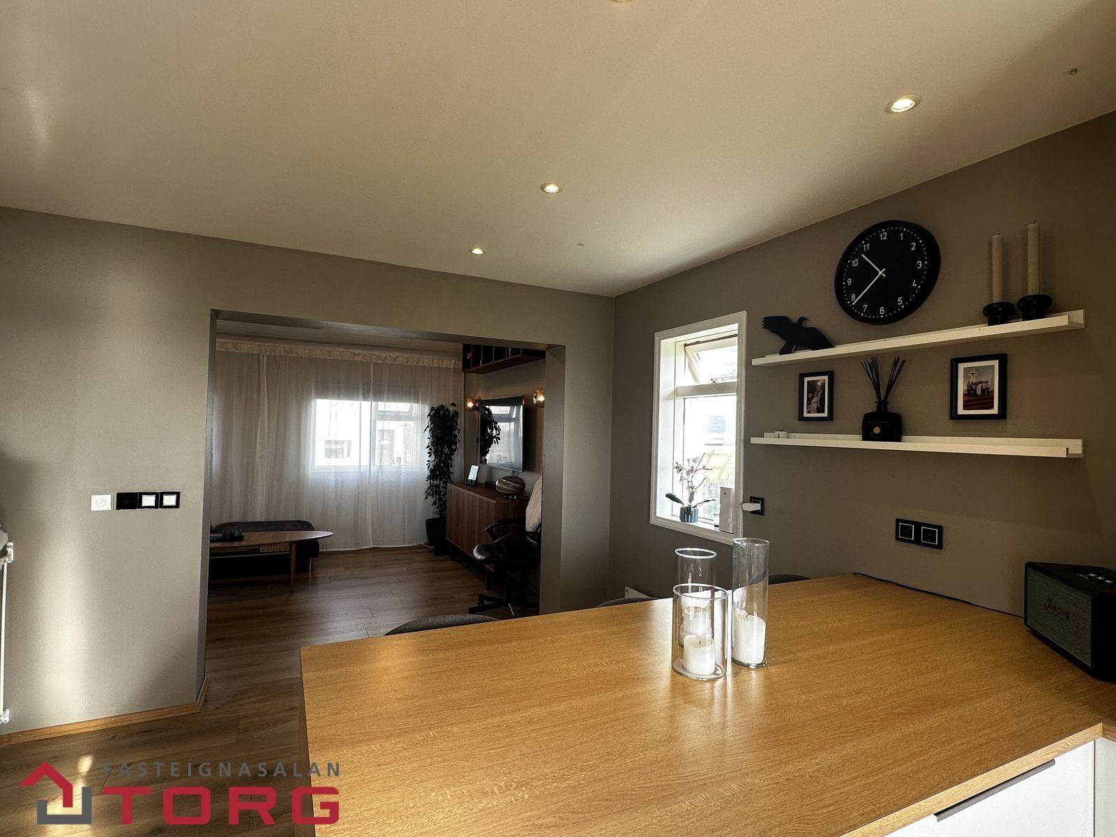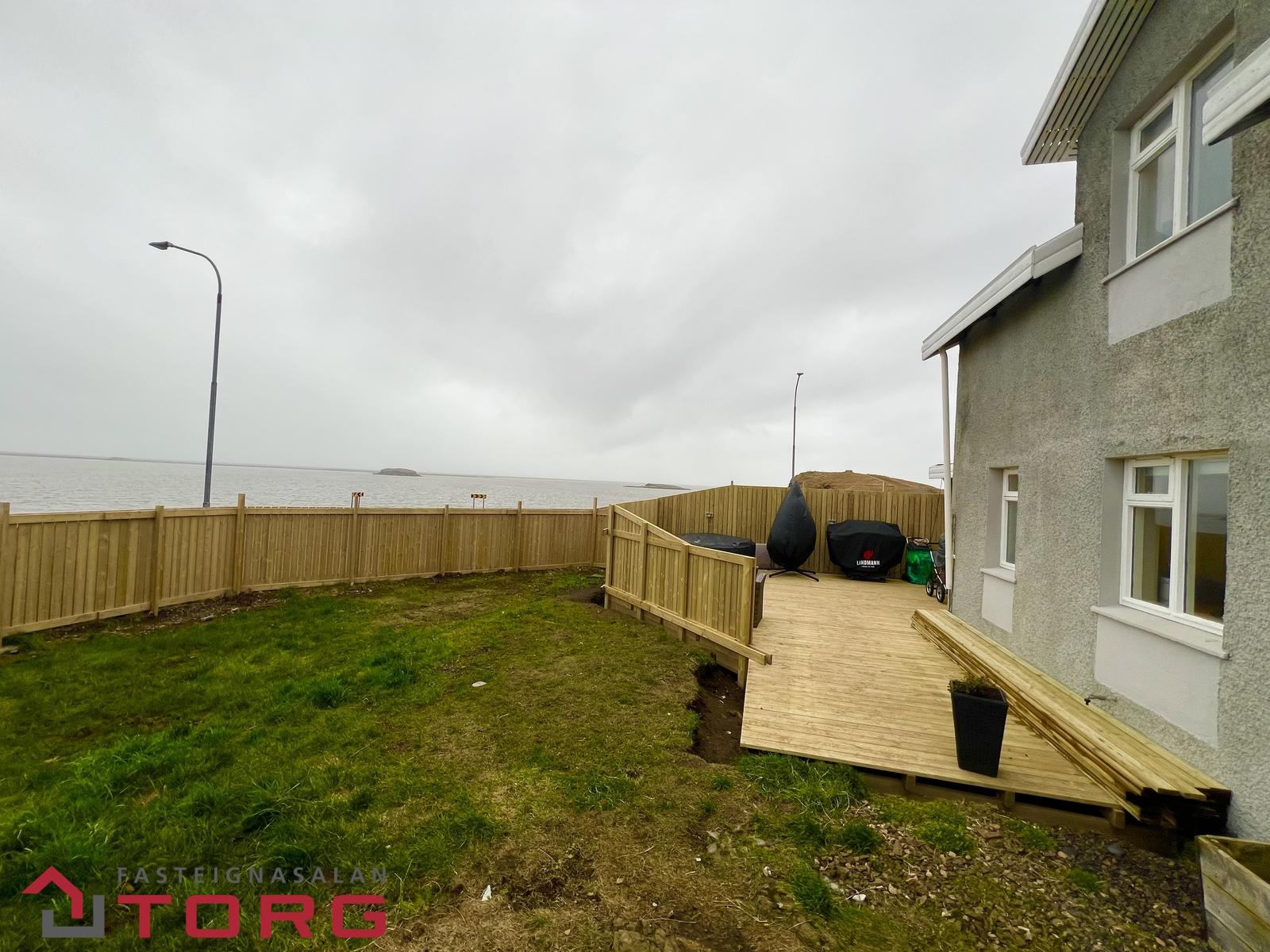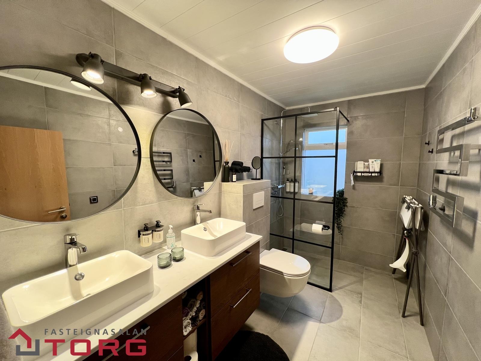 Neðri hæð : Komið er inn í netta forstofu sem er í viðbyggingu sem byggð var 1999. Þar inn af stofa með stórum gluggum til suðurs og vesturs með fallegu útsýni út á fjörðinn og fjalla. Útgengi út á nýbyggða afgirta verönd til suðurs. Frá stofu er komið inn í hol og þaðan inn í mjög rúmgott og bjart eldhús með fallegri hvítri innréttingu frá Brúnás, innbyggð uppþvottavél, parket á gólfi, gólfhiti að hluta í gólfi. Nýstandsett baðherbergi með sturtu, innréttingu með tveim vöskum, handlæðaofn, upphengt salerni, flísar á gólfi og veggjum. Gluggi er á baði. Stofa með gólfhita og parketi á gólfi. Mjög rúmgott þvottahús með máluðu gólfi og glugga.