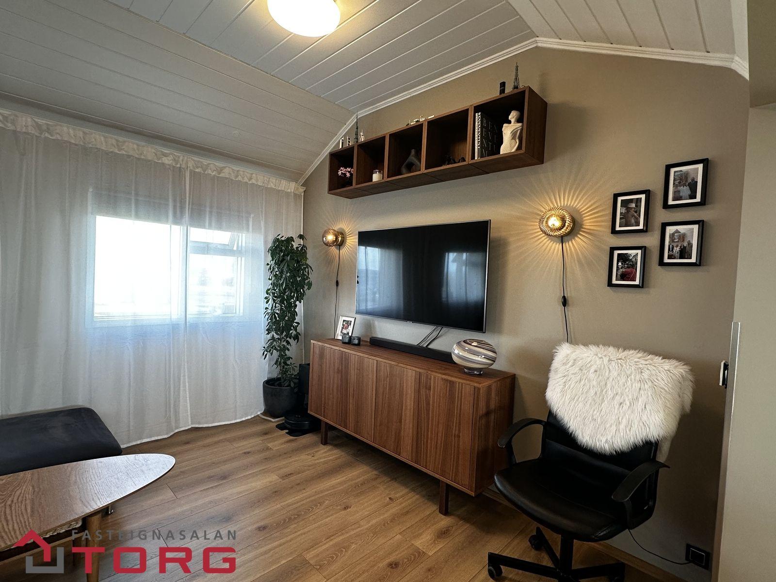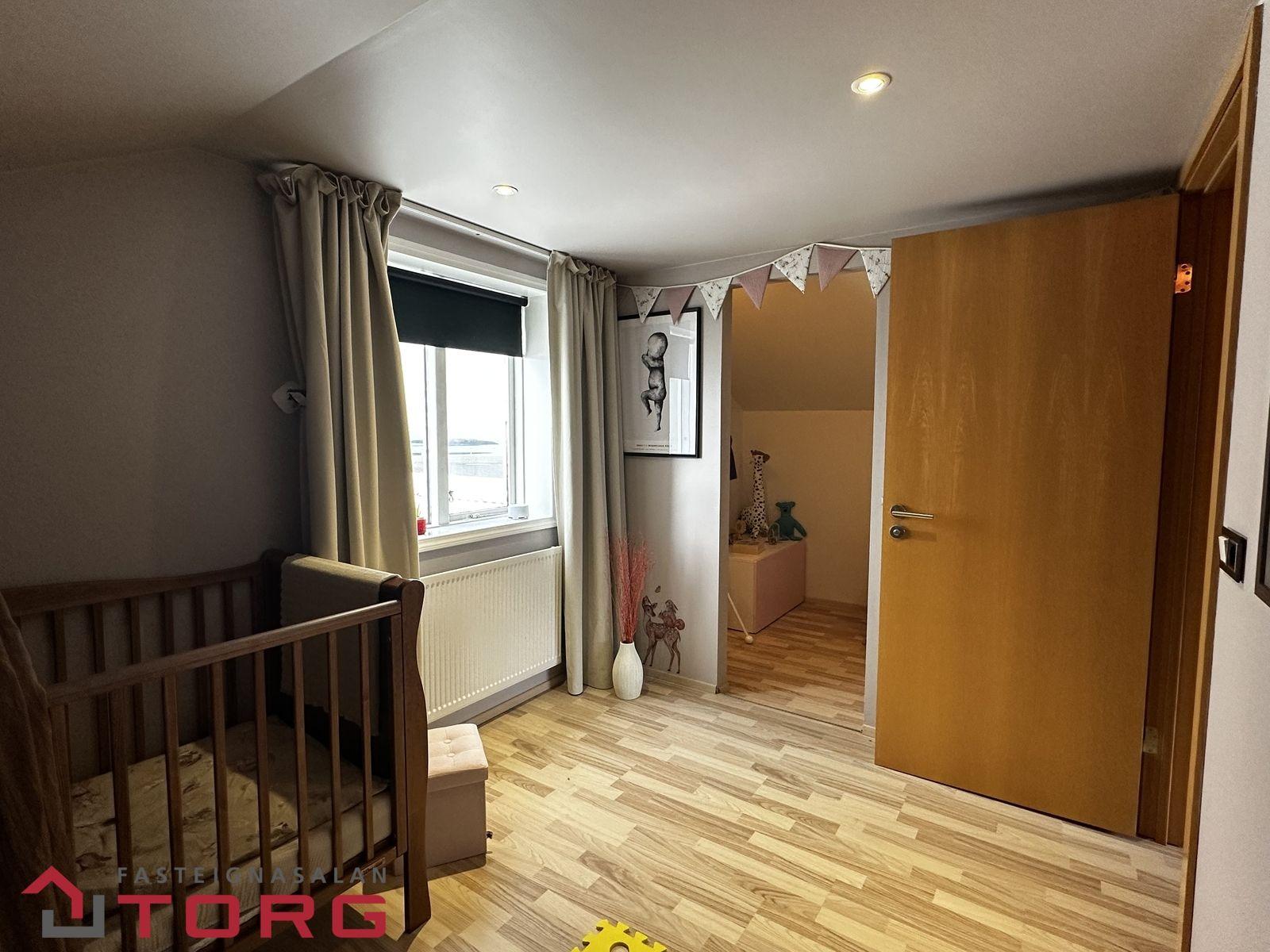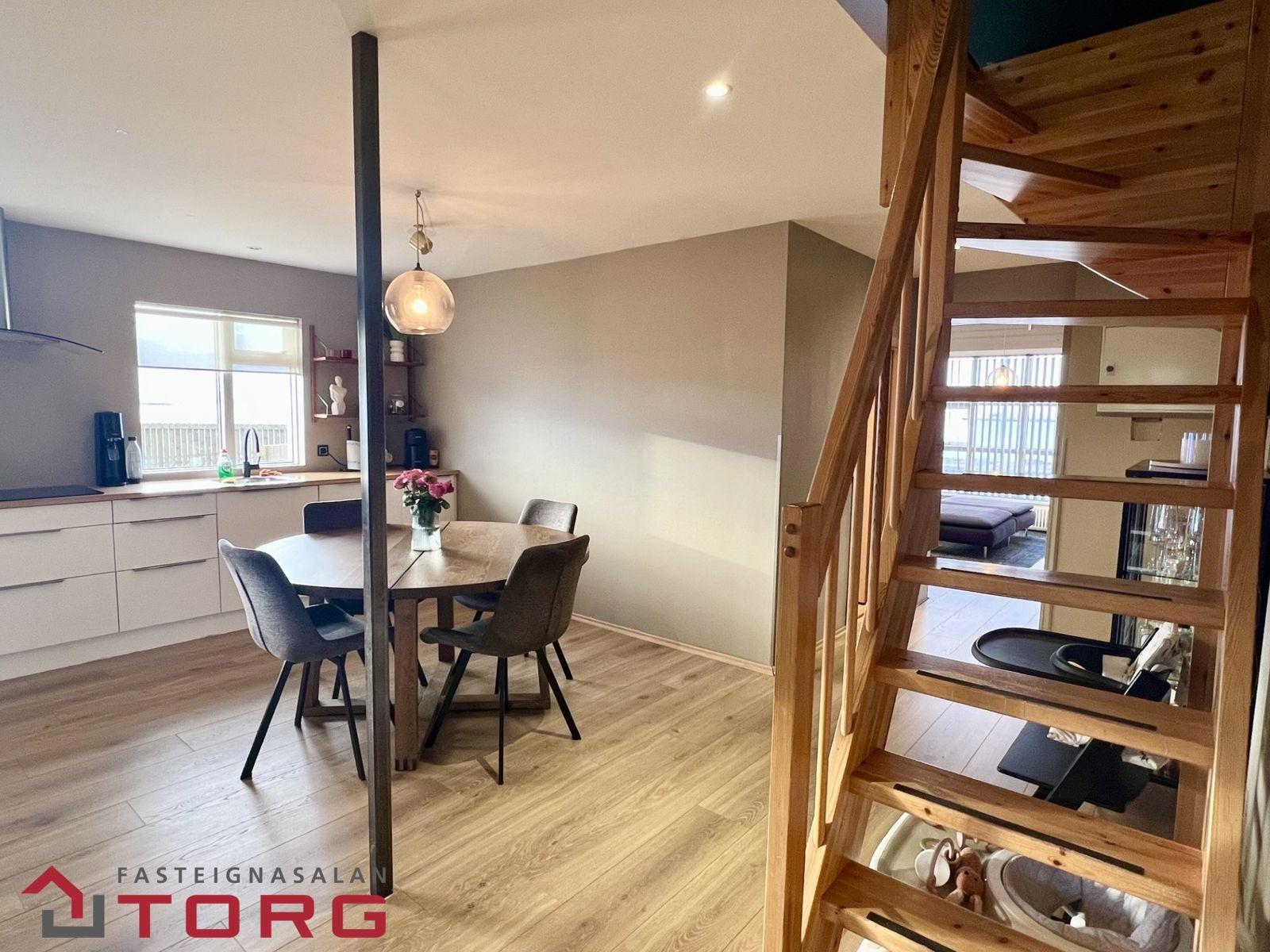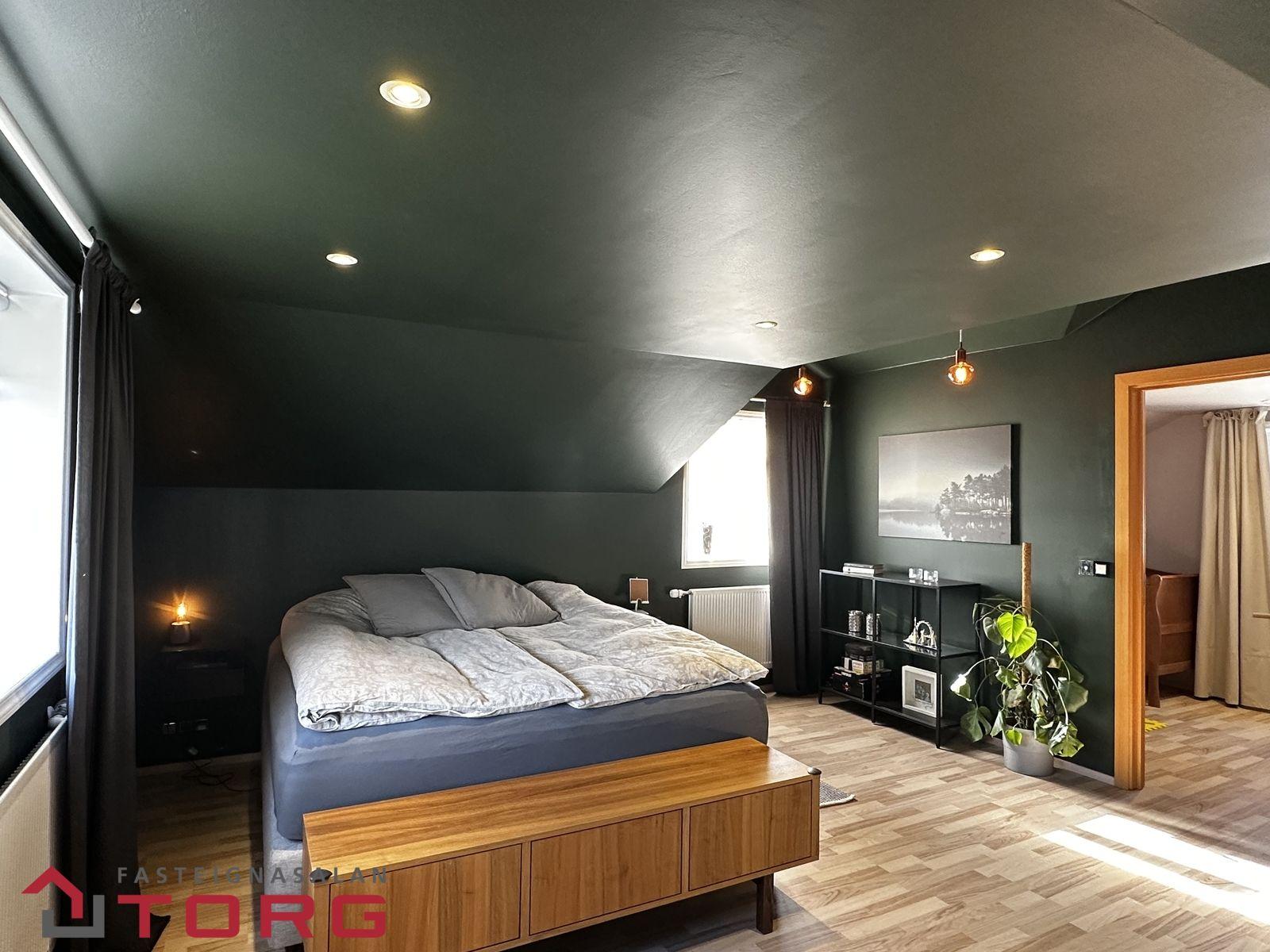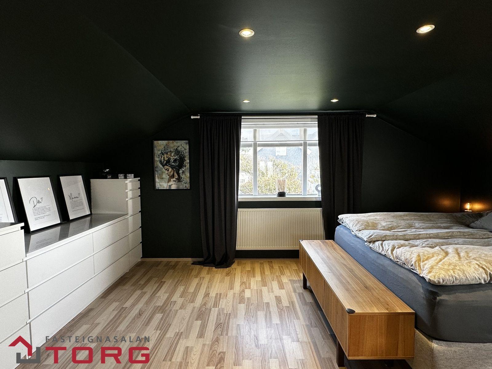 Efri hæð: Frá eldhúsi er timbur stigi upp á efri hæðina. Komið er upp í rúmgott opið hjónaherbergi með gluggum á tvo vegu, parket á gólfi. Lítið mál að loka þessu herbergi af. Gott svefnherbergi með fataherbergi innaf, parket á gólfi.
